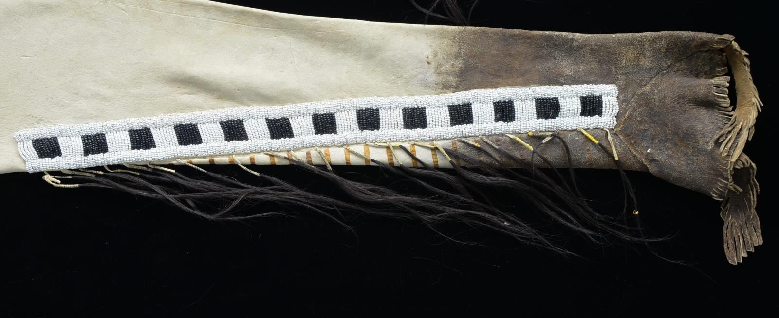 BUFFALO HIDE LEGGINGS. 45" Softly tanned buffalo hide, sinew-sewn leggings w/ 24.5" x 2" beaded hide strips of black & white pony beads. 10" Tassels of black hair fringe hangs along edges of strips; dark pigment applied lower 12". Nineteenth century. CONDITION: fine overall, complete, supple, losses of yellow pigment to porcupine quill wrap of hair fringe. (02-14572/JS). $6,000-8,000.