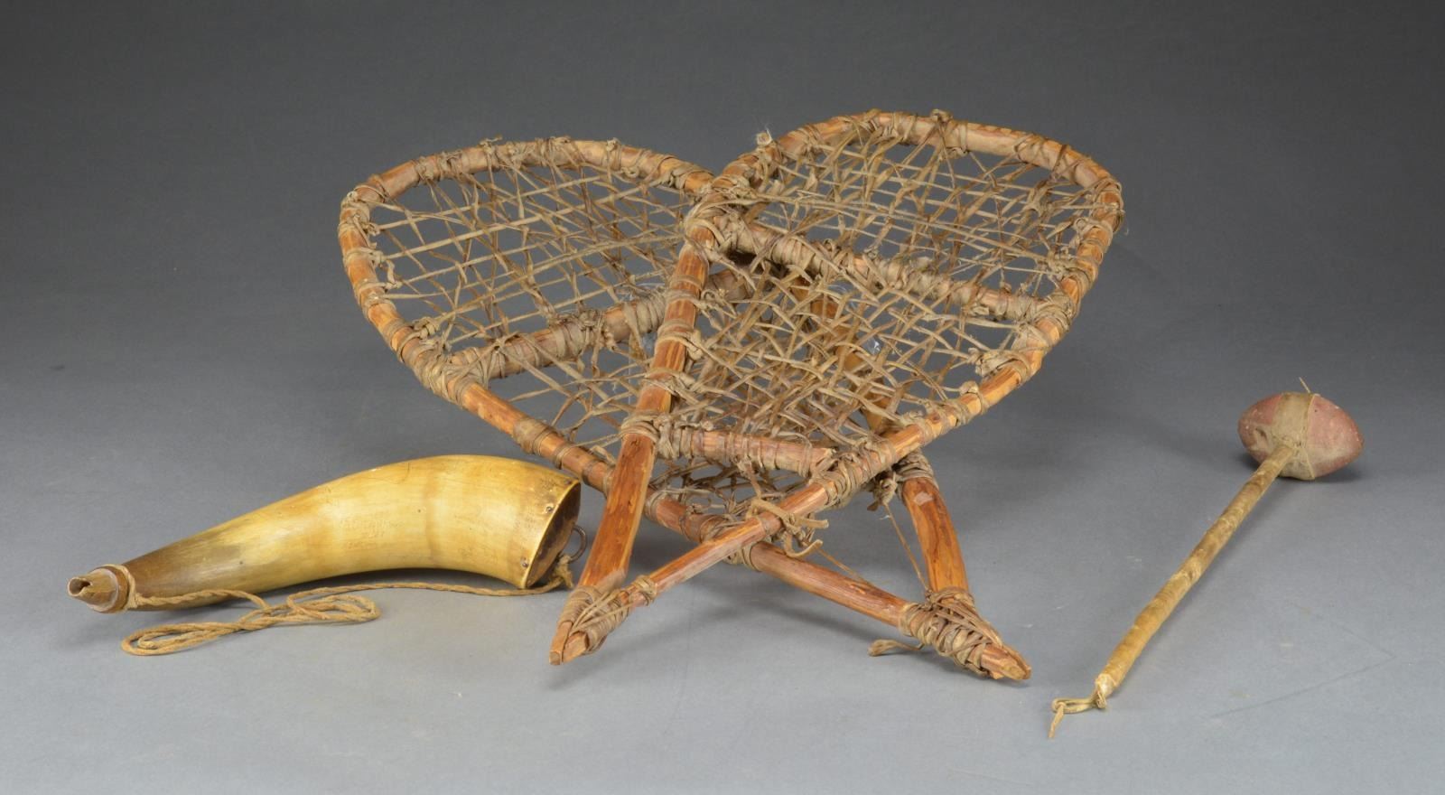 A pair of 19th century Native American small snowshoes possibly for a woman. Overall length is approx. 28". Construction is of bent saplings & rawhide. / A stone headed war club measuring approx. 20 1/2" in length w/ a rawhide covered shaft & strap around the red colored & shaped stone head. / An original 10 1/2" powder horn that has been engraved in the 20th century to artificially enhance its value. CONDITION: snowshoes are generally solid & show expected wear. Club has light overall wear w/ some scratches & gouges to the head. Powder horn is quite solid w/ some worm damage. (02-13704/BF). $300-500.