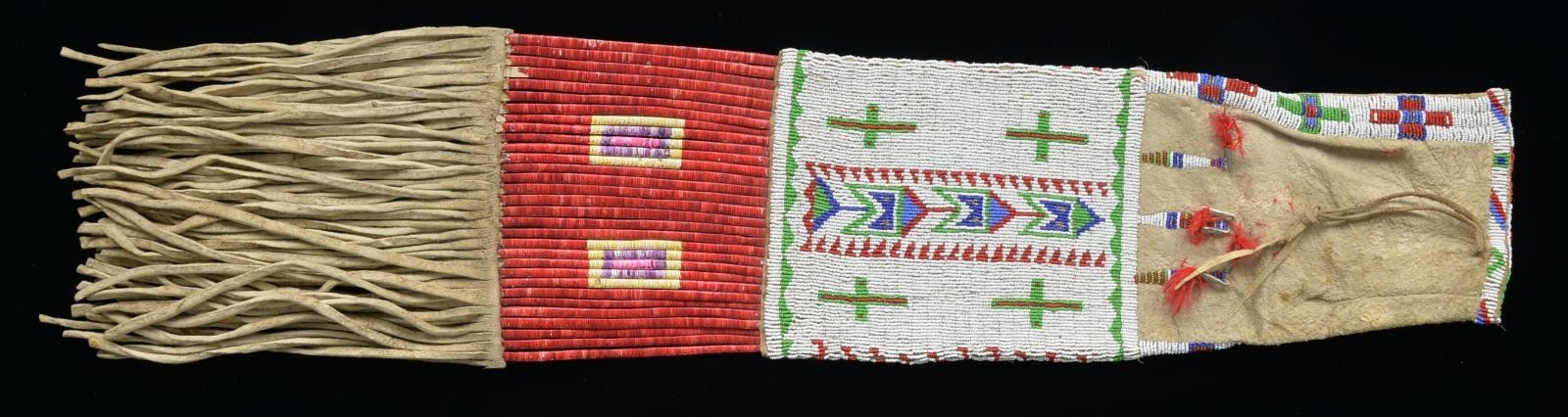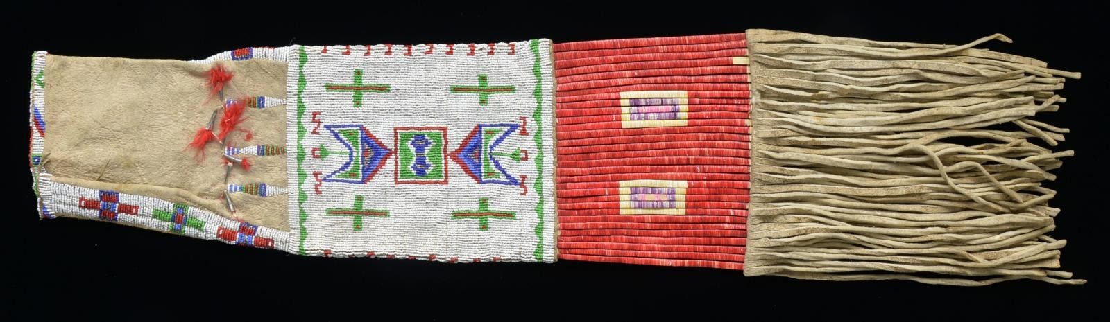 35" Sinew-sewn & beaded w/ white ground, green, medium & dark blue, red, metallic silver bead design. Elongated throat w/ tin cone w/ red died feather tassels, rawhide slats wrapped w/ red, yellow, purple, & pink quillwork. 10" Fringe finishes bag. Late 19th century, early 20th century. CONDITION: very good overall, minor loss of quill work & pigment. (02-14569/JS). $5,000-7,000.