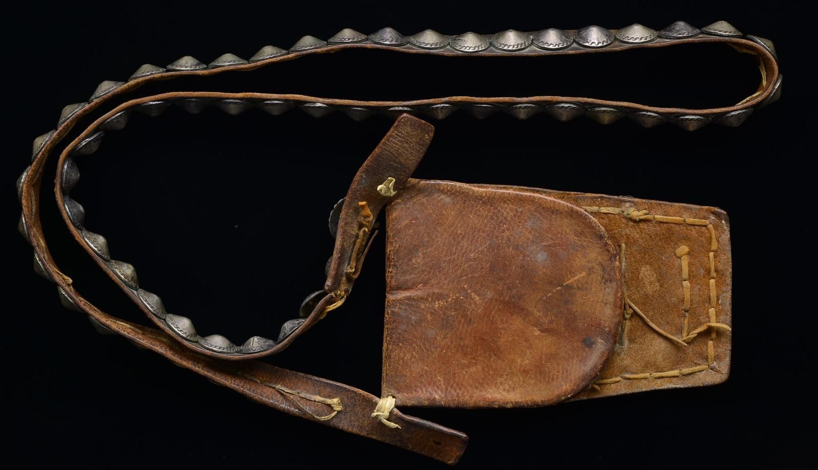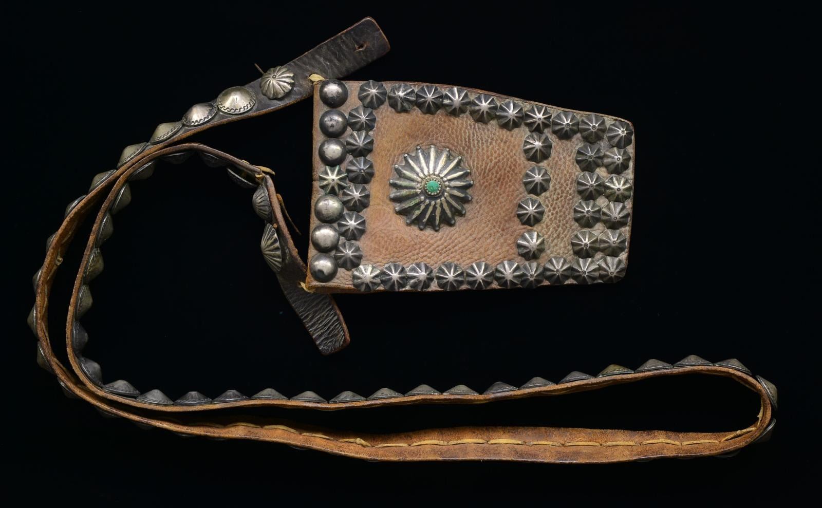 Navajo commercial leather bandolier, mounted in coin silver, both strap & pouch profusely embellished w/ about 100 stamped fluted & domed silver conchos many w/ engraved decoration. Trapezoidal 8" pouch flap has large sunburst-shaped concha w/ serrated bezel w/ small turquoise setting. 35" Overall, 60" strap. Second quarter 20th century. CONDITION: very good overall. (02-14593/JS). $1,500-2,000.