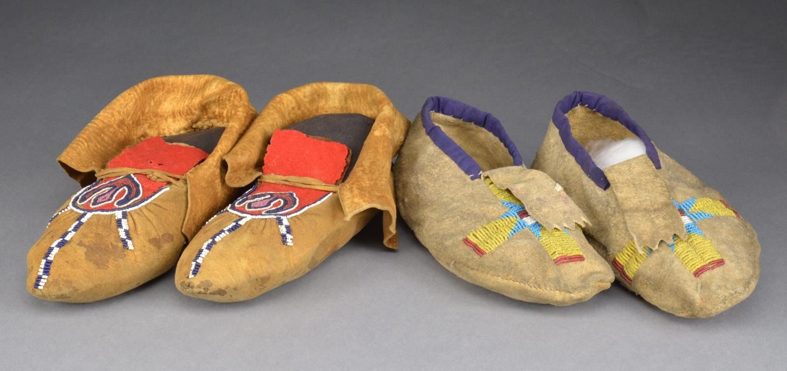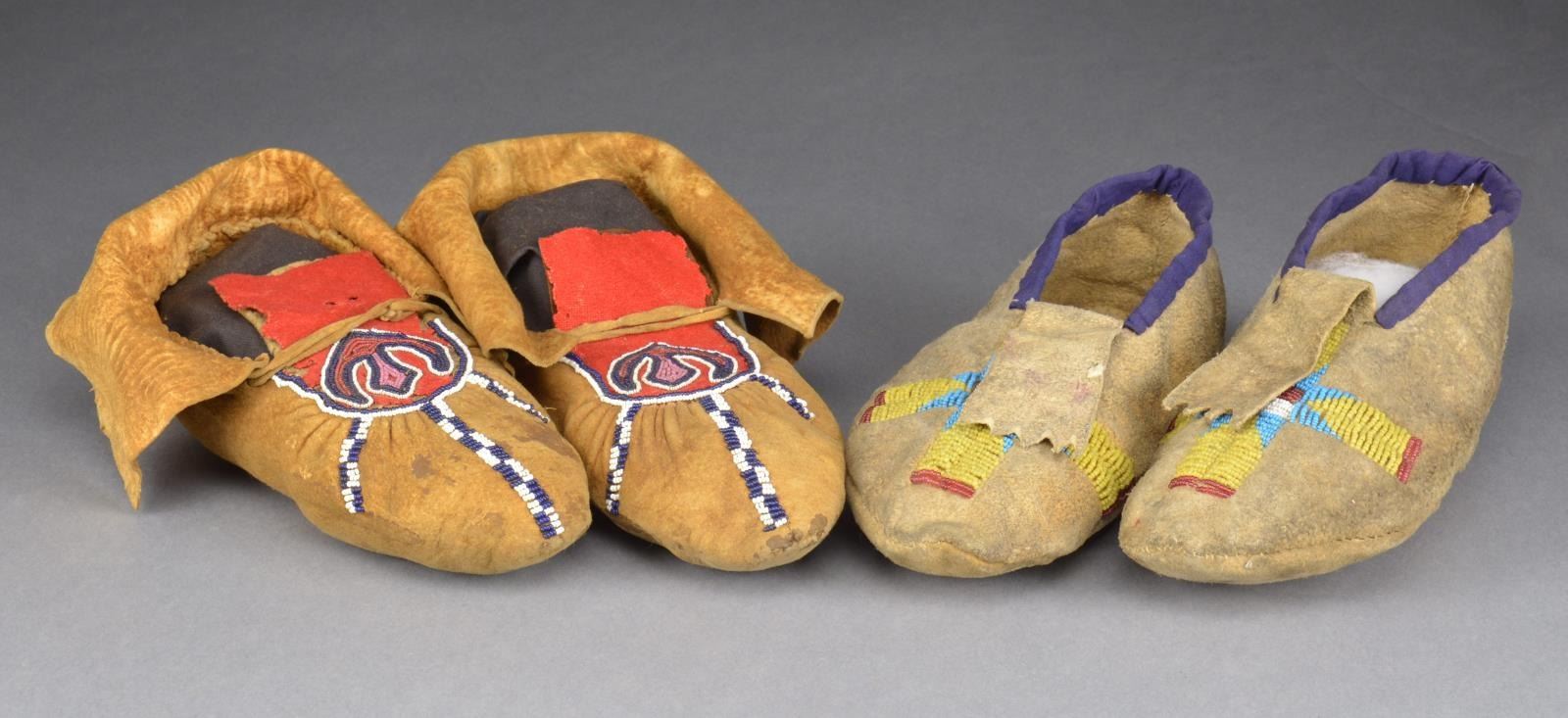 1) 9.5" Thread & sinew sewn, Sioux decorated upper w/ cross made from greasy yellow, blue, white, & red glass beads. Edge sewn w/ blue wool trim. CONDITION: good overall, decoration complete, soiled w/ two 1" tears on one moccasin in back. 2) 10.5" Moose hide, Tinglit, upper decorated w/ seed beads & red wool trade cloth, w/ abstract design stitched w/ dark blue, white, pink & red beads. CONDITION: good to very good overall, complete, supple, insect losses to red trade cloth. (02-14592/JS). $1,500-2,000.