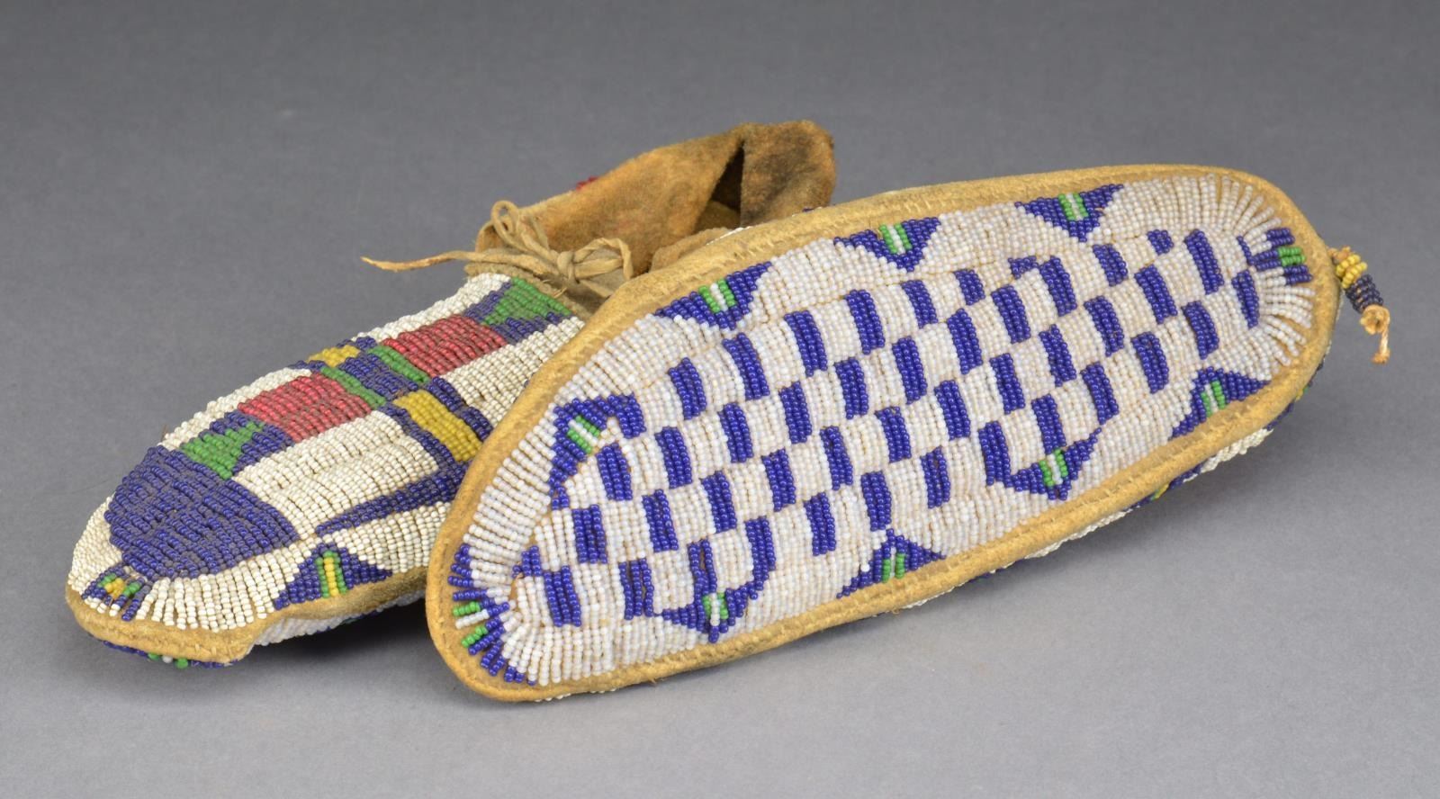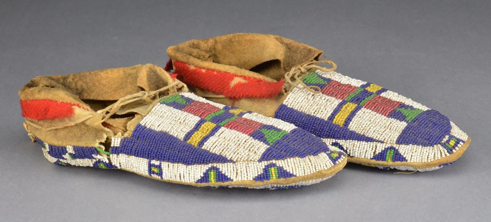 10" Long, fully beaded including soles, sinew & thread sewn. Uppers multicolored geometric design on white ground. Soles are alternating blue & white grid, blue & green triangles along the edges, top & bottom. Red trade cloth edge trim. Blue & yellow beaded tassels. Late 19th century. CONDITION: very good overall, supple, sm. loss of beads on tassels. Red trade cloth trim has insect damage, soiled & darkened exposed leather uppers. (02-14587/JS). $1,500-2,000.