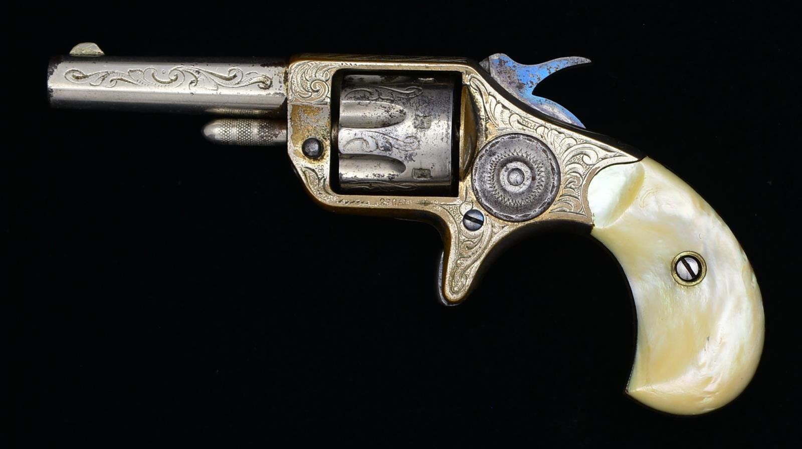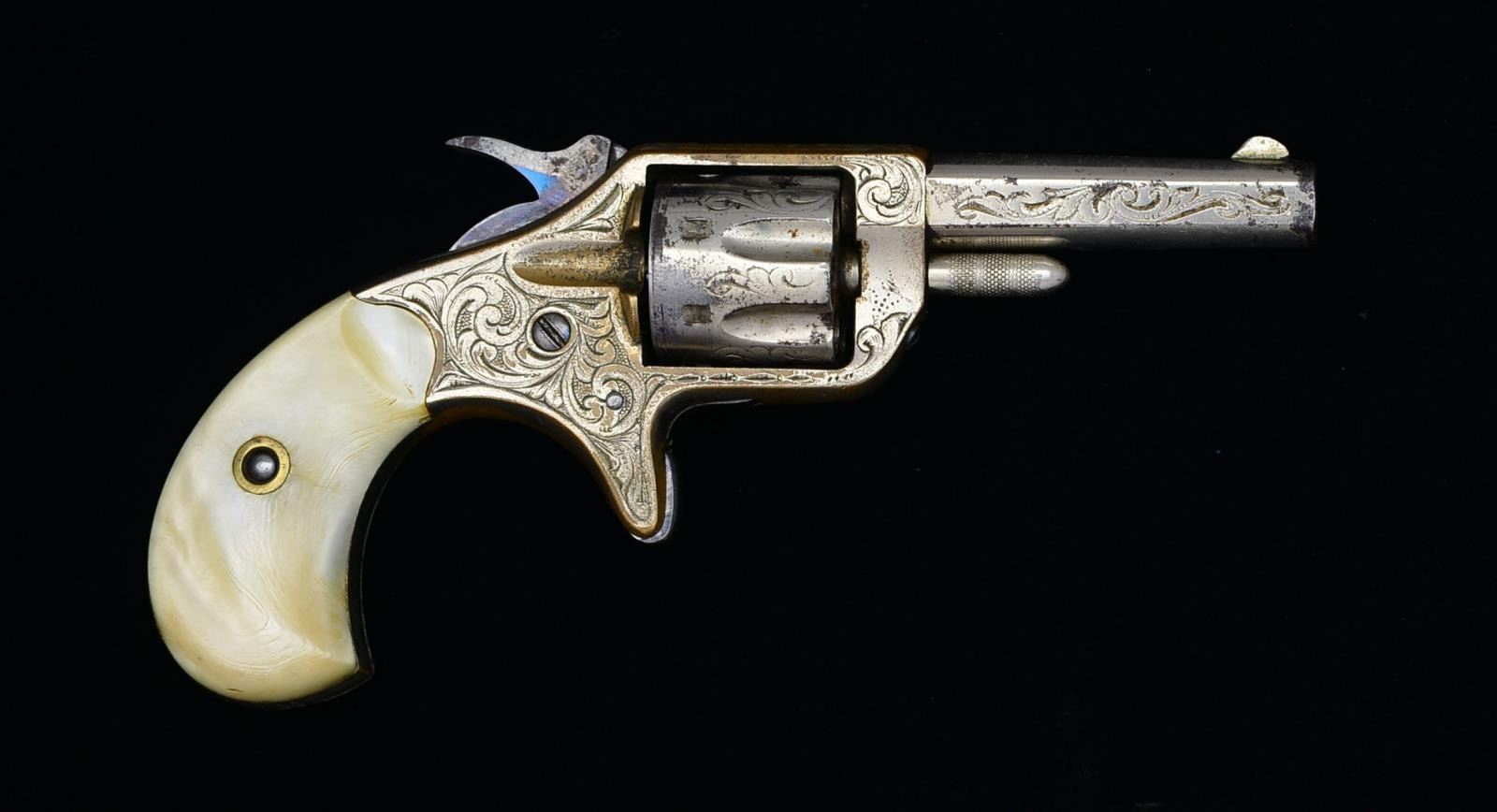 Cal. 22 RF. S# 1098. Bbl. 2 1/4" w/ flat sides. Semicircular front sight. 7 Shot short flute cyl. Brass spur trigger action. Action, cyl. & bbl. have foliate scroll factory engraving w/ punch dot backgrounds. Nickel finish w/ fire blue hammer & trigger. 2 Piece pearl grips. 1873 Mfg. CONDITION: over 60% nickel finish showing spots of wear & light pitting. Good grips. Action functions, but has weak mainspring tension. Dark bore w/ intact rifling. PROVENANCE: Collection of Roger Ballard. (01-18740/DS). ANTIQUE. $800-1,000.