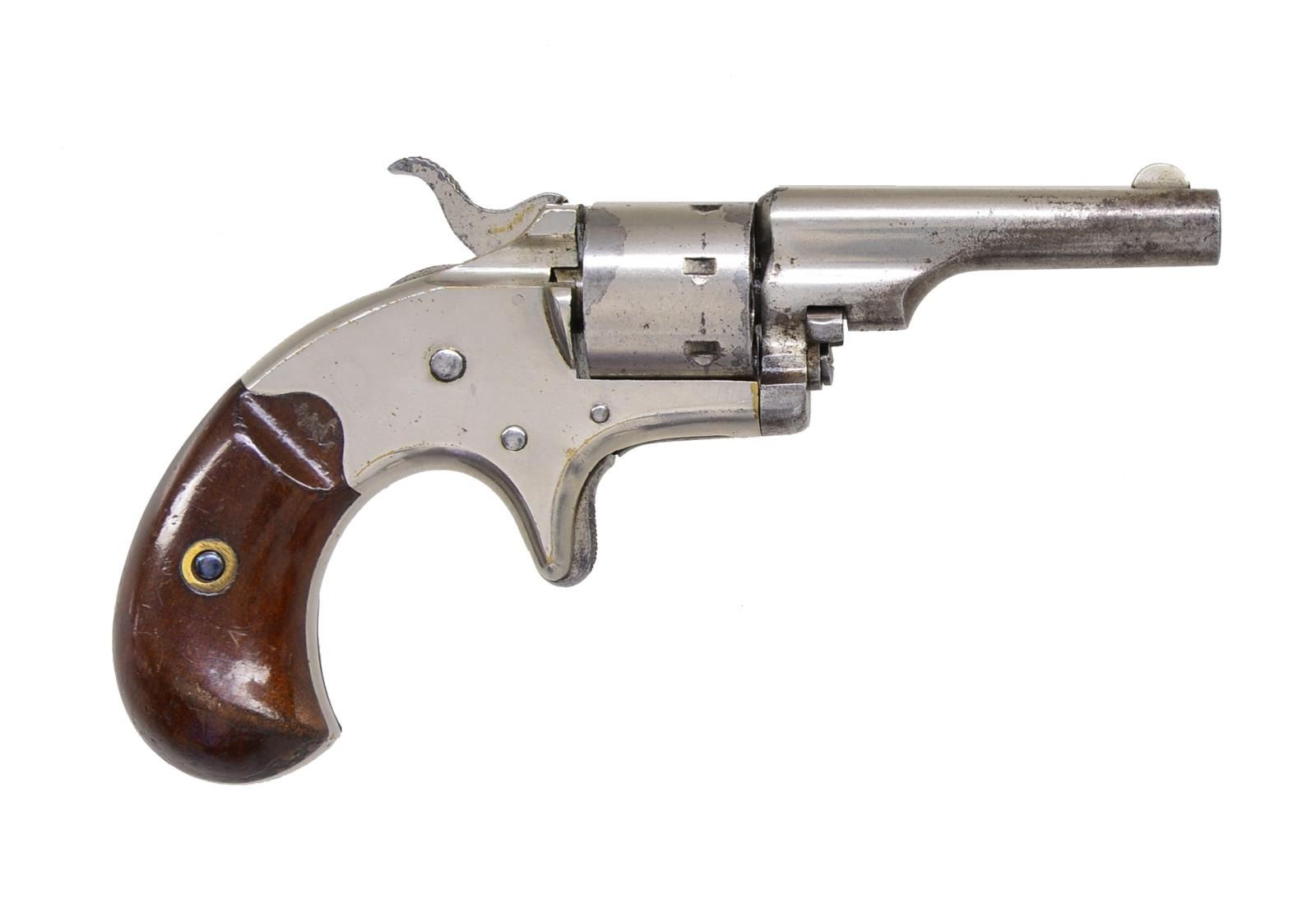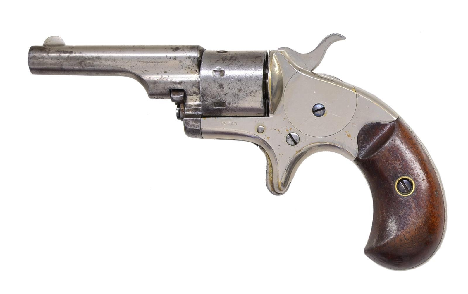 Cal. 22 RF. S# 99777. Bbl. 2 3/8" w/ semicircular sight. 7 Shot rnd. cyl. Spur trigger action w/ full nickel finish. 2 Piece walnut bird's head grips. Mfg. 1877, total of 114,200 produced 1871-1877. CONDITION: over 75% original nickel finish. Grips show wear & handling marks. Sound action. Bore retains intact rifling showing sm. spots of pitting. (01-18093/DS). ANTIQUE. $400-600.