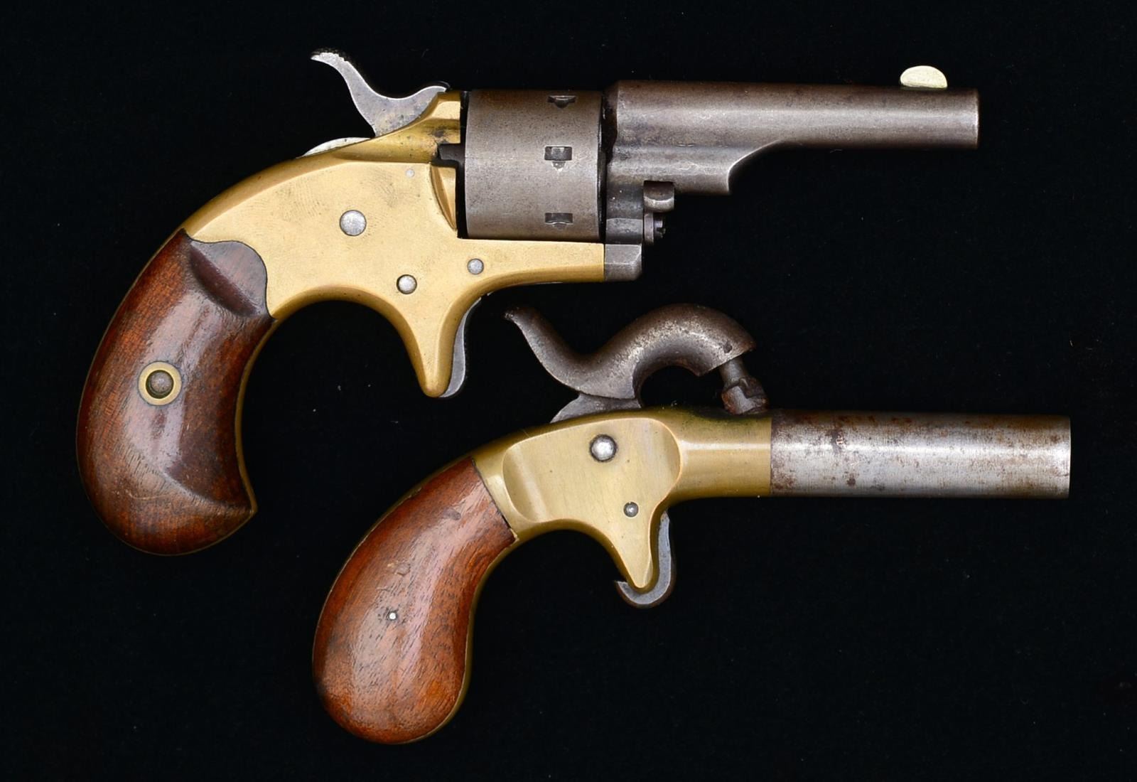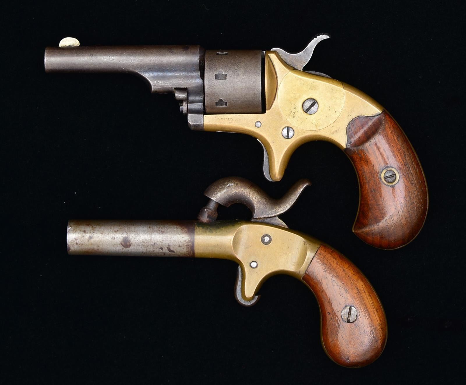1) COLT OPEN TOP POCKET REVOLVER. Cal. 22 RF. S# 62772. Bbl. 2 3/8" rnd. w/ semicircular sight. 7 Shot rnd. cyl. Open top spur trigger brass action. 2 Piece walnut bird's head grips. CONDITION: metal is fading to smooth gray patina. Brass shows a mild patina w/ traces of original silver finish. Grips show finish wear & light handling marks. Good mechanics. Lightly pitted bore w/ largely intact rifling. (01-18633/DS). 2) UNIDENTIFED PERCUSSION POCKET PISTOL. Cal. 38. S# 65. Bbl. 2" w/ smooth bore. Brass spur trigger action w/ center mounted hammer. 2 Piece bag type walnut grips. CONDITION: bbl. & hammer have faded to mottled gray brown. Brass action has a mild patina. Grips show light wear & marks. Bore shows some light pitting. (01-18634/DS). ALL ANTIQUE. $350-500.