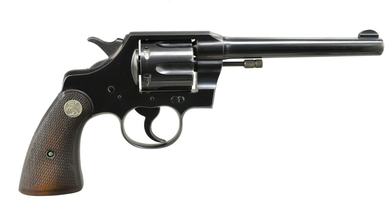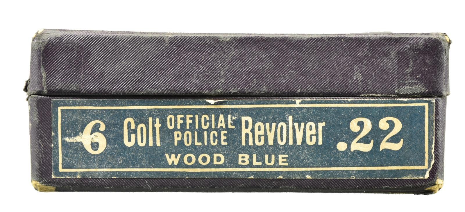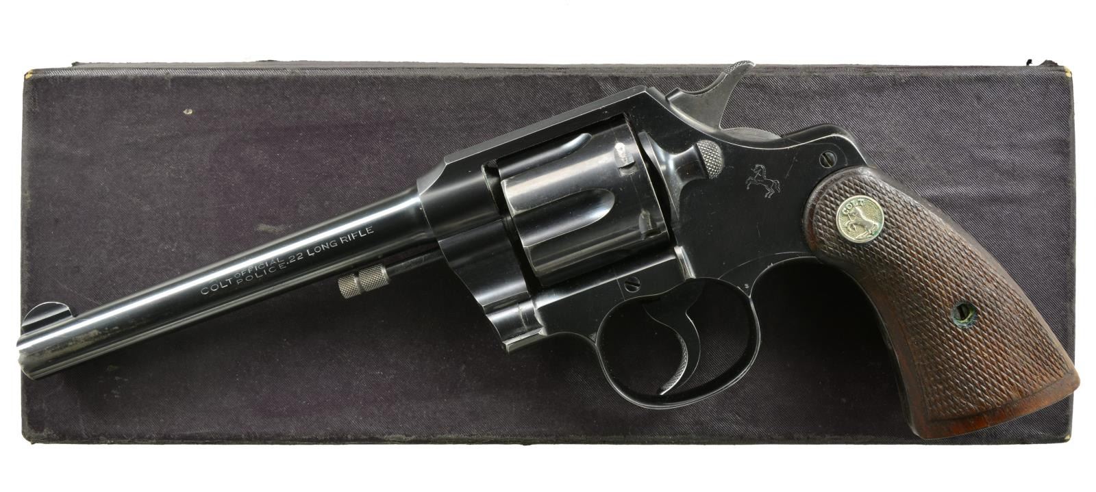 Cal. 22 LR. S# 2457. Bbl. 6" w/ integral semicircular front sight. 6 Shot fluted cyl. Blue finish. 2 Piece checkered walnut grips w/ silver Rampant Colt medallions. 1931 Mfg. UNATTACHED ACCESSORIES: 1 piece box w/ proper label having non matching S#. CONDITION: over 95% blue showing muzzle & edge wear w/ cyl. drag line. Grips show moderately worn checkering & sm. scratches. Crisp mechanics. Bore is bright w/ sharp rifling. PROVENANCE: The Estate of Richard Willman. (20-2351/DS). CURIO. $700-1,000.