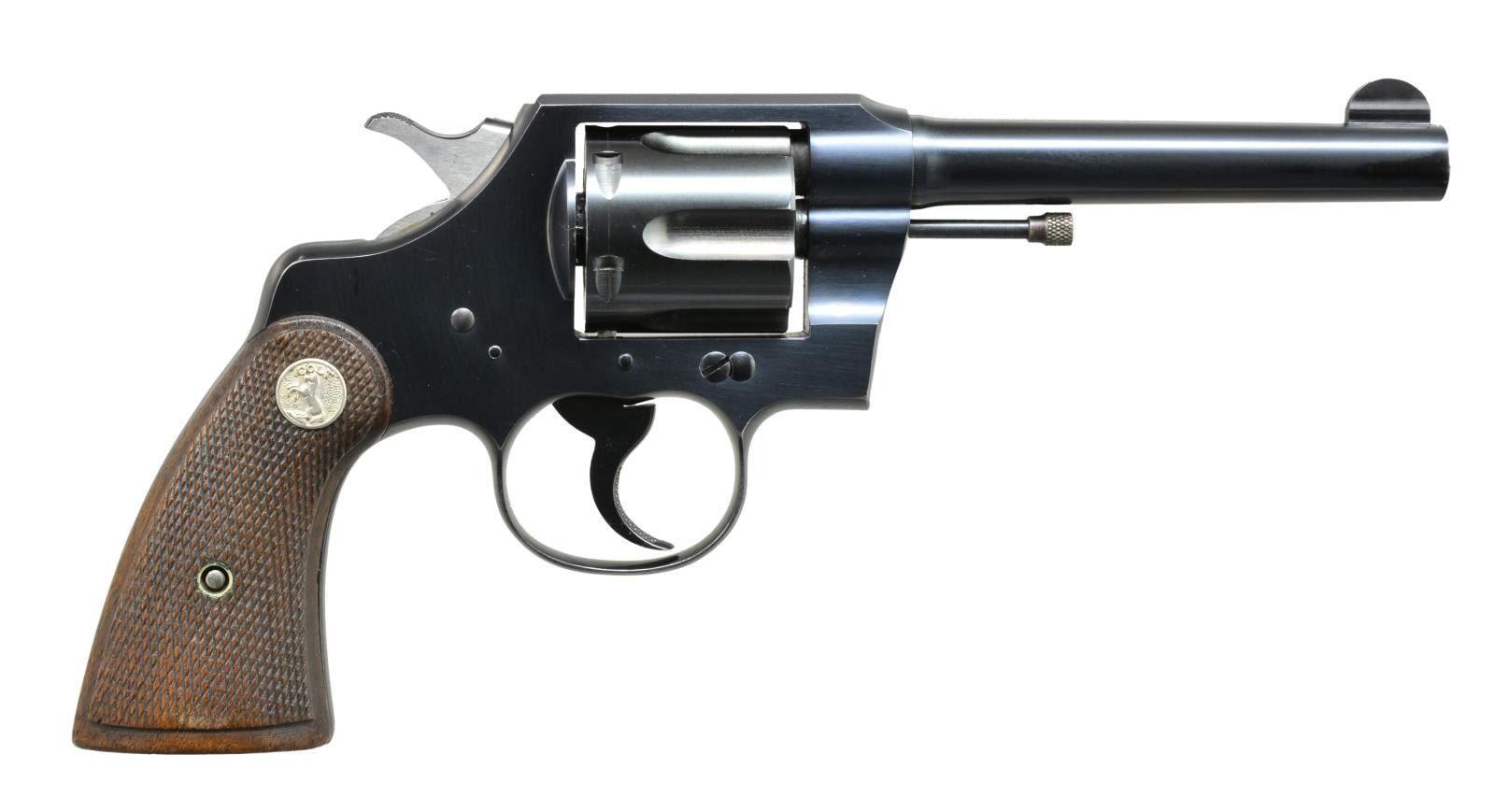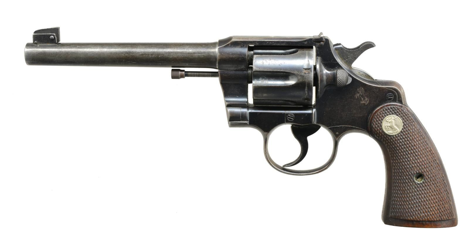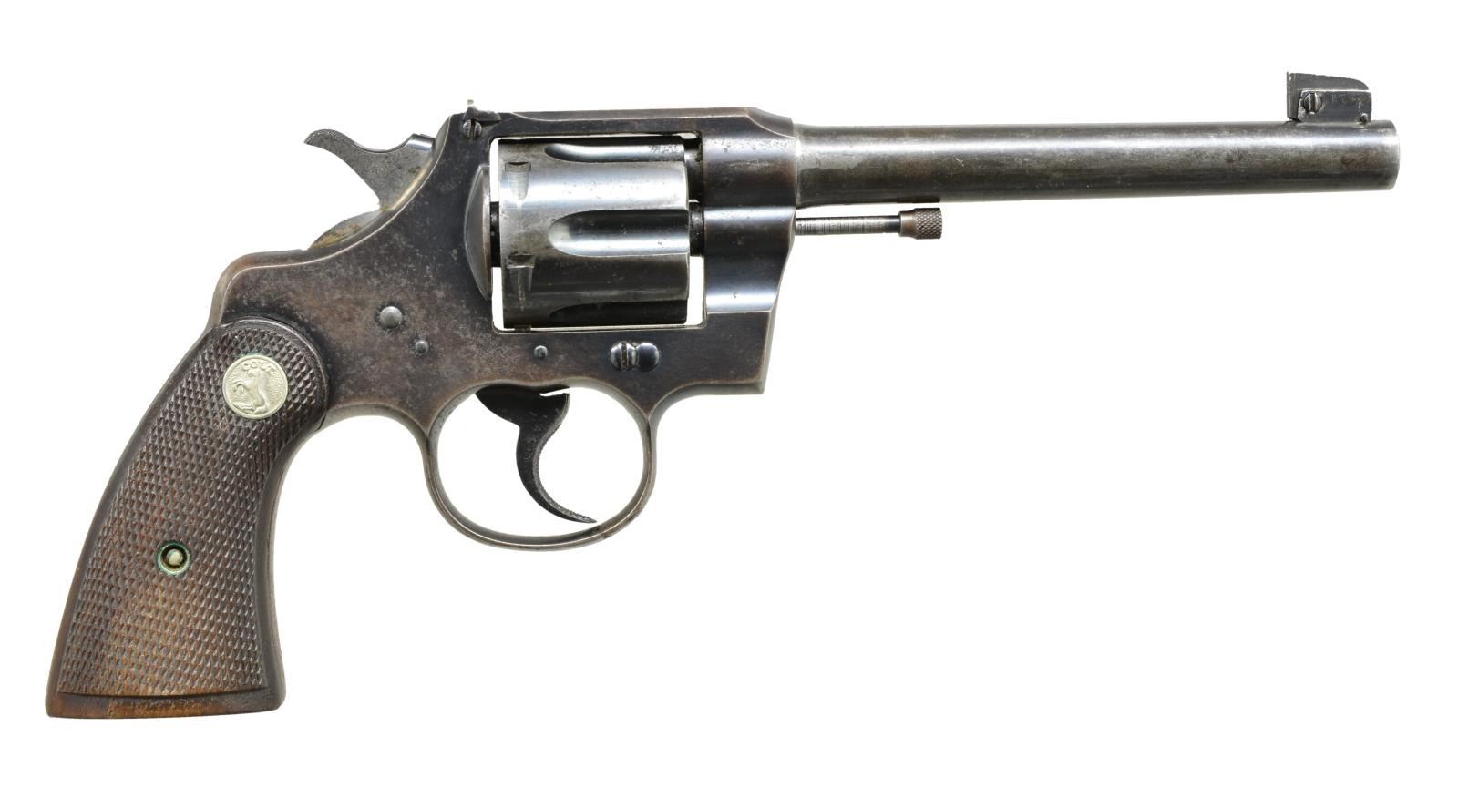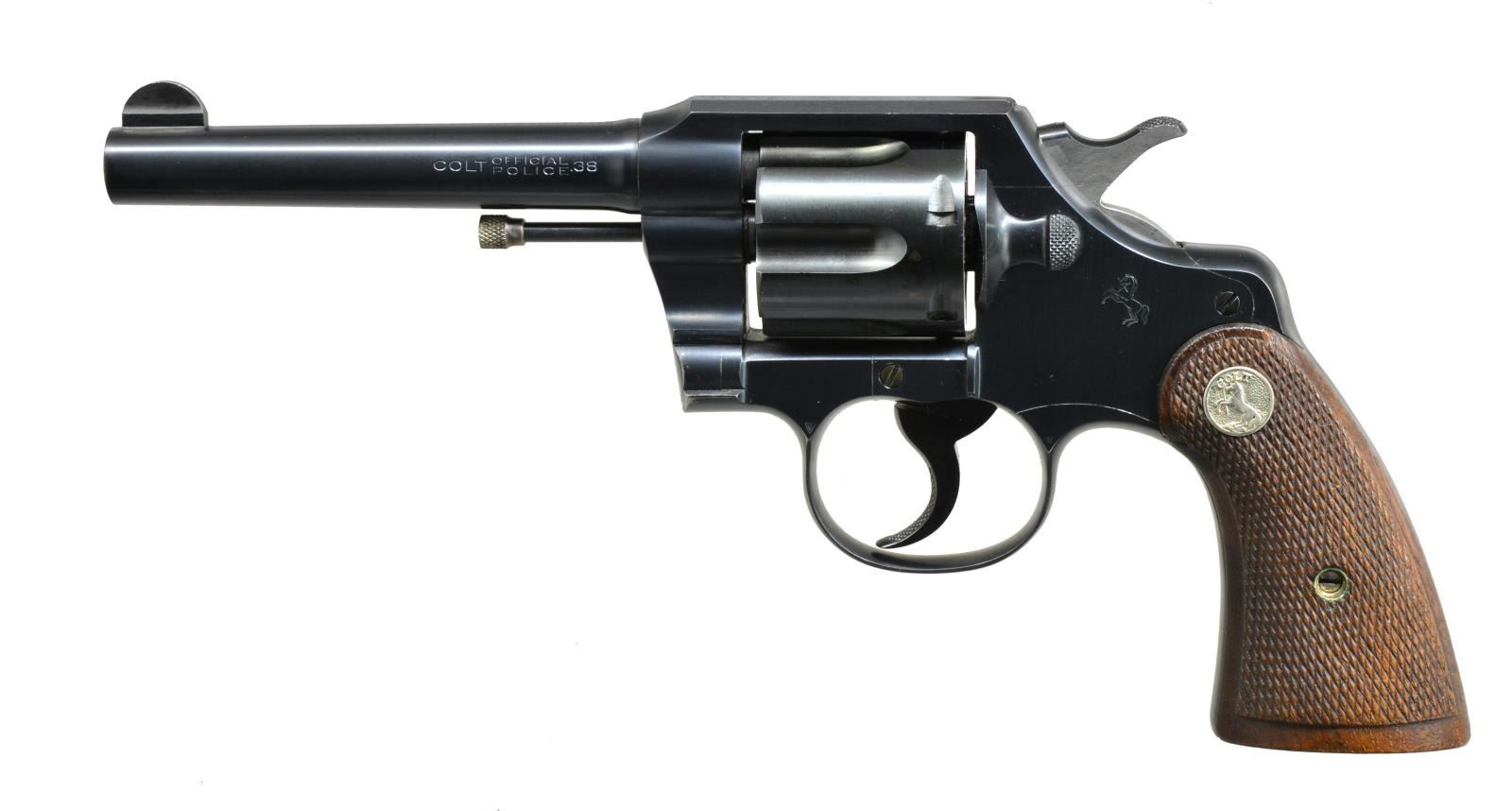 REVOLVERS. 1) OFFICIAL POLICE. Cal. 38 Spl. S# 582340. Bbl. 5" w/ semicircular sight. 6 Shot fluted cyl. Blue finish. 2 Piece checkered walnut grips w/ checkered Rampant Colt medallions. 1933 Mfg. CONDITION: bbl. & frame retain over 90% original blue. Cyl. has good reblue finish showing sm. dark spots. Grips show moderate wear. Bright bore w/ strong rifling. (20-3734/DS). 2) OFFICER'S MODEL TARGET. Cal. 38 Colt. S# 430486. Bbl. 6" w/ blade front sight & adj. U notch rear sight. 6 Shot cyl. Blue finish. 2 Piece checkered hard rubber grips w/ Rampant Colt medallions. 1918 Mfg. CONDITION: 60% dull faded blue showing spots of surface corrosion. Grips have age darkened worn appearance. Bore retains intact rifling showing scattered spots of very light pitting. (20-3946/DS). ALL CURIO. $700-1,000.