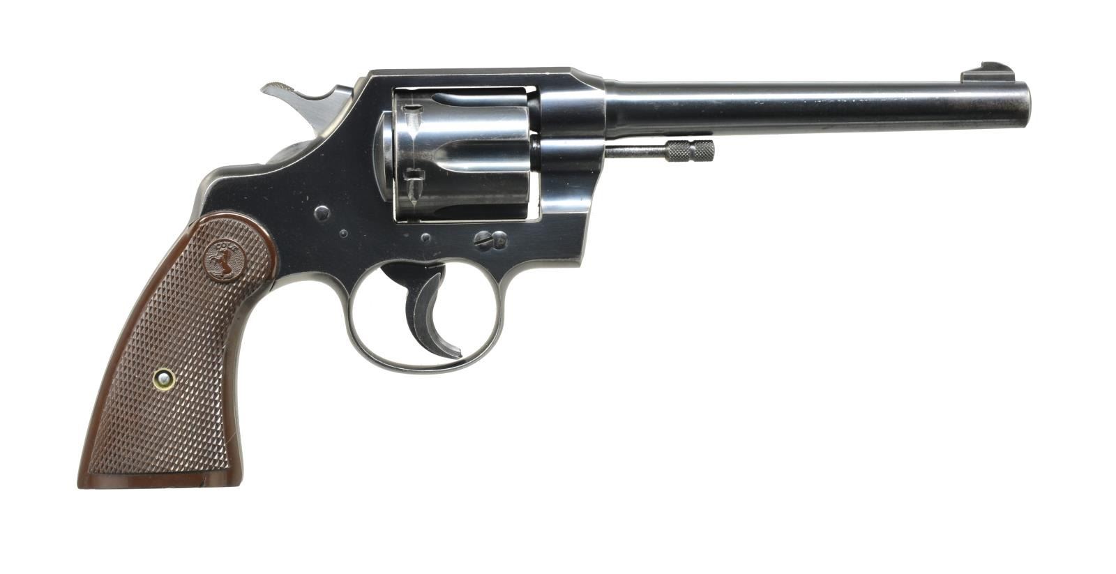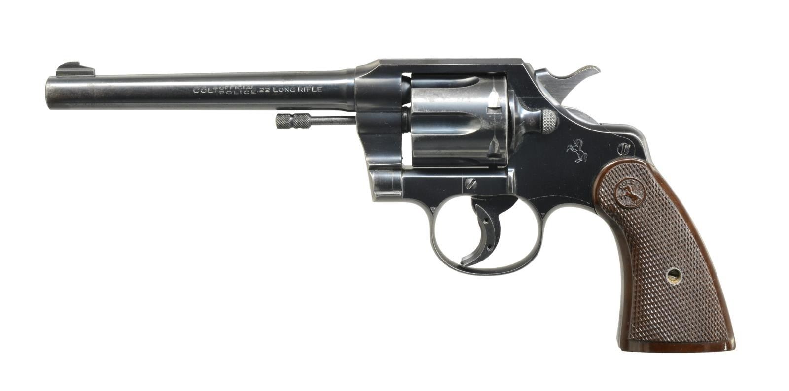 Cal. 22 LR. S# 25632. Bbl. 6" w/ sm. base blade front sight. Rear sight is fixed in top channel of top strap. Checkered brown colt hard plastic grips. Revolver is equipped w/ a trigger shoe. CONDITION: gun has original blue finish w/ minor spots of surface oxidation near muzzle & minor muzzle wear. Lightly thinning on sharp edges of receiver & faint cyl. line. Minor thinning on backstrap. Bore is good. Gun is in time. (20-3065/BT). MODERN. $300-500.
