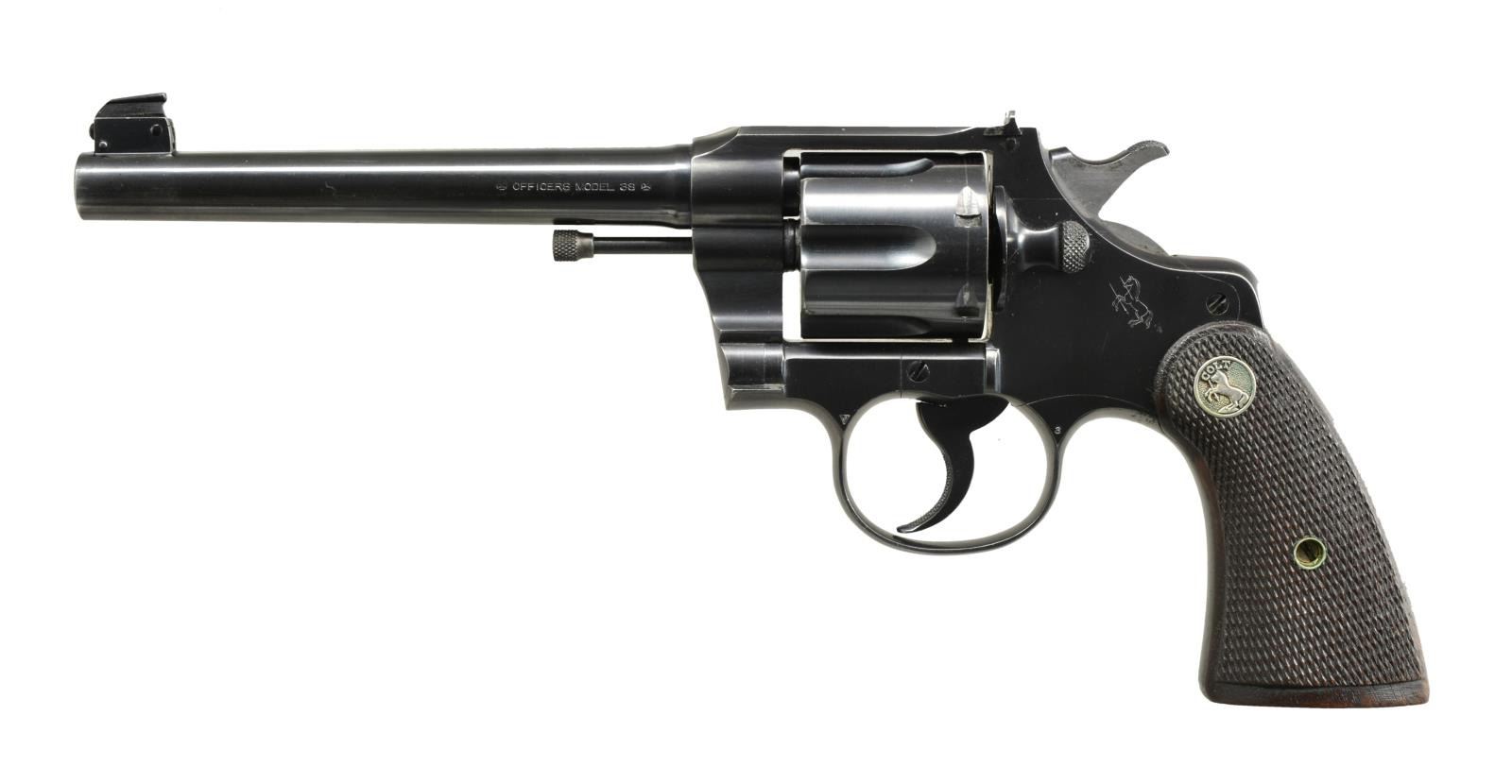 REVOLVER. Cal. 38 Spl. S# 521259. Bbl. 6" w/ adj. bead front sight & adj. U notch rear sight. 6 Shot fluted cyl. Checkered back strap. Blue finish. 2 Piece checkered walnut grips w/ silver Rampant Colt medallions. 1926 Mfg. CONDITION: over 90% blue showing light muzzle & edge wear. Grips retain very good checkering having an age darkened appearance w/ sm. handling marks. Crisp mechanics. Bright bore has sharp rifling. PROVENANCE: The Estate of Richard Willman. (20-2330/DS). CURIO. $800-1,200.