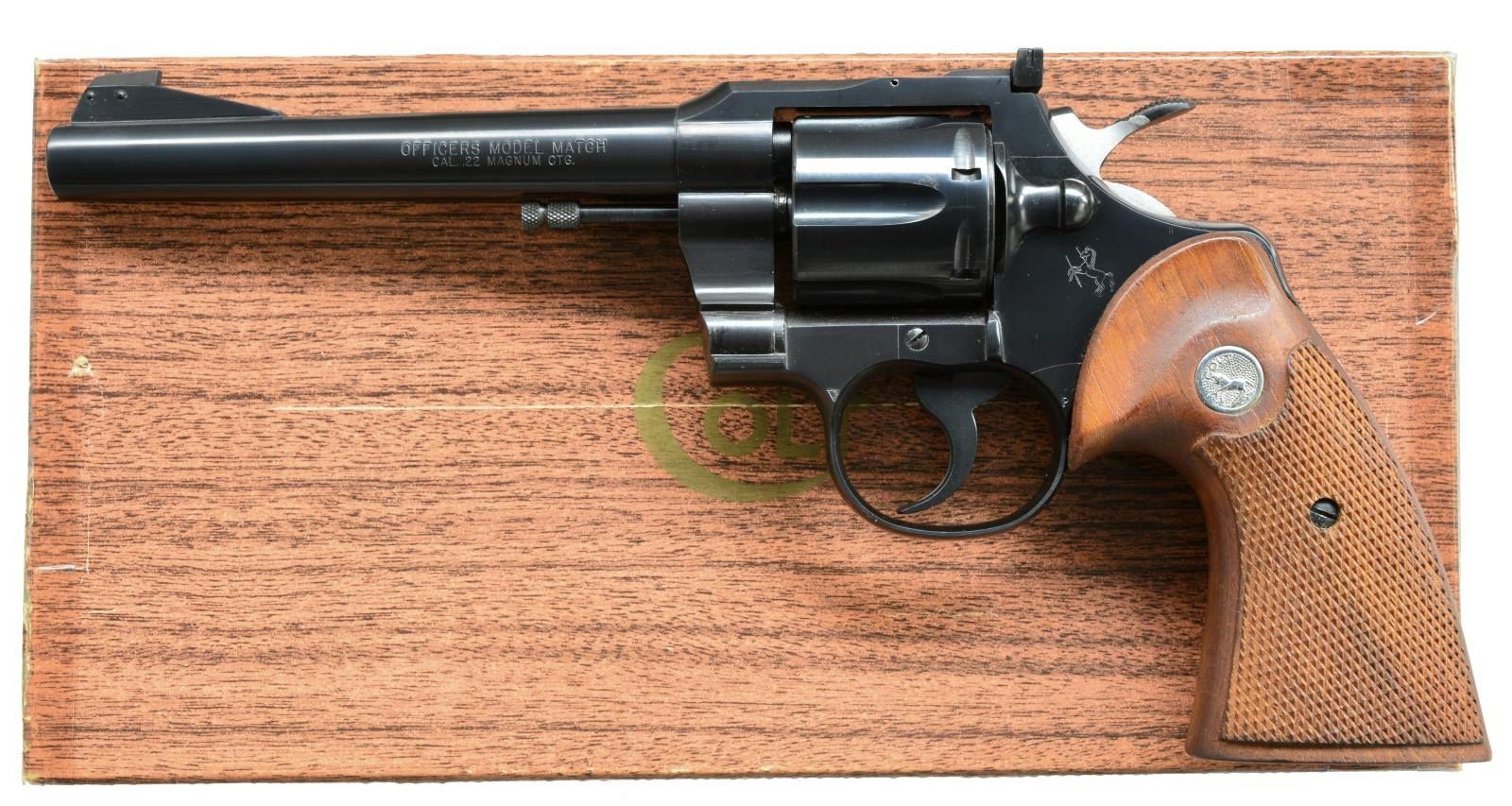 Cal. 22 Magnum. S# 79931. Bbl. 6" tapered rnd. w/ ramp mounted Patridge front sight & square notch adj. rear sight. 6 Shot fluted cyl. Blue finish. 2 Piece checkered walnut target grips w/ Rampant Colt medallions. Mfg. 1960 (1953-1969), approx. 850 produced in 22 Mag. UNATTACHED ACCESSORIES: 2 piece wood grain box w/ matching S# on bottom. Box contains numbered test target, handling the handgun brochure, circular wrench & brush. Box corners & edges are taped. CONDITION: over 98% original blue showing cyl. drag line. Grips have lightly worn finish. Bright near excellent bore. (20-4082/DS). CURIO. $3,000-4,000.