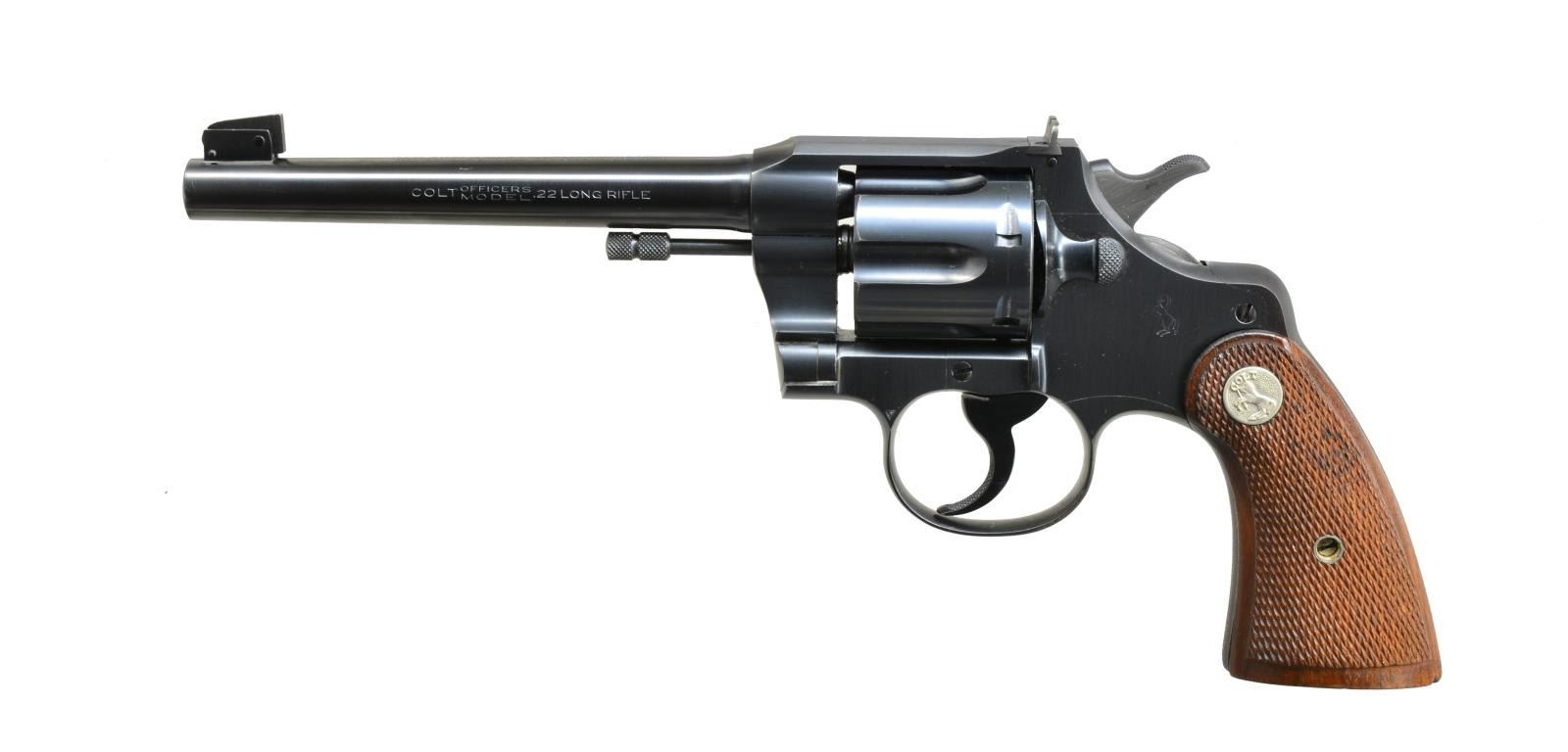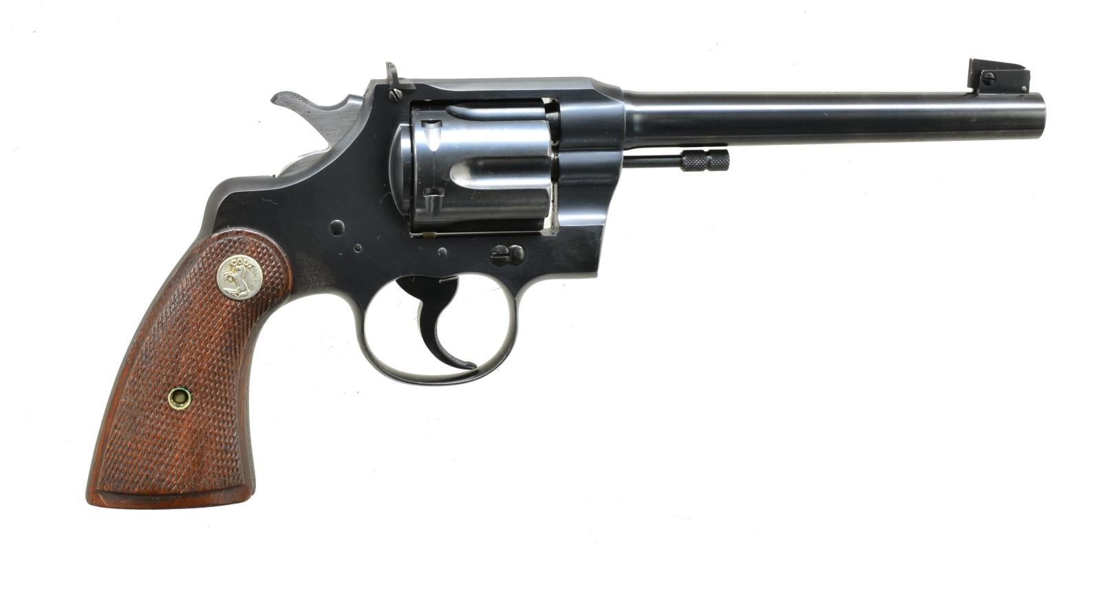 Cal. 22 LR. S# 26913. Bbl. 6" w/ adj. blade front sight & square notch adj. rear sight. 6 Shot fluted cyl. Blue finish. 2 Piece checkered walnut grips w/ Rampant Colt medallions. 1943 Mfg. CONDITION: over 80% blue showing edge wear w/ pitting & touch up blue on right side of frame, trigger guard bow, grip straps & butt. Grips show some worn diamonds w/ filing & touch up finish at butt. Bright bore w/ strong rifling. Smooth mechanics. (20-3246/DS). CURIO. $500-800.
