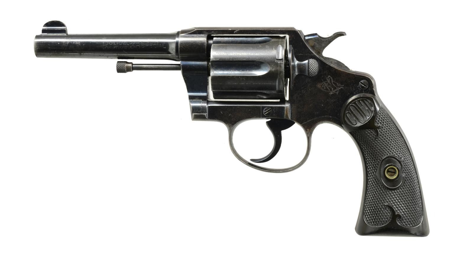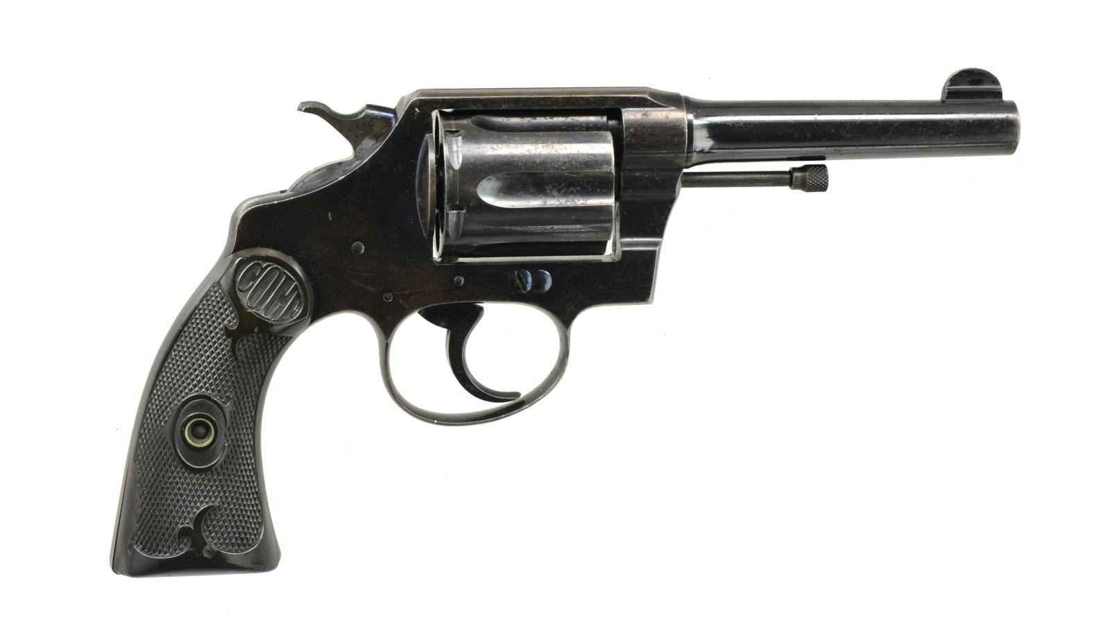 SPECIAL DA REVOLVER. Cal. 38 Spl. S# 16769. Bbl. 4" w/ semicircular front sight. First Issue revolver, last patent date 1905. 6 Shot long flute cyl. Blue finish. 2 Piece checkered hard rubber Colt marked grips. Butt of gun is stamped "W. F. & Co. A. 202". Factory records indicate that shipment of 338 guns of the same type matching this description were shipped March 31, 1909 to W. M. Ashton, Purchasing Agent, New York, NY. CONDITION: action retains over 80% original blue showing light edge wear & scattered spots of corrosion & light freckling. Bbl. has over 80% reblued finish showing edge wear & spots of freckling. Grips show moderate wear. Right panel has epoxy repair along backstrap. Good mechanics. Bore retains good rifling showing spots of light pitting. PROVENANCE: The Estate of Richard Willman. (20-2343/DS). CURIO. $750-1,250.