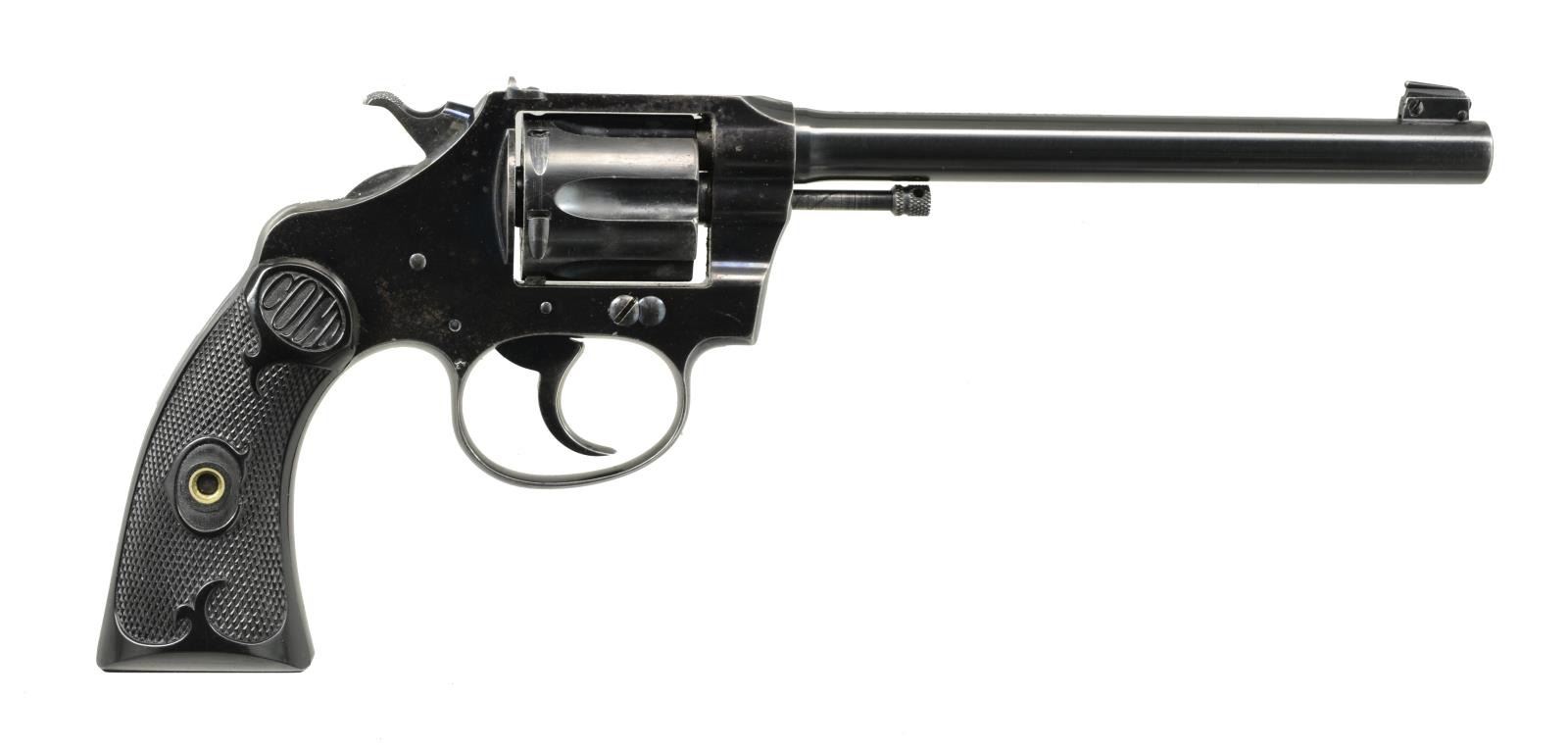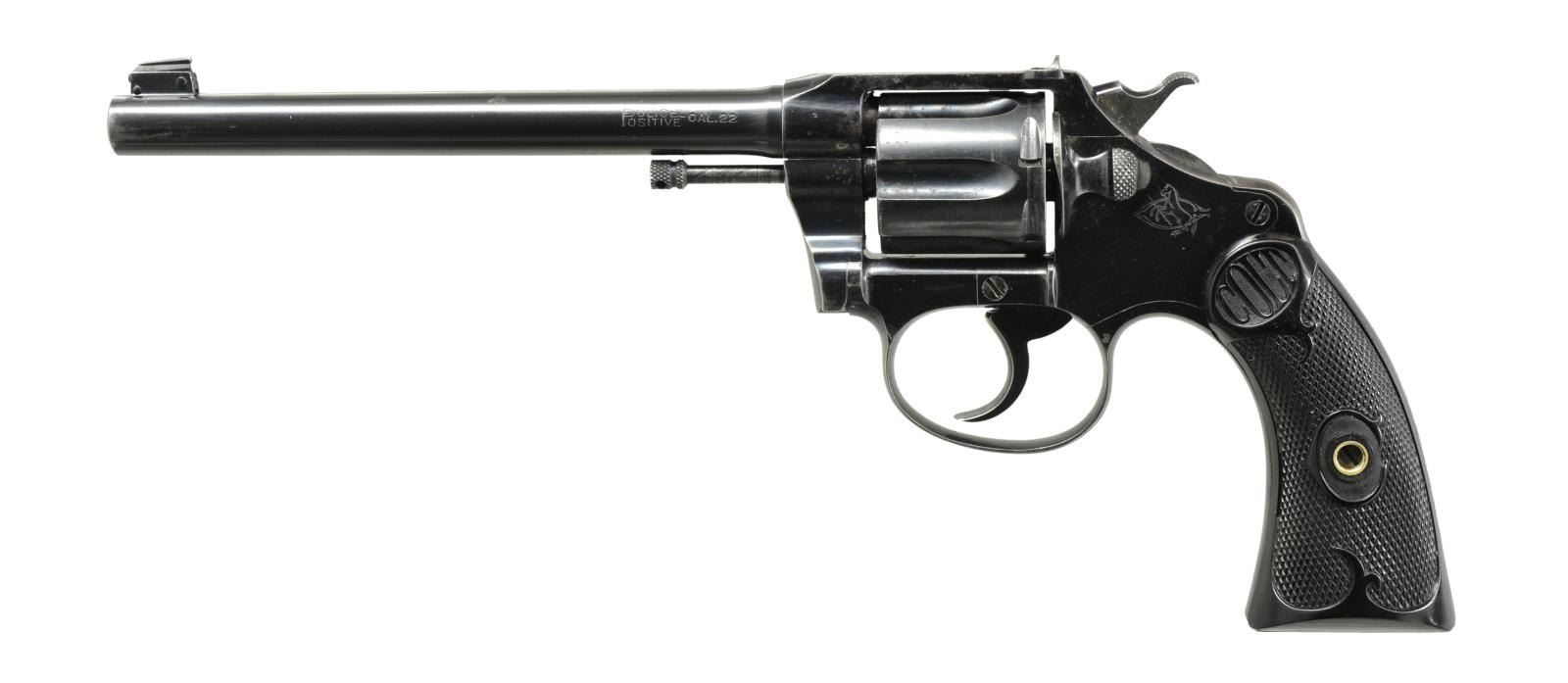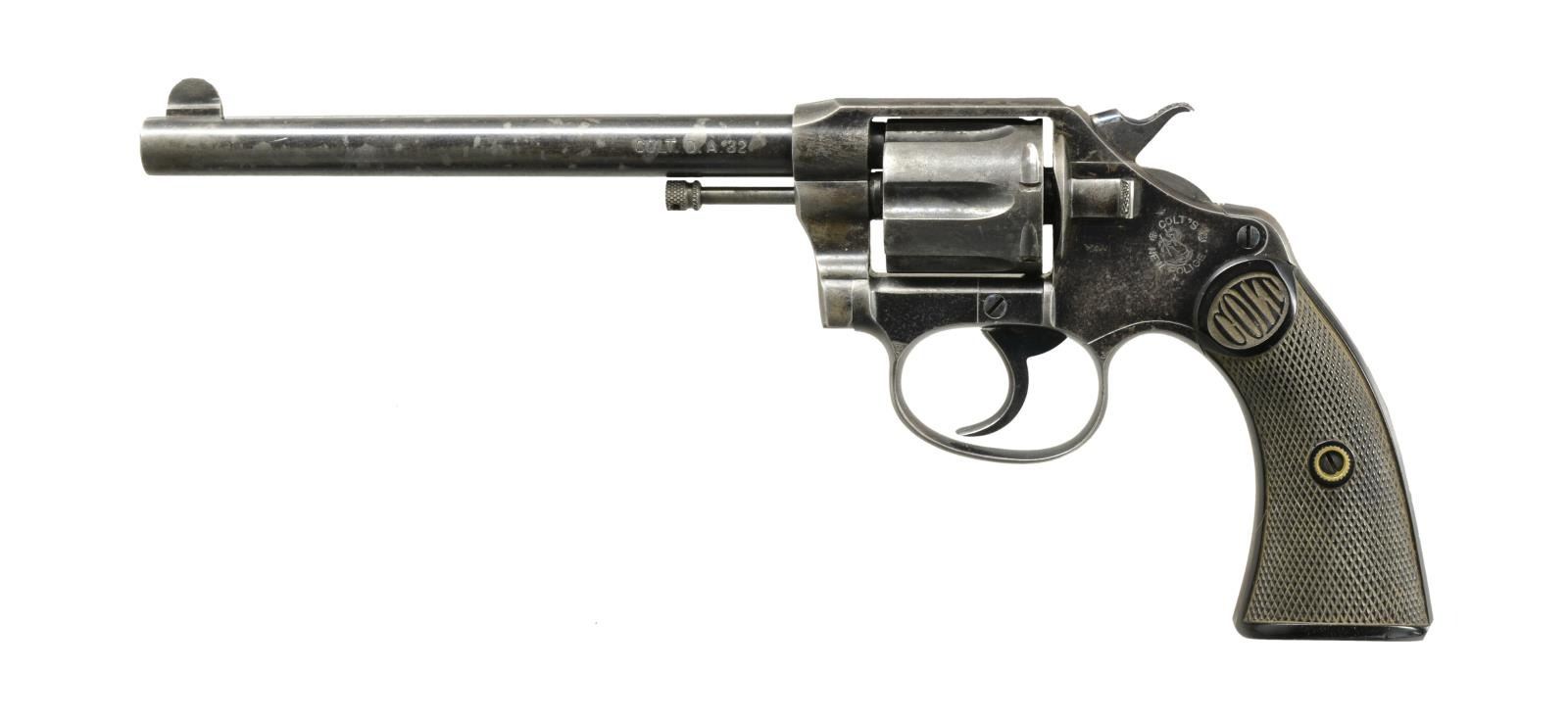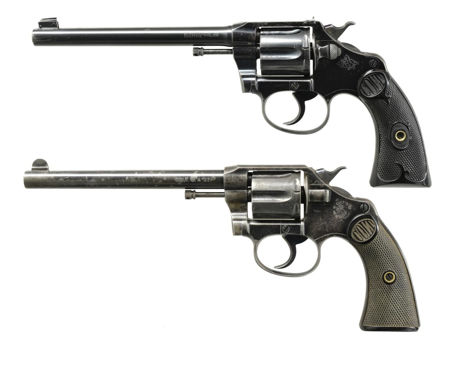 REVOLVERS. ALL: bbls. 6". 6 Shot long flute cyls. Blue finish. 2 Piece checkered hard rubber Colt marked grips. 1) POLICE POSITIVE TARGET FIRST ISSUE. Cal. 22 LR. S# 1695. Adj. bead front sight & adj. U notch rear sight. 1910 Mfg. CONDITION: 75% blue showing muzzle & edge wear w/ scattered spots of corrosion. Grips show light wear. Sound mechanics. Bore retains sharp rifling showing some light pitting. (20-2336/DS). 2) COLT NEW POLICE. Cal. 32 New Police. S# 49578. Semicircular front sight. Butt has initials "JH". Transition model retaining the "New Police" marked side plate & having the 1905 patent date of the First Issue Police Positive that was introduced in 1907. 1907 Mfg. CONDITION: 50% dull worn blue fading to gray. Grips show moderate wear w/ sm. crack at butt of right panel. Good mechanics. Pitted bore. PROVENANCE: The Estate of Richard Willman. (20-2338/DS). ALL CURIO. $900-1,400.
