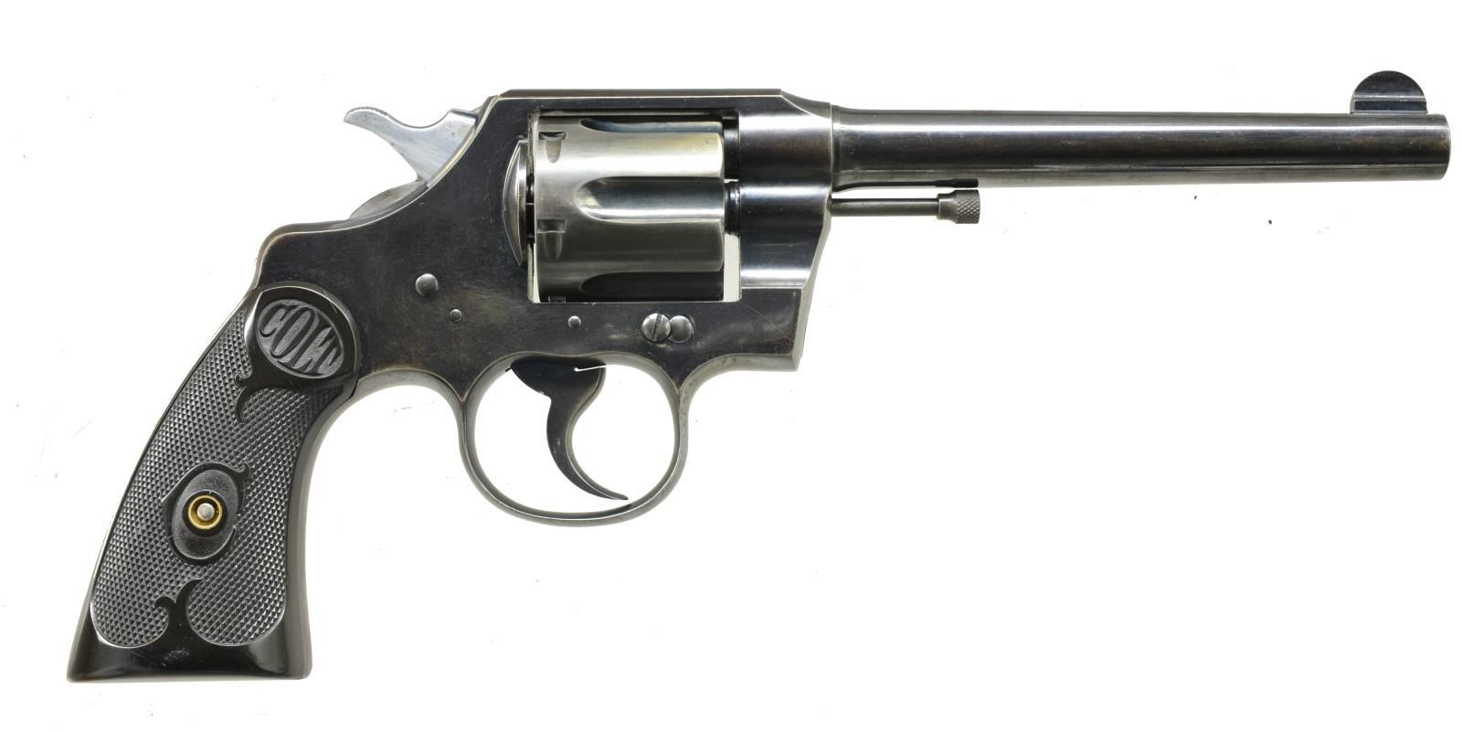 Cal. 38 Spl. S# 303278. Bbl. 6” w/ semicircular sight. 6 Shot fluted cyl. Blue finish. 2 Piece checkered hard rubber grips. 1908 Mfg. CONDITION: 60% lightly faded blue showing touch up on cyl. & bbl. Grips show light wear. Bright bore w/ strong rifling. (20-3721/DS). CURIO. $500-800.