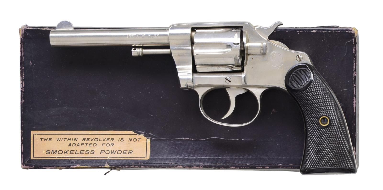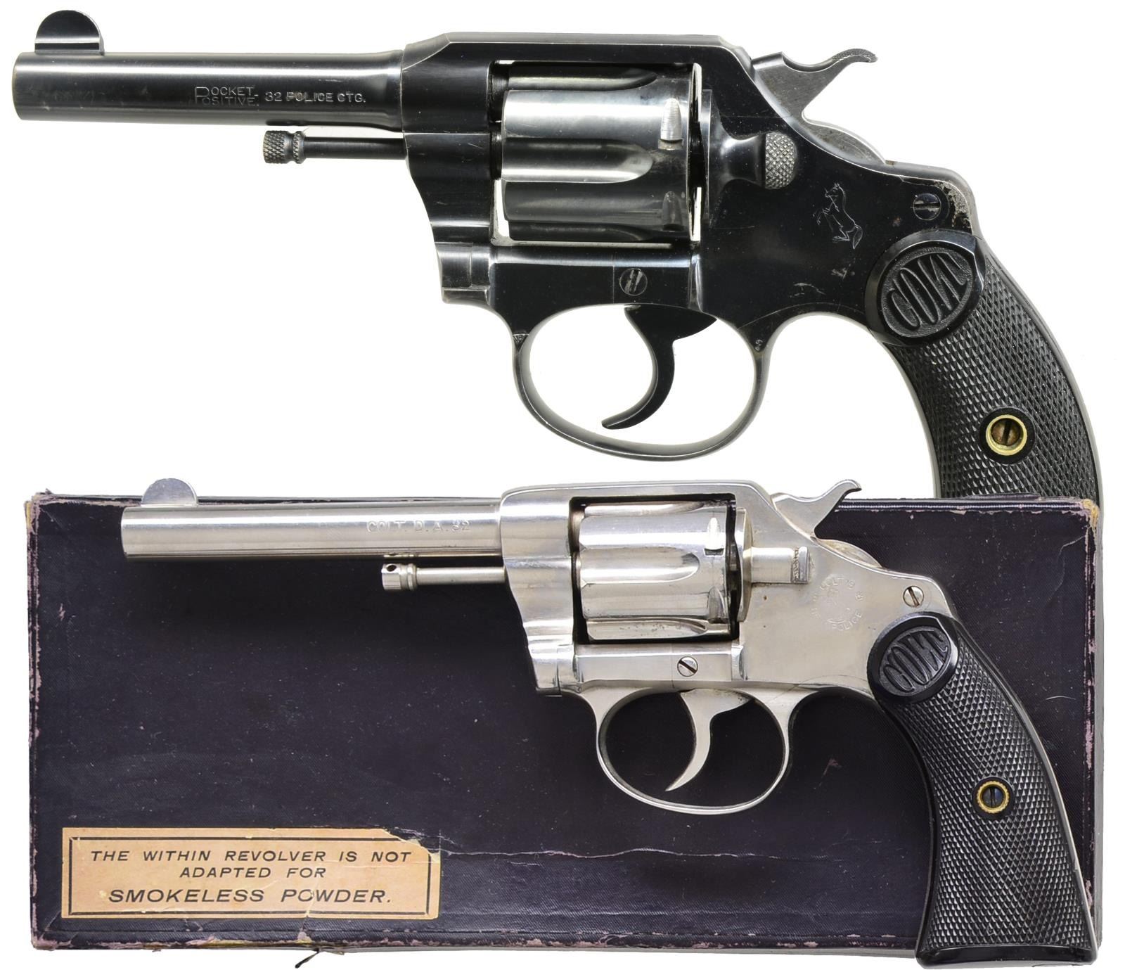 1) POCKET POSITIVE. Cal. 32 New Police. S# 81543. Bbl. 3 1/2" w/ integral semicircular front sight. 6 Shot long flute cyl. Blue finish. 2 Piece checkered hard rubber Colt marked rnd. butt grips. 1910 Mfg., produced 1905-1927. CONDITION: over 90% blue showing edge wear w/ spots of freckling & surface corrosion. Grips show light wear. Sound mechanics. Bore is bright w/ strong rifling. (20-2339/DS) 2) NEW POLICE. Cal. 32 New Police. S# 15723. Bbl. 4" w/ semicircular front sight. 5 Shot long flute cyl. Full nickel finish. 2 Piece checkered hard rubber Colt marked square butt grips. 1902 Mfg., produced 1896-1907. UNATTACHED ACCESSORIES: 1 piece box w/ proper label having matching S# on bottom. Box contains cleaning brush. Box shows lightly tattered edges w/ 1 torn end flap. CONDITION: over 90% nickel showing scattered spots of corrosion & pitting. Grips show light wear. Sound mechanics. Bore is bright w/ sharp rifling. PROVENANCE: The Estate of Richard Willman. (20-2340/DS). ALL CURIO. $1,250-1,750.