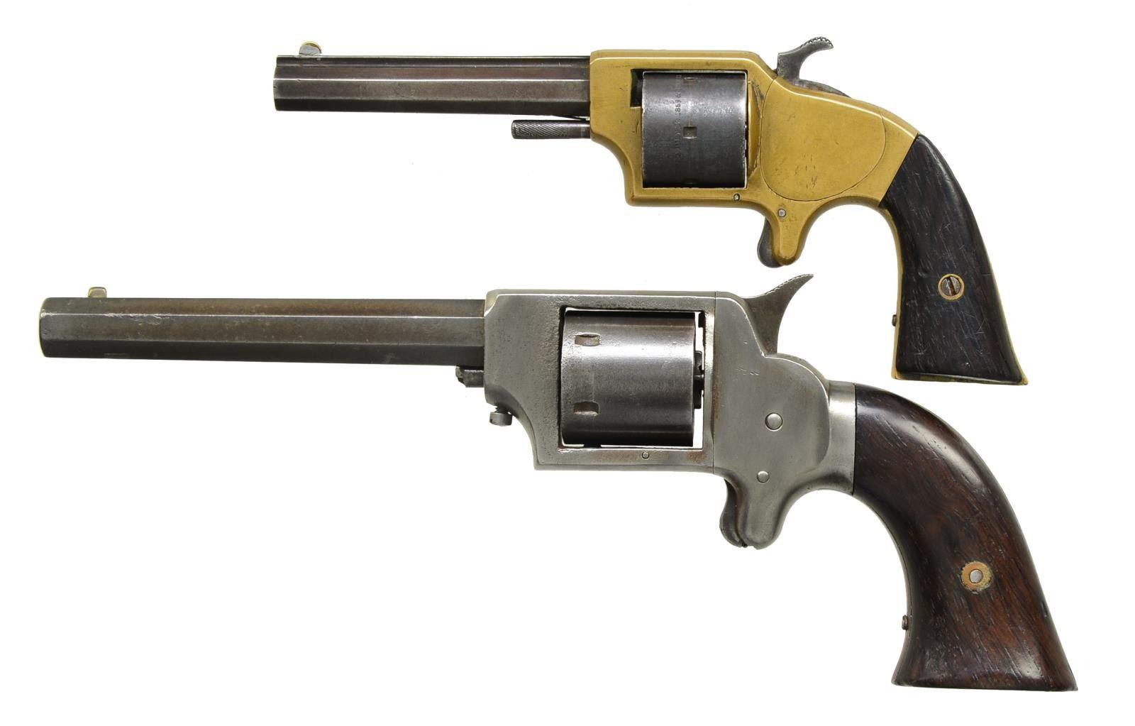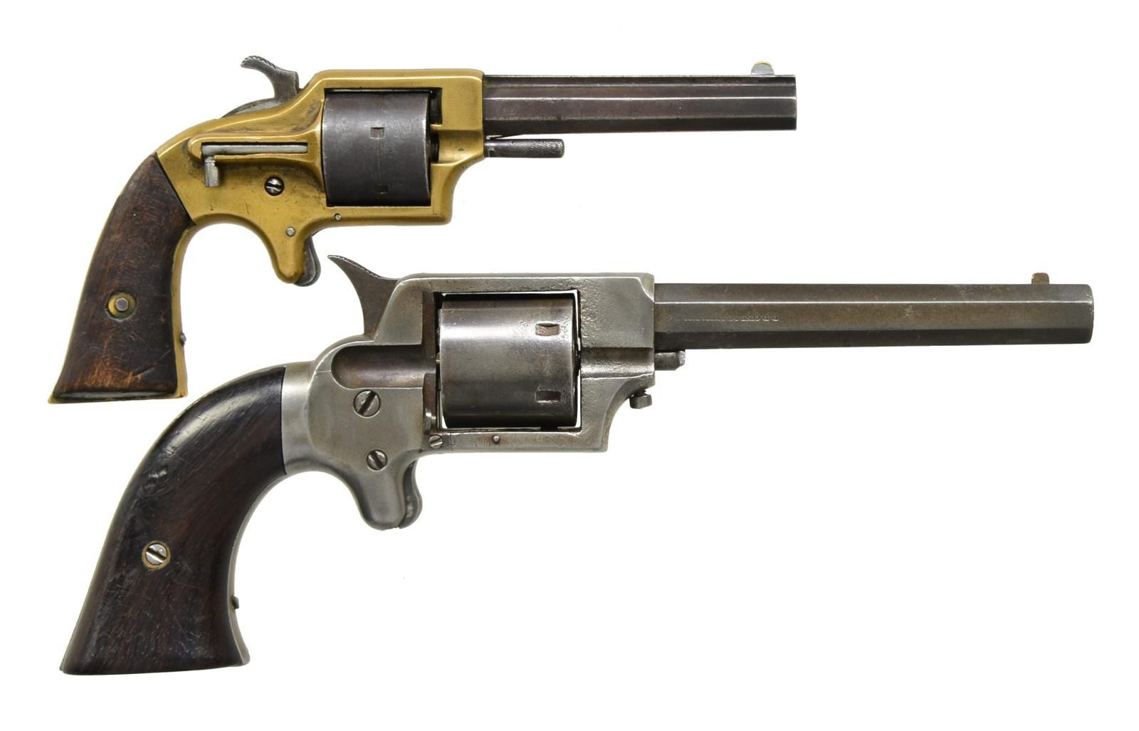ALL: both designs were efforts to circumvent the Rollin White patent held by Smith & Wesson. 1) EAGLE ARMS CUPFIRE SA. Cal. 30 Cupfire. S# 6870. Bbl. 3 1/2" oct. w/ rib marked "EAGLE ARMS CO. NEW YORK". Silver finished brass spur trigger action w/ ejector rod on right side. 6 Shot rnd. cyl. Left grip panel is original rosewood, hardwood right panel is a replacement. Butt marked w/ inspectors initials "APC". Mfg. by Eagle Arms of New York. Sales by Plant Mfg. Co. of New Haven, CT. CONDITION: bbl. & cyl. have faded to brown. Action is cleaned showing traces of plating in protected areas w/ numerous dents at butt. Grips show dents & wear. Dark pitted bore. Ejector rod is a replacement. Action is bound up. (01-18021/DS). 2) WM UHLINGER "D.D. CONE" POCKET SA. Cal. 32 RF. S# 1094. Bbl. 5" oct. w/ blade sight. 6 Shot rnd. cyl. Spur trigger action w/ rosewood grips. CONDITION: cleaned gray metal showing areas of pitting. Grips show wear & handling marks. Pitted bore. Ejector rod is broken off in front of frame. Loading gate is missing. Action cycles properly. (01-18032/DS). ALL ANTIQUE. $600-1,000.