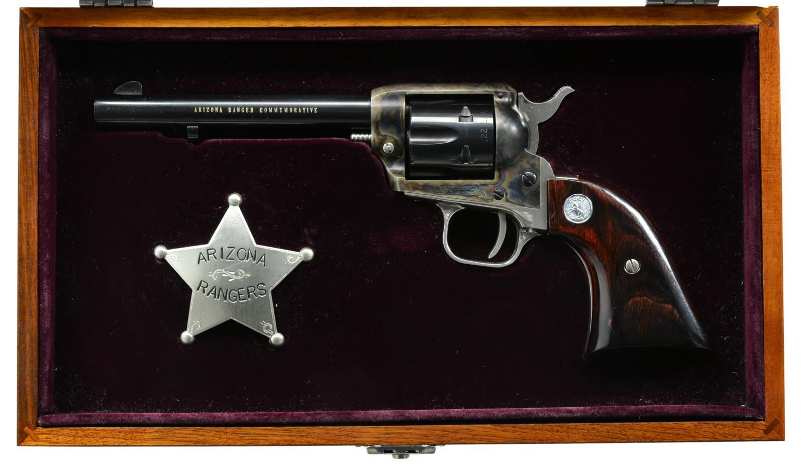 Cal. 22 LR. S# 1443AR. Bbl. 5 1/2" w/ blade front sight & frame notched rear. Mfg. 1972; 3,001 units w/ issue price of $135. Built on Peacemaker Scout frame having nickel plated hammer, trigger, grip frame, cyl. pin & latch. Case colored cyl. frame; balance blued. Gloss finished dark grips w/ silver Colt medallions. UNATTACHED ACCESSORIES: glass topped wood case w/ maroon velvet shadow lined interior also having Arizona Rangers badge. Case near excellent; no key. CONDITION: very faint cyl. turn line; all other aspects near excellent including bore. (20-2573/NW). CURIO. $450-650.