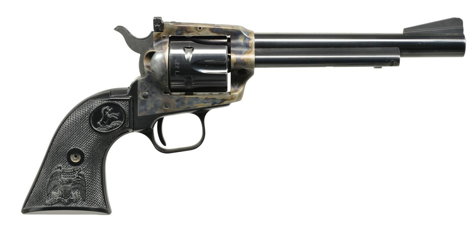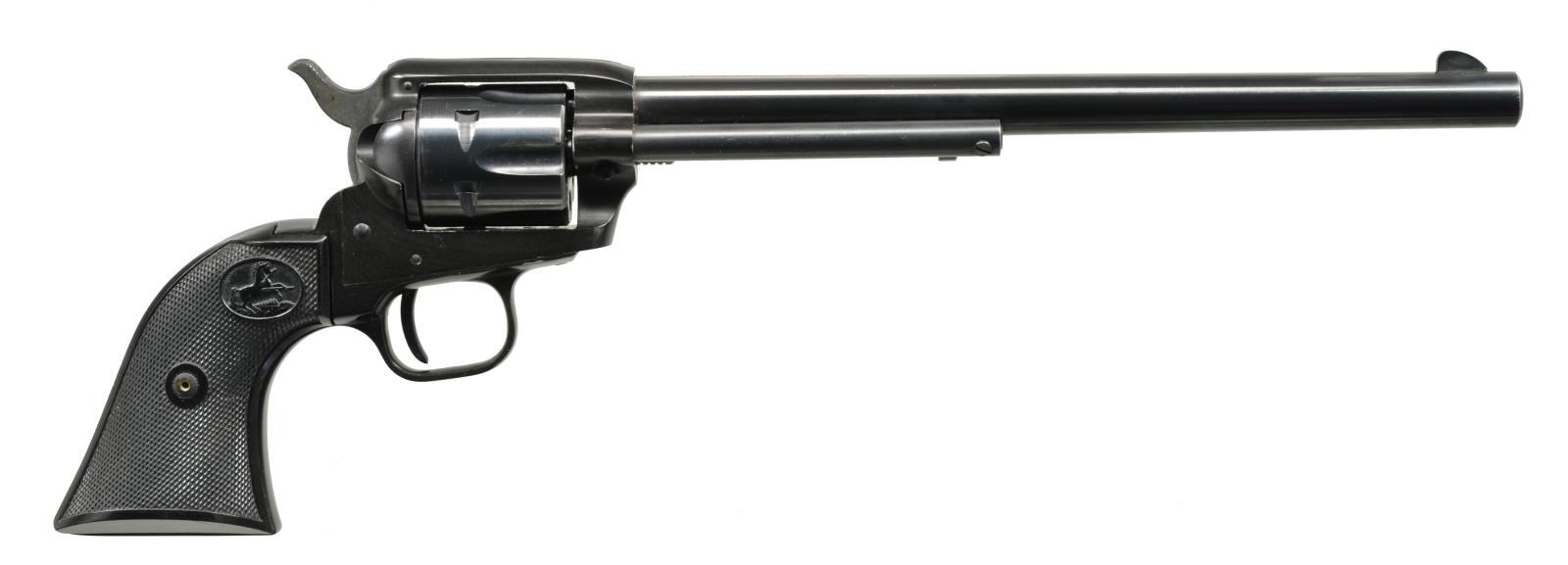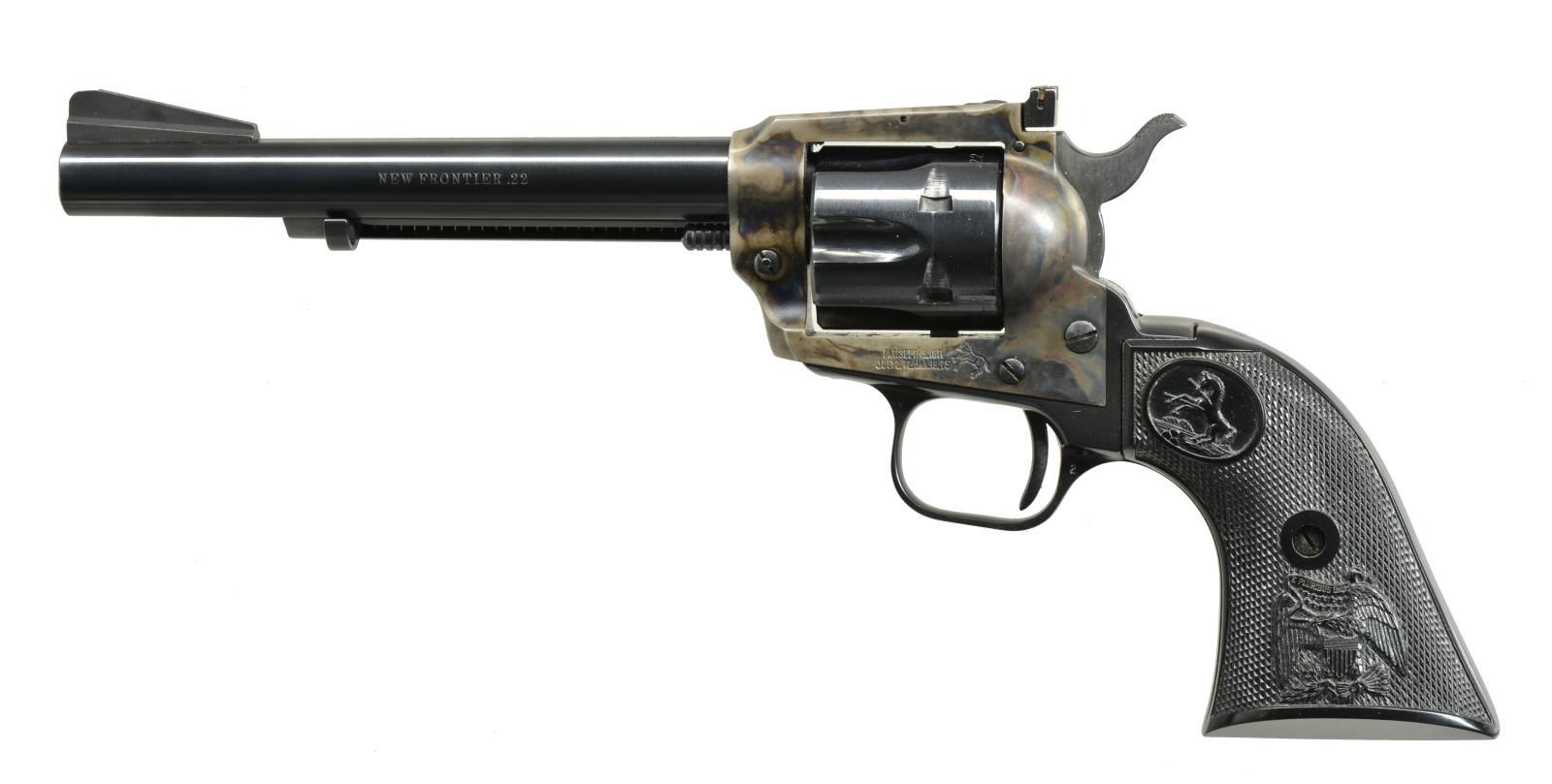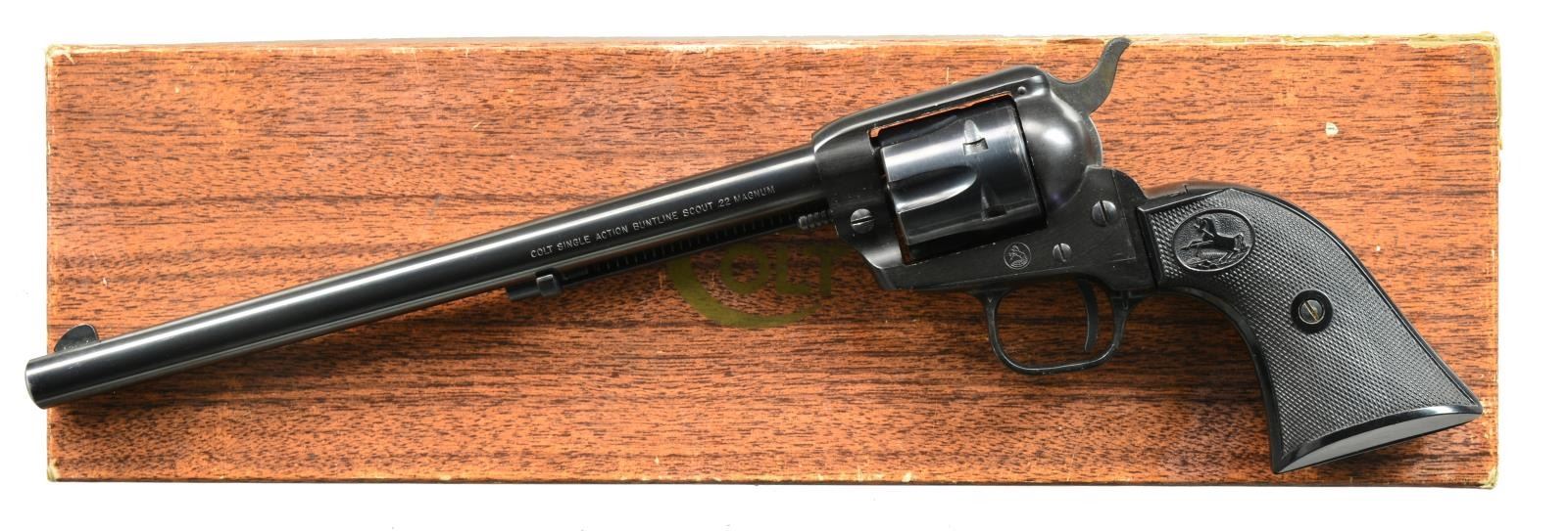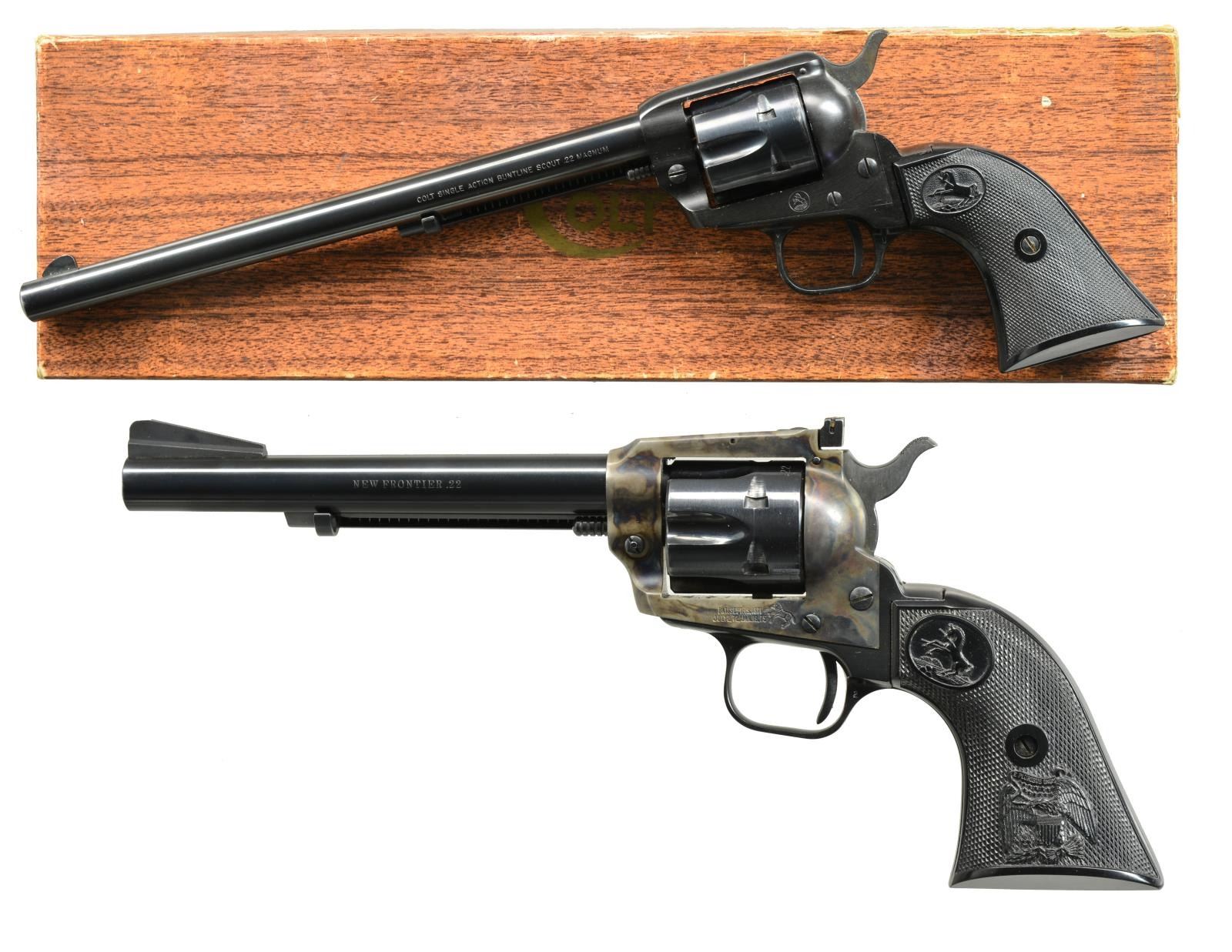 1) BUNTLINE SCOUT. Cal. 22 Mag. S# 136648F. Bbl. 9 1/2" w/ blade front sight. 6 Shot fluted cyl. Alloy frame. 2 Piece checkered Rampant Colt grips. UNATTACHED ACCESSORIES: 2 piece wood grain box w/ non matching S#. CONDITION: bbl., cyl. & ejector retain 97% blue showing light muzzle & edge wear. Alloy frame has 98% black anodized finish showing sm. marks around top strap. Very good grips. Bright near excellent bore. (20-2322/DS). CURIO. 2) NEW FRONTIER. Cal. 22 LR. S# L17900. Bbl. 6". Serrated ramp front sight & square notch adj. rear sight. 6 Shot fluted cyl. Blued bbl. & cyl. w/ case colored frame & anodized alloy grip straps & trigger guard. 2 Piece checkered eagle grips. 1974 Mfg. UNATTACHED ACCESSORIES: blue pocket sized instruction manual. CONDITION: 98% metal finish showing slight muzzle wear. Very good grips. Bright bore w/ sharp rifling. PROVENANCE: The Estate of Richard Willman. (20-2334/DS). MODERN. $800-1,200.