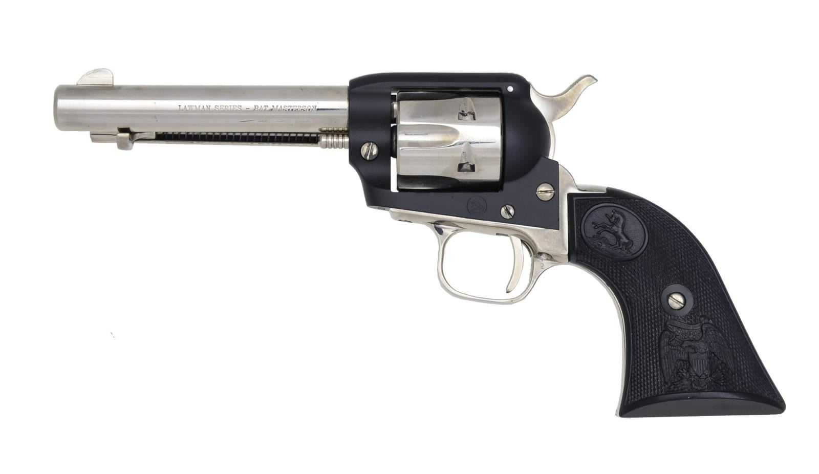 Cal. 22 LR. S# 29258F. Bbl. 4 3/4" w/ blade sight. Left side of bbl. marked "LAWMAN / BAT MASTERSON". Bbl. is fitted to a standard Frontier Scout receiver w/ matte black finish. Bbl., ejector housing, 6 shot fluted cyl., hammer, trigger & grip straps are nickel finished. 2 Piece checkered plastic eagle grips. 1958 Mfg. CONDITION: over 95% metal finish. Very good grips. Bore retains good rifling showing some lead fouling. PROVENANCE: Collection of Alan Bradley Shepherd. (20-4038/DS). CURIO. $300-500.