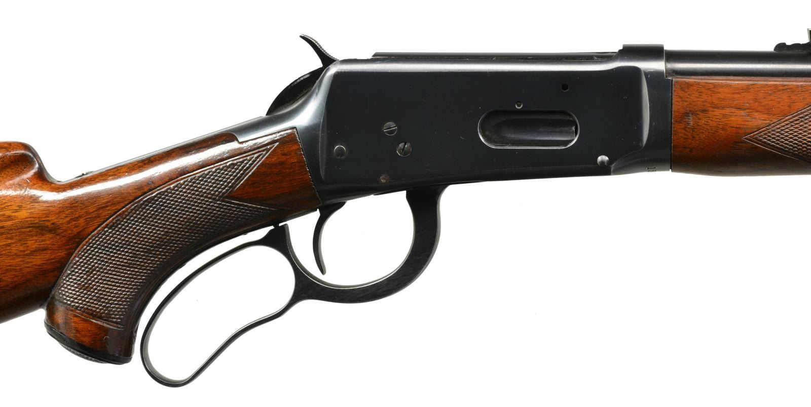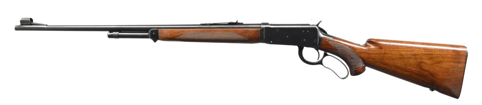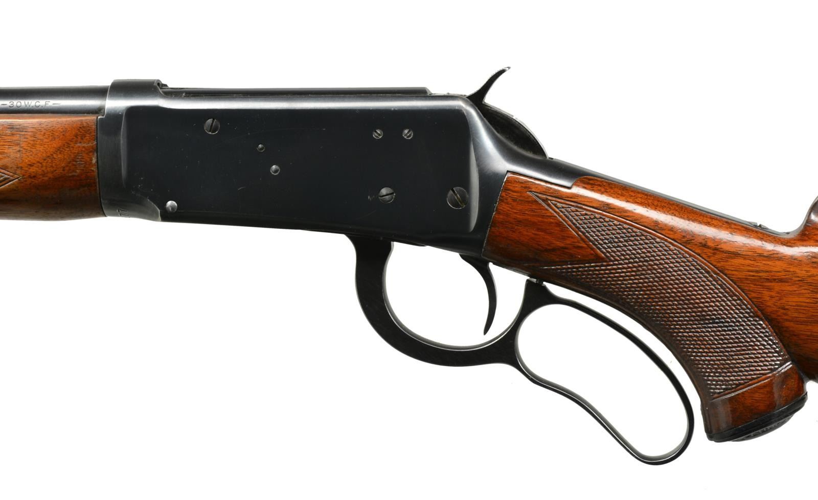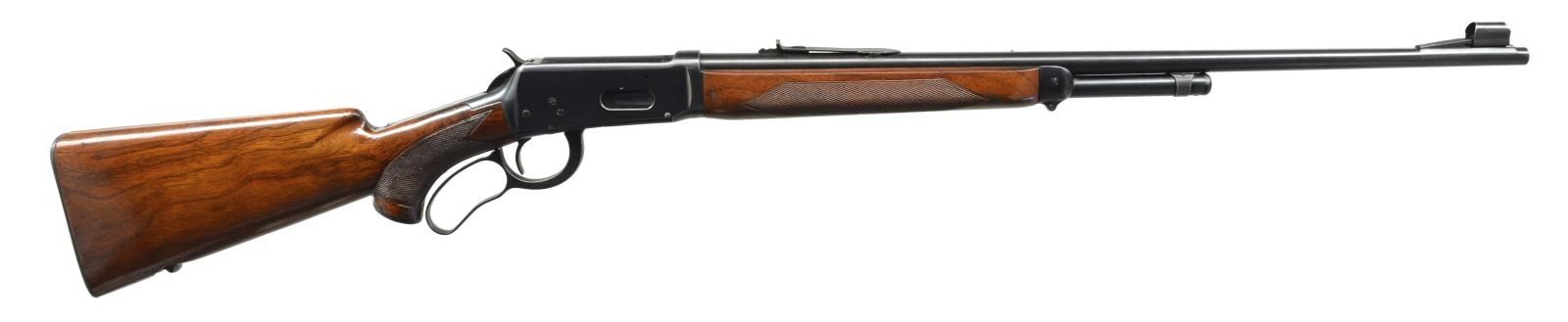 Cal. 30 WCF. S# 1566877. Bbl. 24" tapered rnd. Ramp mounted hooded bead front sight w/ replacement flat top elevator adj. sporting rear sight. 2/3 Length mag. Checkered walnut forearm & hard rubber capped pistol grip stock w/ Super Grade swivel bases & checkered steel buttplate. Mfg. around the time of WWII. CONDITION: over 90% blue showing mild edge wear. Forearm has lightly worn finish showing handling marks w/ a crack extending from left side of forearm tip. Stock has added coat of varnish over scratches & marks w/ an added wood repair at toe. Sound mechanics. Bore is bright w/ strong rifling. (20-1905/DS). CURIO. $1,500-2,250.