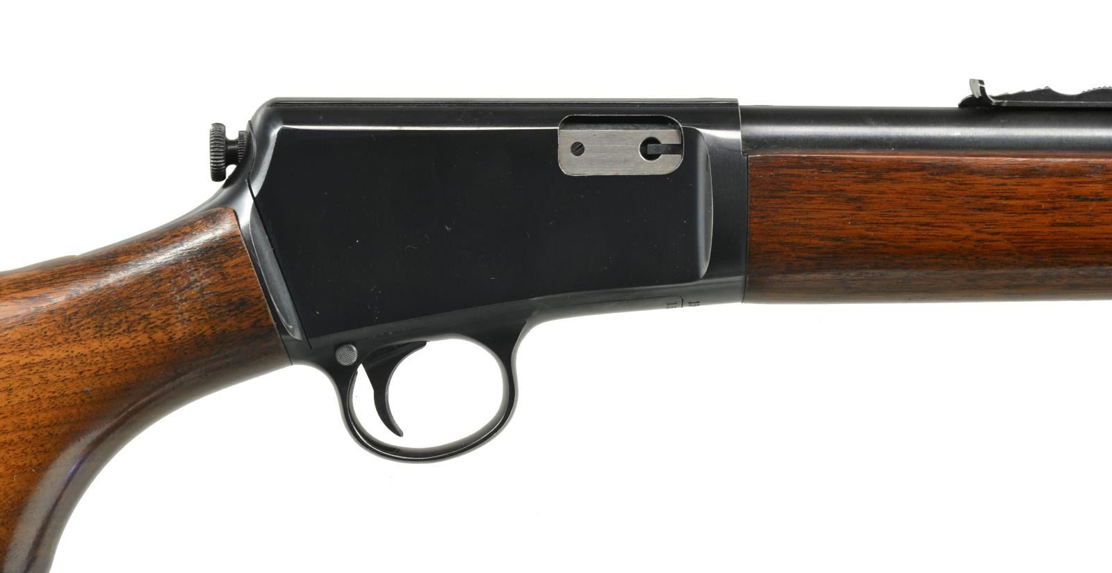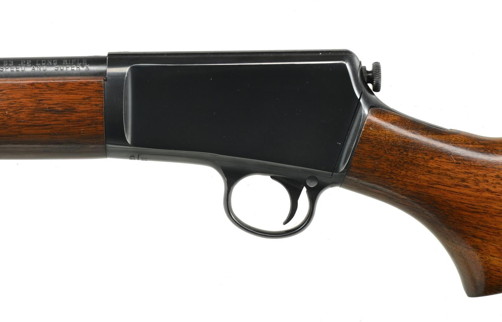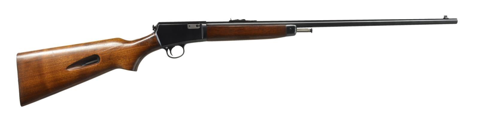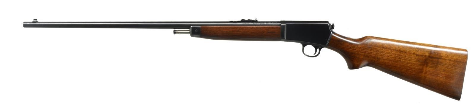 W/ HANGING TAG. Cal. 22 LR. S# 159122A. Bbl. 23". Dovetail front sight w/ silver bead. Dovetail adj. rear sight. Standard uncheckered forend. Uncheckered pistol grip stock w/ checkered steel buttplate. UNATTACHED ACCESSORIES: original hanging tag. CONDITION: bbl. retains nearly all original blue. Groove top receiver retains nearly all original blue w/ minor thinning on sharp corners. Forend has original finish as well as buttstock. Bore is bright. (20-1714/BT). CURIO. $1,200-1,800.