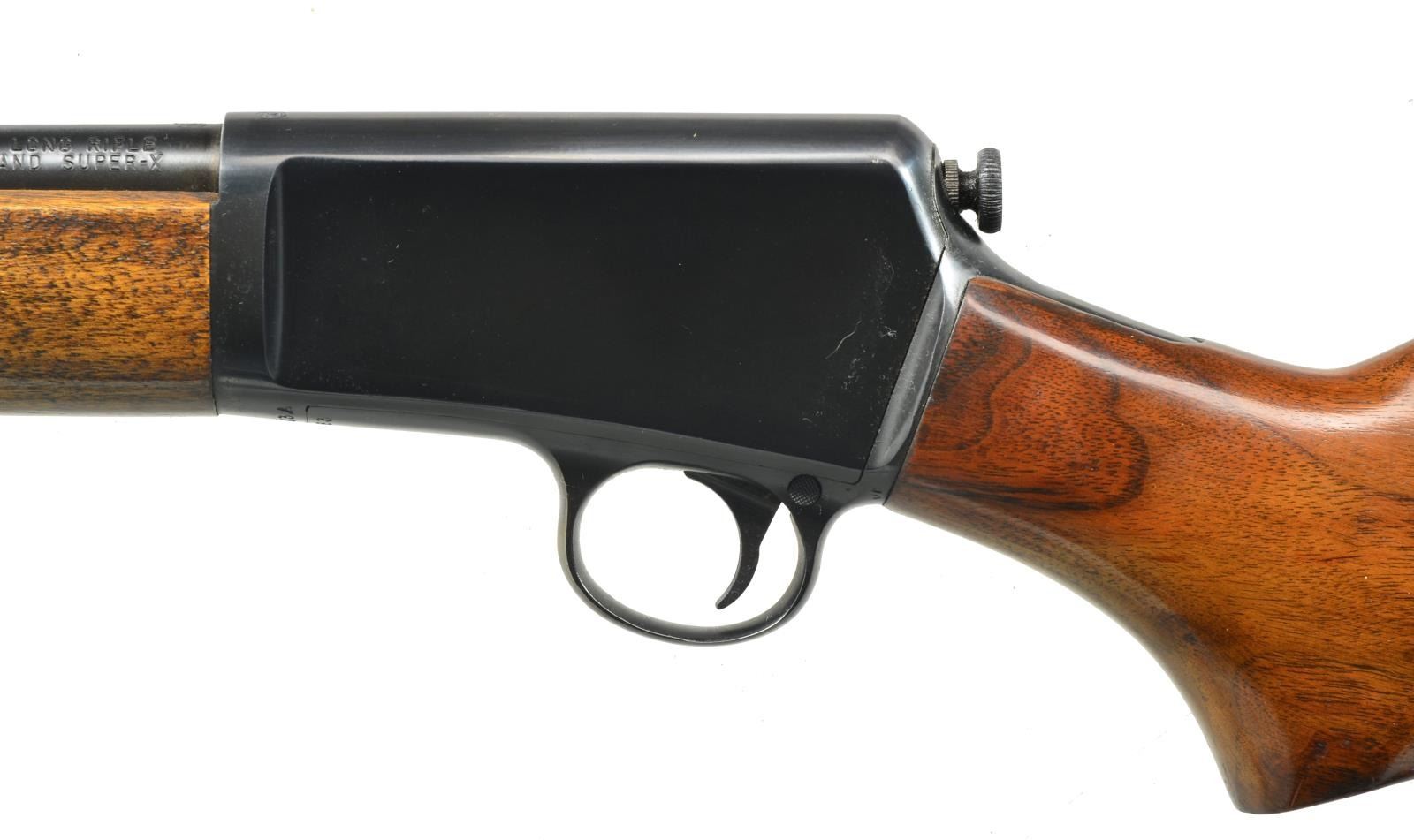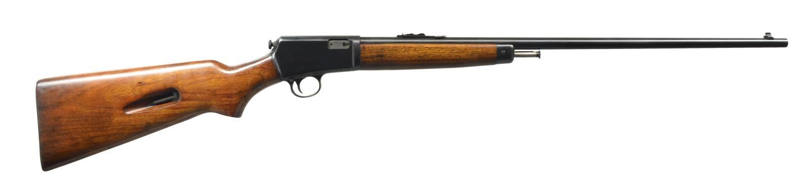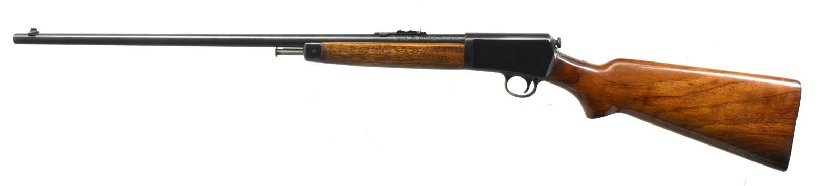 Cal. 22 LR. S# 120083A. Bbl. 23" rnd. Dovetail bead front, dovetail adjustable rear. Round top receiver. Uncheckered forend & uncheckered pistol grip stock w/ checkered steel buttplate. CONDITION: bbl. retains most of its original blue w/ a couple very sm. spots surface oxidation. Receiver has most of its original blue w/ some faint sharp edge wear. Forend has original finish w/ some minor handling marks & slight thinning from hand worn patina. Buttstock has original finish w/ a few minor handling marks. Bore is bright. (20-3153/BT). CURIO. $500-800.