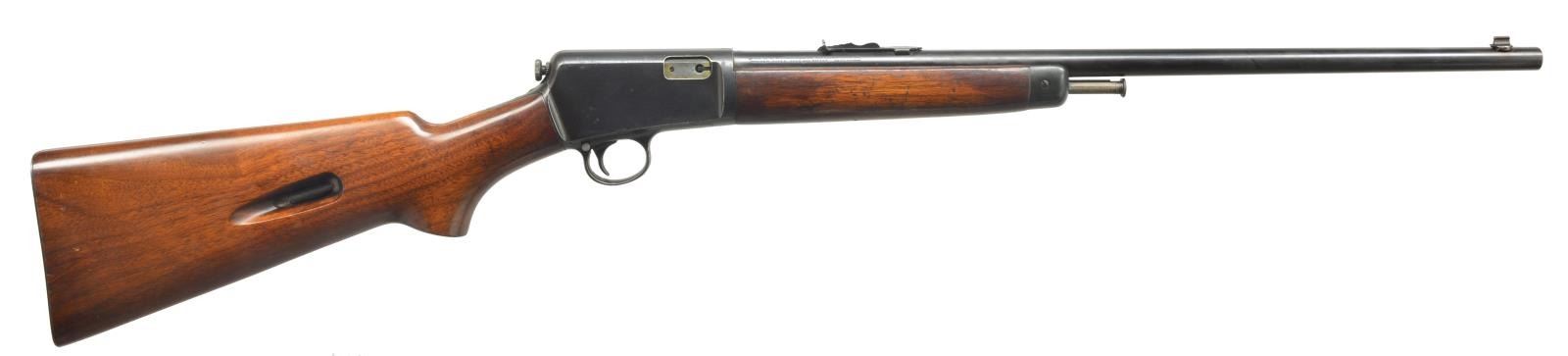 Cal. 22 S, L, LR. S# 2218. This popular little rifle has a 20" rnd. bbl. w/ pressed rear & gold bead front sights. Winchester nomenclature is on left rear. Nicely machined semi auto action is blued. American walnut stocks are uncheckered w/ tubular mag. in butt loading through opening in right side. CONDITION: very good. Metal parts retain most of their original blue w/ considerable freckling on action & addition of cold blue. Stocks have most of their original finish w/ numerous marks & scratches & a considerable amount of bumps on forend. Bright shiny bore. (20-3993/MGM). CURIO. $350-500.