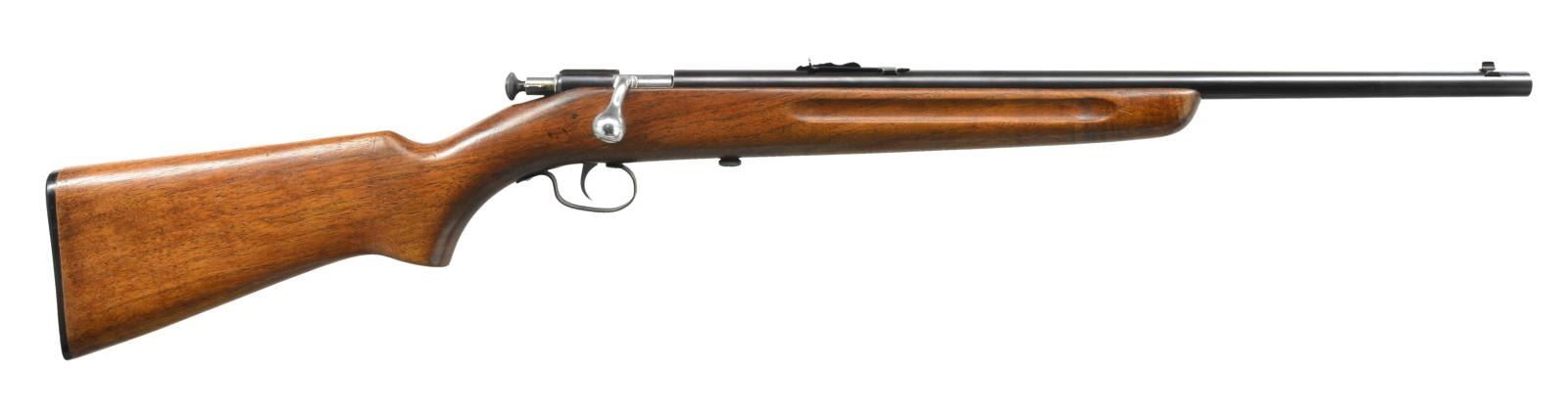 Cal. 22 S, L, LR. NSN. Bbl. 20". Dovetail peep front sight. Dovetail adj. rear sight. Finger grooved stock w/ LOP: 12". CONDITION: bbl. retains nearly all original blue. Finger groove stock has original finish w/ minor ding on left side of pistol grip & hand ware in forend area. Bore is bright. (20-1717/BT). CURIO. $400-700.