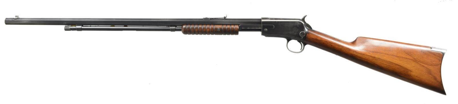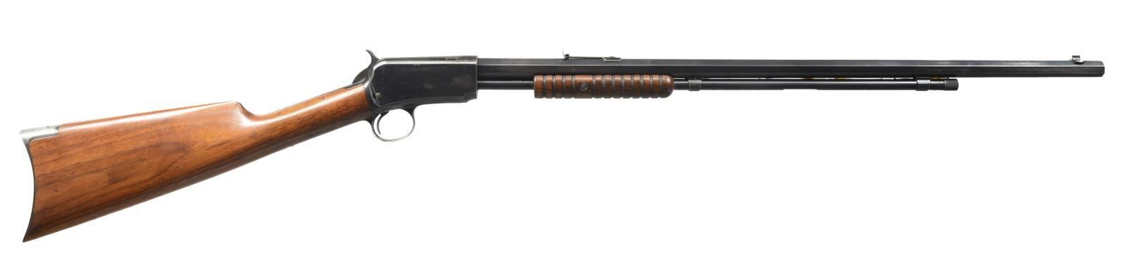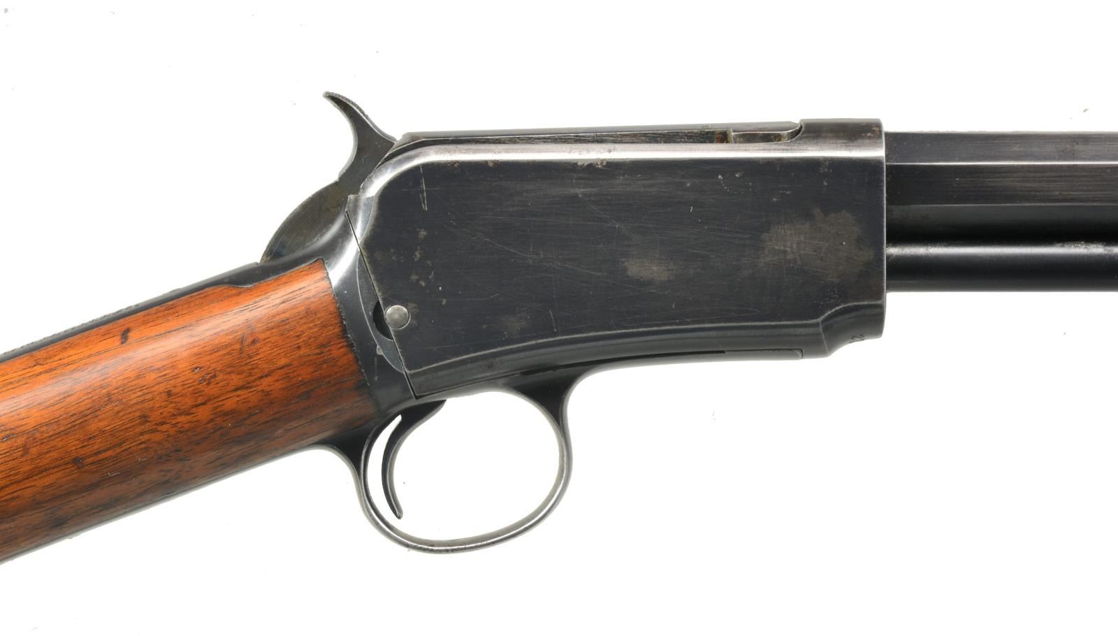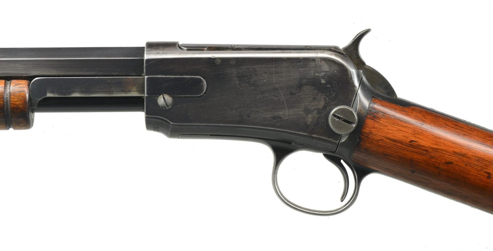 Cal. 22 WRF. S# 279616. Bbl. 24" oct. Dovetail bead front, screw on adjustable rear. Marked "Pat. Jan. 29. 1901." Standard 12 ring forend. CONDITION: bbl. retains good original blue w/ some thinning on sharp edges & minor cleaned areas near muzzle. Receiver has original blue w/ wear on sharp edges & sm. cleaned area on left side. Uncheckered stock has original finish w/ a few minor handling marks. Buttplate has worn & turned to silver patina. Bore is good. (20-3136/BT). CURIO. $500-800.