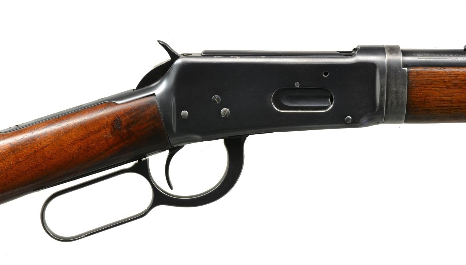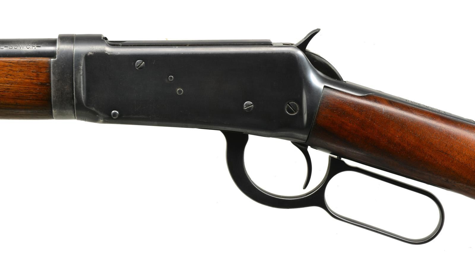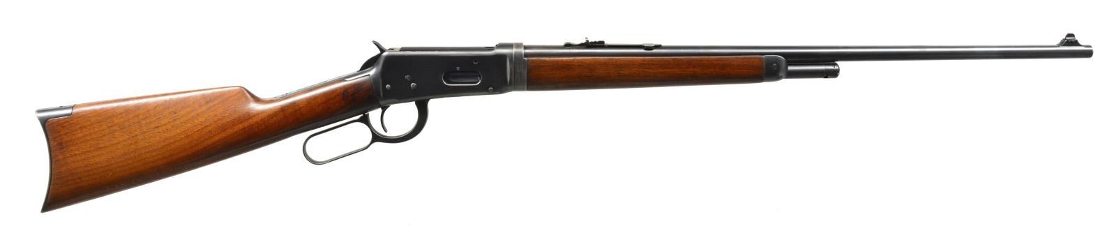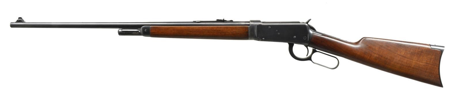 Cal. 30 WCF. S# 1039124. Bbl. 24". Takedown style half length mag. Ramp mounted Marbles 37W front sight w/ original flat top sporting rear sight. Walnut forearm & replacement straight grip stock w/ crescent steel buttplate. CONDITION: bbl. has 80% lightly worn original blue. Action is polished & reblued retaining 70% dull lightly faded finish showing spots of pitting. Stock & forearm are sanded & refinished showing lightly rounded edges & handling marks. Toeline of stock has an added diamond shaped silver inlay forward of buttplate. Sound mechanics. Bore retains sound lightly worn rifling. (20-1788/DS). CURIO. $600-900.