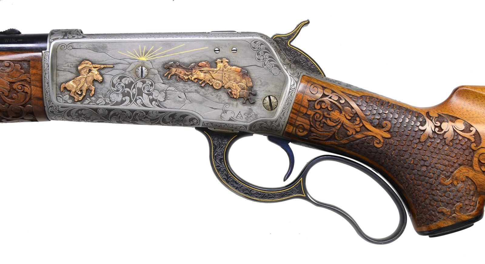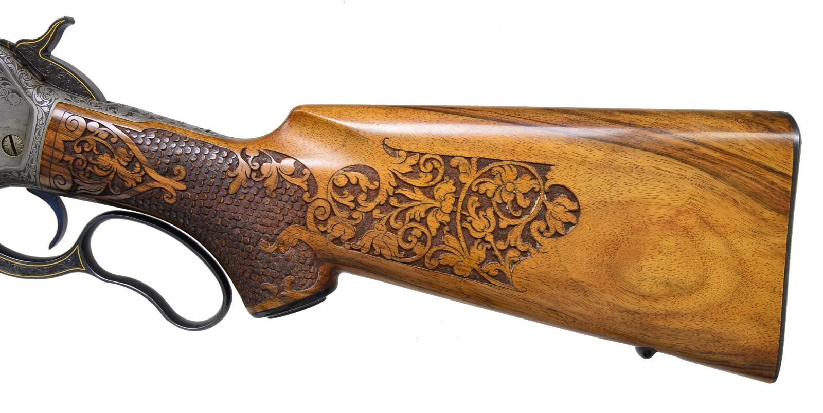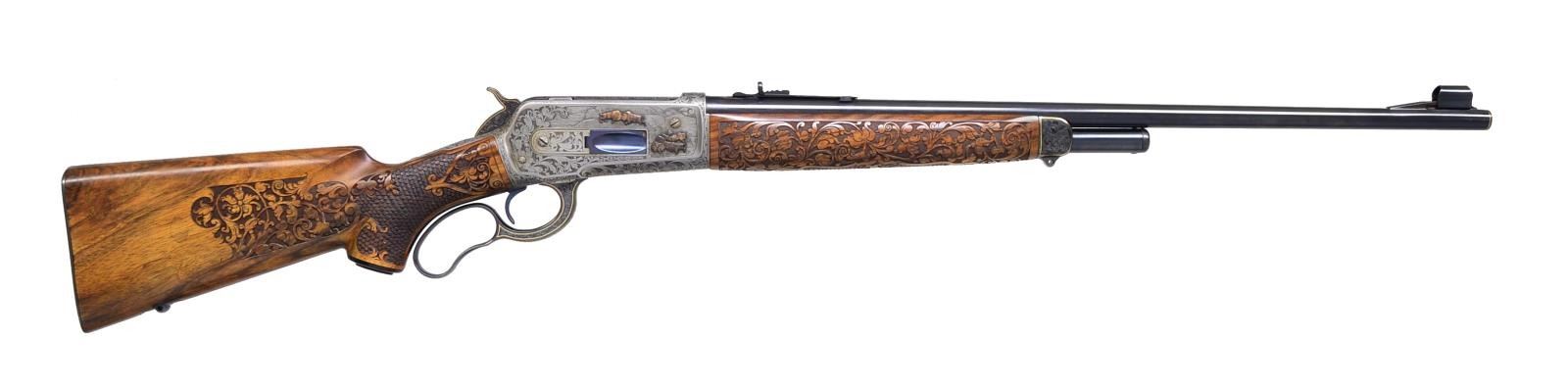 EMMA ACHELEITHNER WITH MAY 1977 GUNS MAGAZINE FEATURE. Cal. 348 Win. S# 46953. Bbl. 24" rnd., ramp front w/ hood & bead sight, dovetail adjustable rear. Gun is completely custom done w/ carved wood & engraved & gold inlaid receiver. Bbl. has a minimal amount of scroll inlaid in gold just behind the rear sight. The nosecap is scroll engraved w/ gold wire all around & sling swivel stud. Forend is completely carved w/ vines, flowers & acorns. Bottom middle has fish scales surrounding a flower blossom. Receiver is engraved on left side w/ a Indian on horseback w/ rifle chasing a stagecoach & a gold inlaid sunrise in the distance. The engraving appears to be rose gold. The right side has 2 buffalo fighting & a small group of buffalo. Hammer, lever & bolt are scroll engraved w/ gold wire borders. Buttstock is fish scale carved w/ flowers, fleur-de-lis & vines. Pistol grip has a Winchester marked grip cap & checkered steel buttplate w/ inlet sling swivel stud. Mfg. 1957; last year of production. CONDITION: bbl. has a great custom blue & retains nearly all of it w/ gold band at muzzle. Receiver is French grey. Forend has its custom finish w/ a few minor handling marks. Buttstock has its custom finish w/ a few nicks & scratches. Bore is shiny. (20-3156/BT). CURIO. $2,500-3,500.