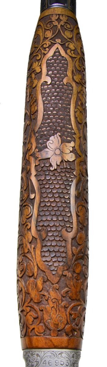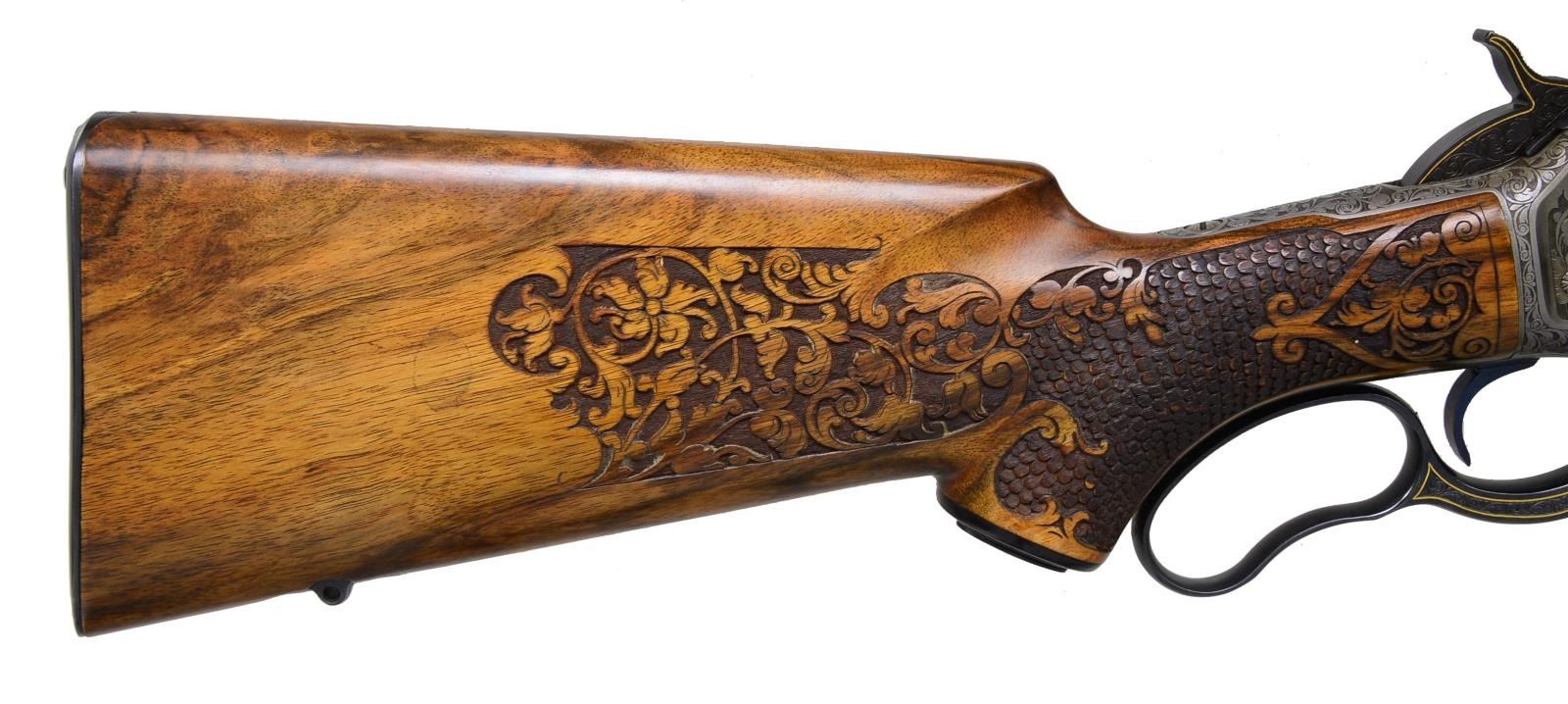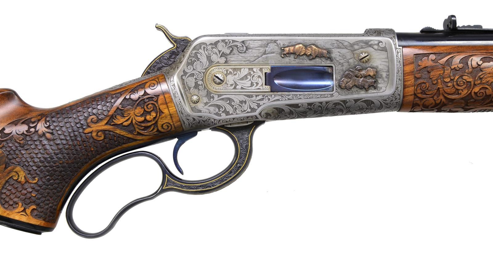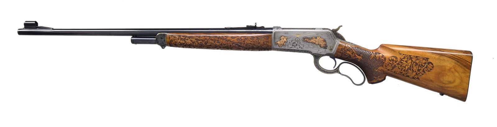 EMMA ACHELEITHNER WITH MAY 1977 GUNS MAGAZINE FEATURE. Cal. 348 Win. S# 46953. Bbl. 24" rnd., ramp front w/ hood & bead sight, dovetail adjustable rear. Gun is completely custom done w/ carved wood & engraved & gold inlaid receiver. Bbl. has a minimal amount of scroll inlaid in gold just behind the rear sight. The nosecap is scroll engraved w/ gold wire all around & sling swivel stud. Forend is completely carved w/ vines, flowers & acorns. Bottom middle has fish scales surrounding a flower blossom. Receiver is engraved on left side w/ a Indian on horseback w/ rifle chasing a stagecoach & a gold inlaid sunrise in the distance. The engraving appears to be rose gold. The right side has 2 buffalo fighting & a small group of buffalo. Hammer, lever & bolt are scroll engraved w/ gold wire borders. Buttstock is fish scale carved w/ flowers, fleur-de-lis & vines. Pistol grip has a Winchester marked grip cap & checkered steel buttplate w/ inlet sling swivel stud. Mfg. 1957; last year of production. CONDITION: bbl. has a great custom blue & retains nearly all of it w/ gold band at muzzle. Receiver is French grey. Forend has its custom finish w/ a few minor handling marks. Buttstock has its custom finish w/ a few nicks & scratches. Bore is shiny. (20-3156/BT). CURIO. $2,500-3,500.