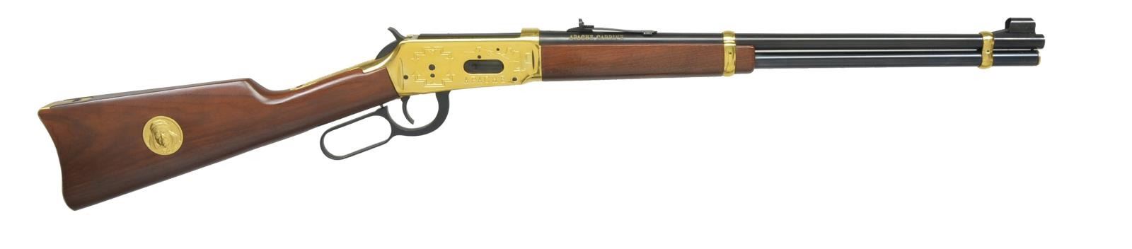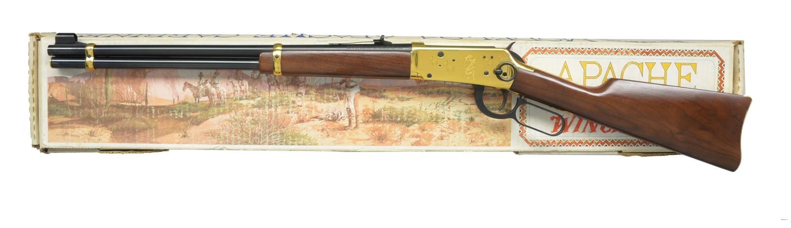 Cal. 30-30. S# AC3328. Bbl. 20". Right side of bbl. has gold marking "Apache Carbine". Action, carbine buttplate, mag. cap & bbl. bands have gold anodized finish. Right side of receiver shows desert scene w/ apache symbols & inscription "APACHE". Left side has saddle ring w/ kneeling of Apache rifleman & 4 Apache figures depicting game animals. Hooded ramp bead front sight w/ sporting rear sight. Walnut forearm & straight grip stock. Left side of stock has gold medallion showing Apache warrior. 8,600 Mfg. in 1974 for sale in Western Europe. UNATTACHED ACCESSORIES: original box w/ apache scene on lid. Box contains warranty papers. CONDITION: near new retaining over 99% metal finish. Stocks show a few sm. marks. Near excellent bore. (20-3962/DS). CURIO. $600-900.