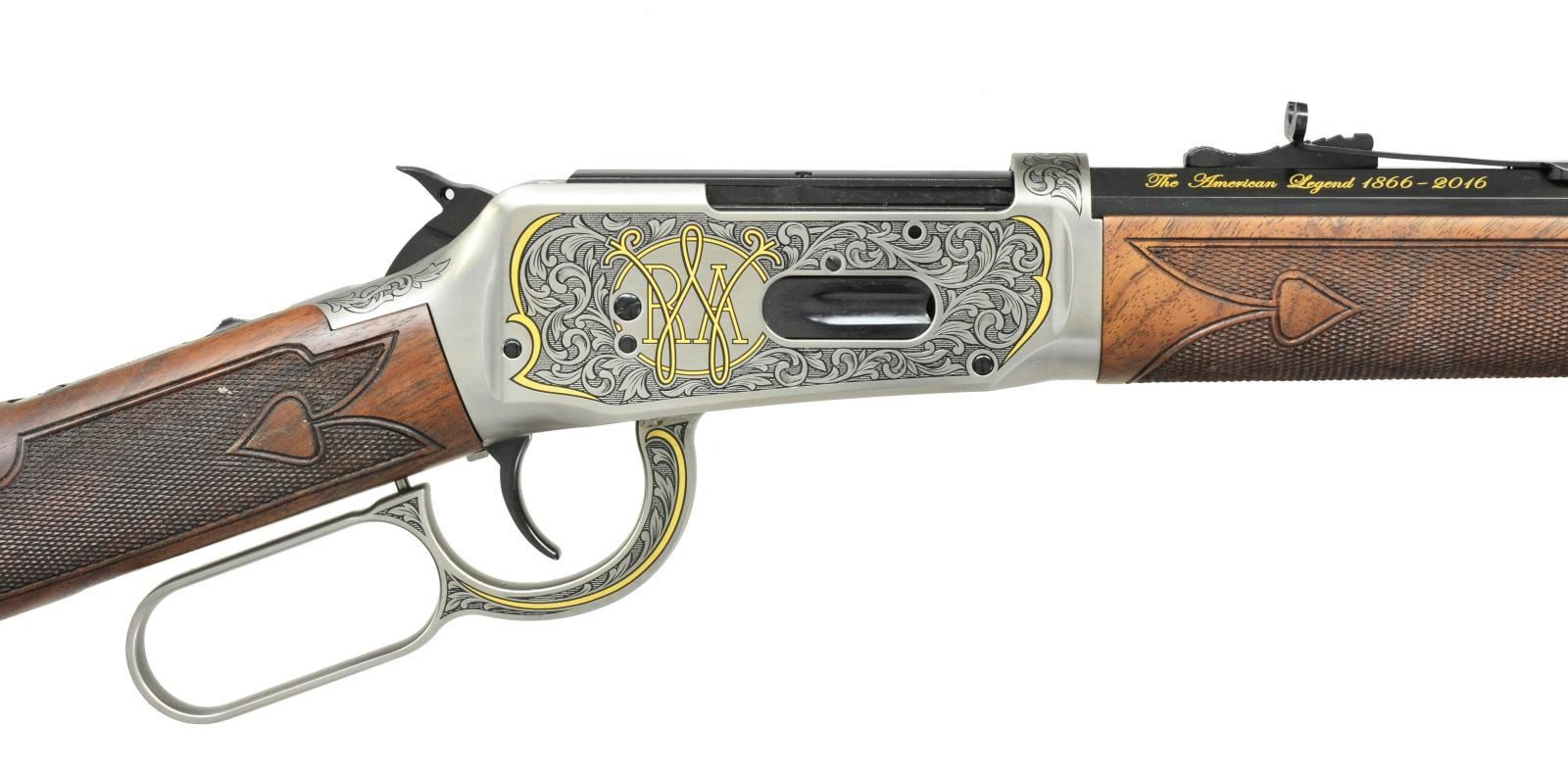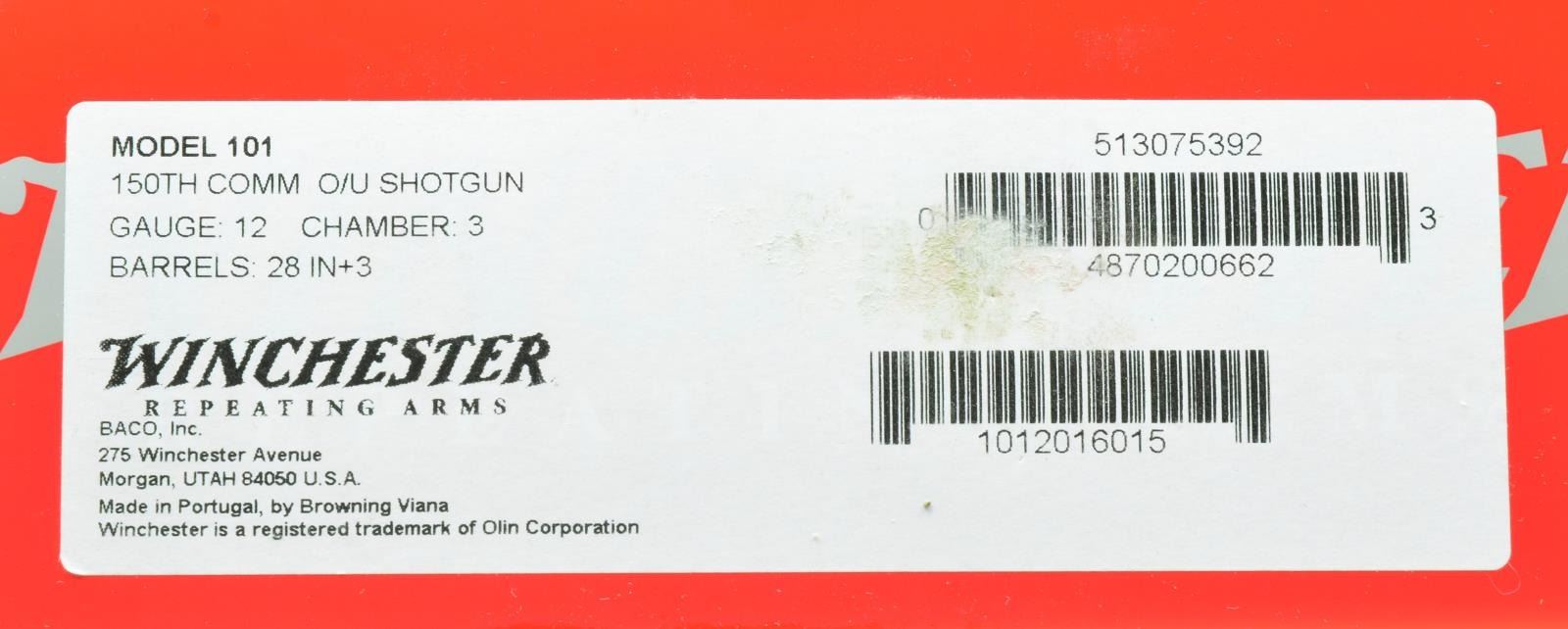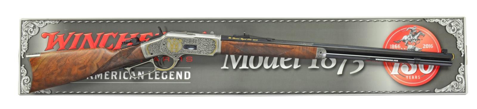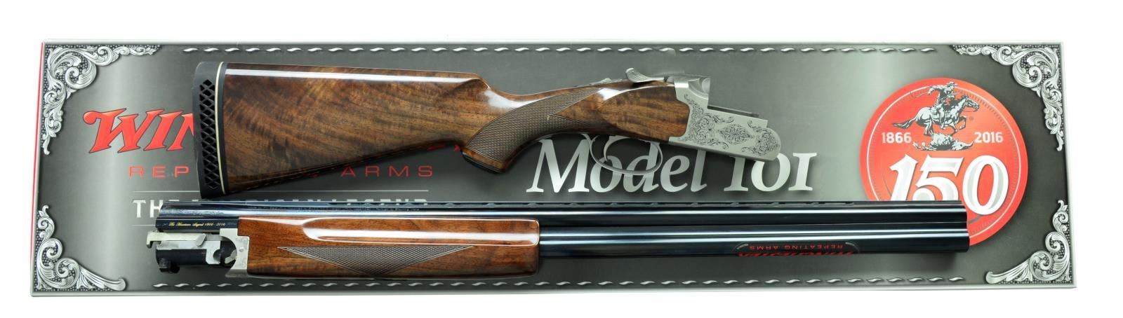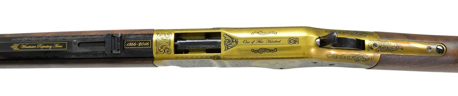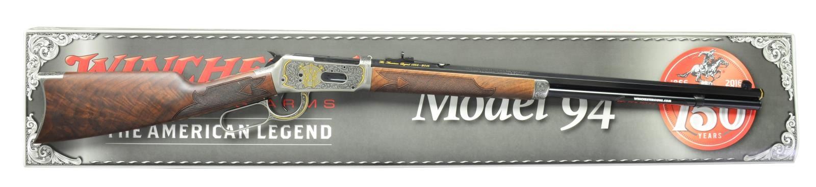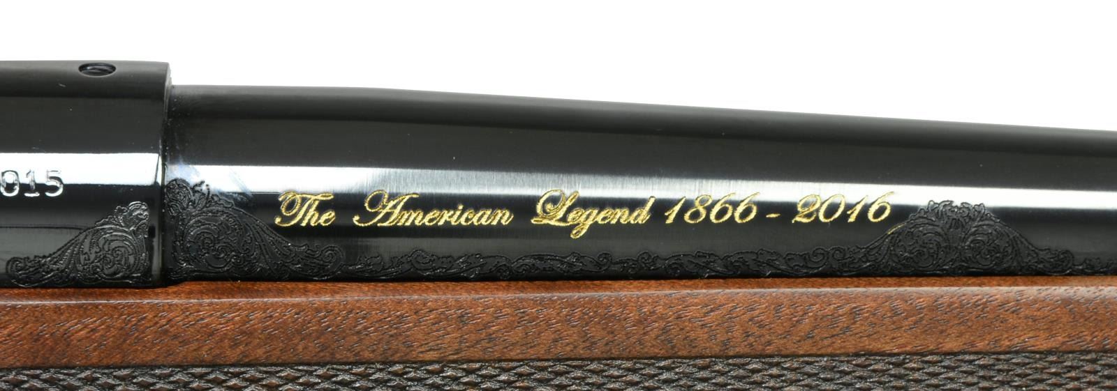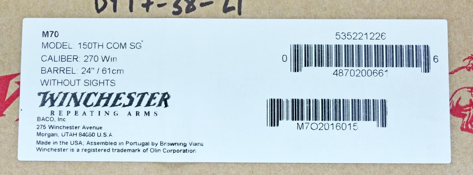In 2016, the Winchester brand celebrated it's 150th Anniversary. To commemorate this historic milestone, five very special firearms were offered in a limited quantities. This complete set is Number 15 of 500 sets produced. Consignor supplied information from a Browning Rep. indicates that very few sets remain intact as most guns were sold individually by dealers. 1) MODEL 1866 LEVER ACTION RIFLE. Cal. 44-40. S# M662016015. Bbl. 24" tapered oct. w/ gold band at muzzle. Top flat has gold inscription "Winchester Repeating Arms 1866 - 2016". Breech end of bbl. & brass action have vine type foliate scroll ornamentation w/ punch dot style backgrounds. Right sideplate has Winchester Horse & Rider. Left sideplate has "WRA" marking. Top of receiver is marked "One of Two Hundred". Full mag. Rocky Mountain style front sight w/ graduated folding leaf rear sight. Satin finished fancy walnut forearm & stock w/ brass crescent buttplate. UNATTACHED ACCESSORIES: original box w/ decorative sleeve containing trigger lock. CONDITION: as new & unfired. (20-1891/DS). 2) MODEL 1873 LEVER ACTION RIFLE. Cal. 44-40. S# 150A730015. Bbl. 24" tapered oct. w/ gold band at muzzle. Right bbl. flat has gold inscription "The American Legend 1866 - 2016". Satin nickel receiver w/ vine type ornamentation having gold plated highlights & figures. Left side of receiver has Winchester Horse & Rider w/ markings "1866 - 2016 / 150 YEARS". Right side has gold "WRA". Features include full length mag., brass bead blade front sight w/ sporting rear sight & Marble Arms tang sight. Satin finished fancy walnut rifle stocks w/ cut checkering & crescent steel buttplate. UNATTACHED ACCESSORIES: original box w/ decorative sleeve containing trigger lock, instruction manual, safety brochure, purchase confirmation & NRA offer. CONDITION: as new & unfired. (20-1892/DS). 3) MODEL 94 LEVER ACTION RIFLE. Cal. 30-30. S# M942016015. Bbl. 24" tapered oct. w/ single gold band at muzzle. Right bbl. flat has gold inscription "The American Legend 1866 - 2016". Satin nickel colored action has vine type ornamentation w/ gold plated highlights & figures. Left side has Winchester Horse & Rider w/ markings "1866 - 2016 / 150 YEARS". Left side has gold "WRA". Features include brass bead front sight, sporting rear sight, angle eject action w/ top tang sliding safety & full mag. Satin finished walnut rifle stocks w/ crescent steel buttplate & spade pattern cut checkering. UNATTACHED ACCESSORIES: original box w/ decorative sleeve containing trigger lock, hammer extension, instruction manual, safety brochure, purchase confirmation & NRA offer. CONDITION: as new & unused. (20-1893/DS) 4) MODEL 101 O/U SHOTGUN. Cal. 12 Ga. S# 1012016015. Bbls. 28" VR w/ Invector-Plus interchangeable chokes; IC, mod. & full choke tubes included. White front bead. Satin gray finished boxlock action w/ scroll ornamentation. Bottom of receiver has gold Winchester Horse & Rider w/ marking "1866 - 2016 / 150 YEARS". Trigger guard bow has "WRA" marking. Single selective trigger. Selective ejectors. Gloss finished walnut finger groove forearm & capped pistol grip stock w/ black ventilated Winchester pad. Grip cap is engraved on bottom w/ gold line around base. UNATTACHED ACCESSORIES: original box containing spare choke tube, wrench, chamber lock, instruction manual, safety brochure & NRA offer. CONDITION: new & unfired. (20-1894/DS). 5) MODEL 70 BOLT ACTION RIFLE. Cal. 270 Win. S# M702016015. Bbl. 24" w/out sights. Right side of bbl. has gold inscription "The American Legend 1866 - 2016". Muzzle of bbl. has single gold band. Breech end of bbl. has foliate scroll matching the receiver, floorplate & trigger guard. Left side of receiver has gold "WINCHESTER". Floorplate has gold Winchester Horse & Rider w/ markings "1866 - 2016 / 150 YEARS". Trigger guard bow has gold "WRA". Steel grip cap has gold band around base w/ matching engraving. Bolt body is jeweled. Classic style cheekpiece stock of satin finished fancy walnut w/ ebony forearm tip & style A fleur de lis checkering. Stock features Supergrade style inletted 2 screw swivel bases & solid black recoil pad. UNATTACHED ACCESSORIES: original box w/ decorative sleeve containing trigger lock, instruction manual, safety brochure, purchase confirmation & NRA offer. CONDITION: as new & unused. (20-1895/DS). ALL MODERN. $20,000-30,000.