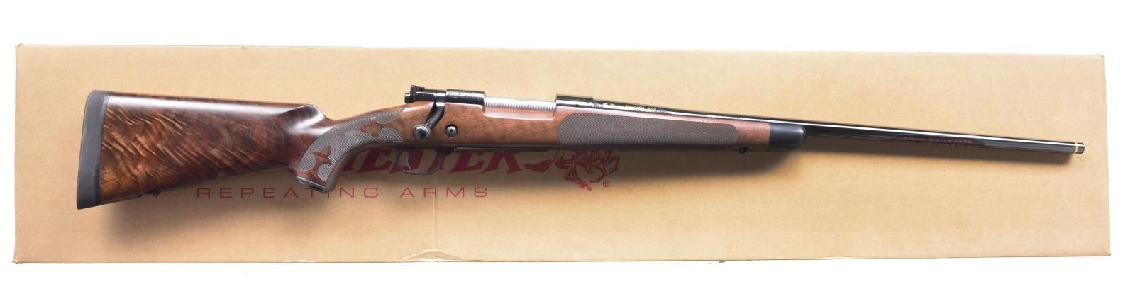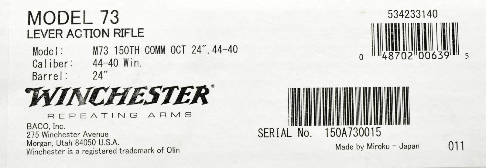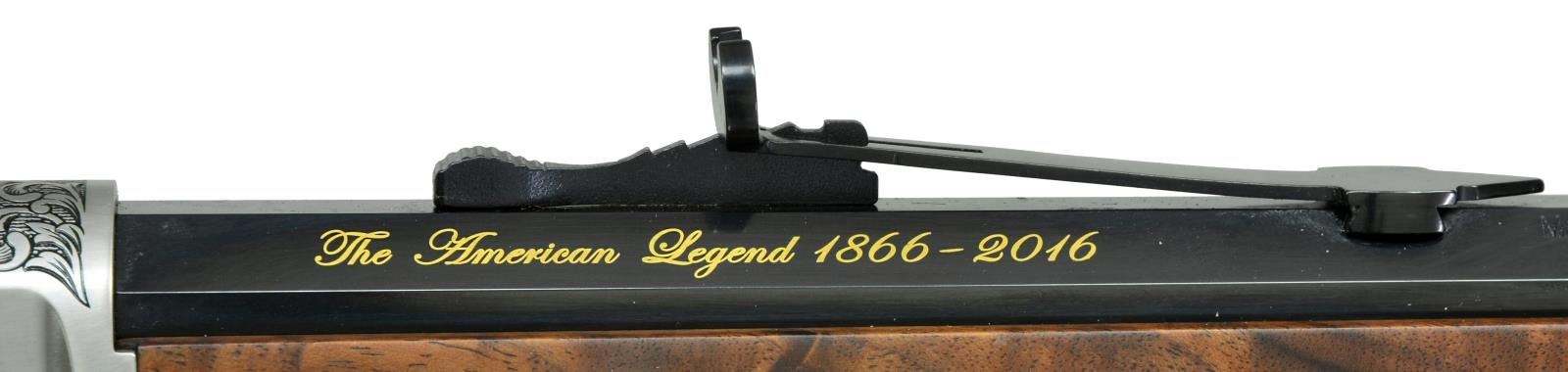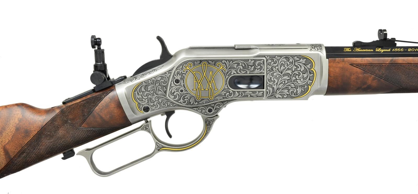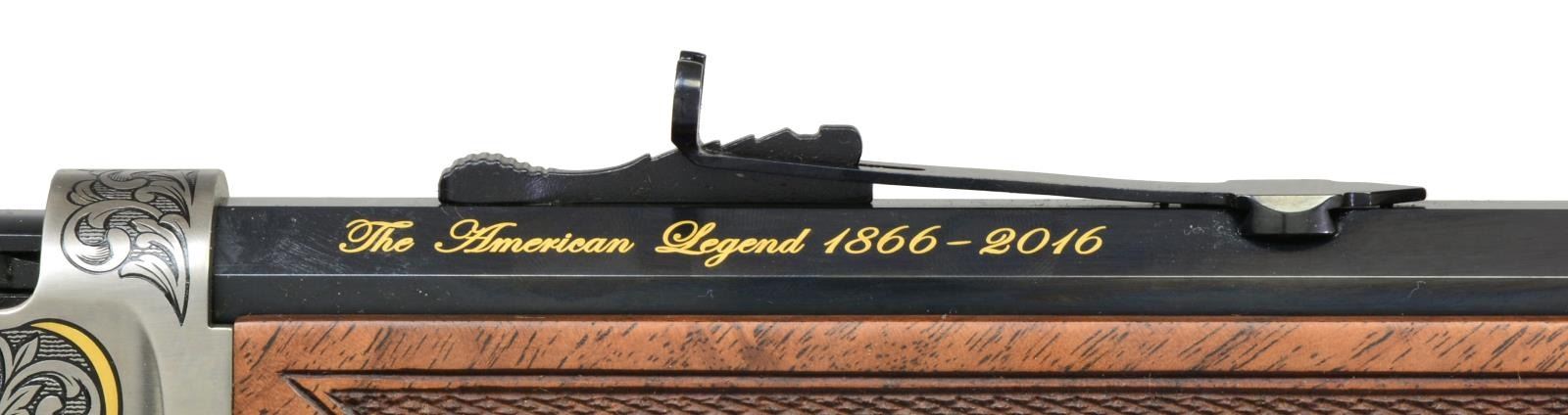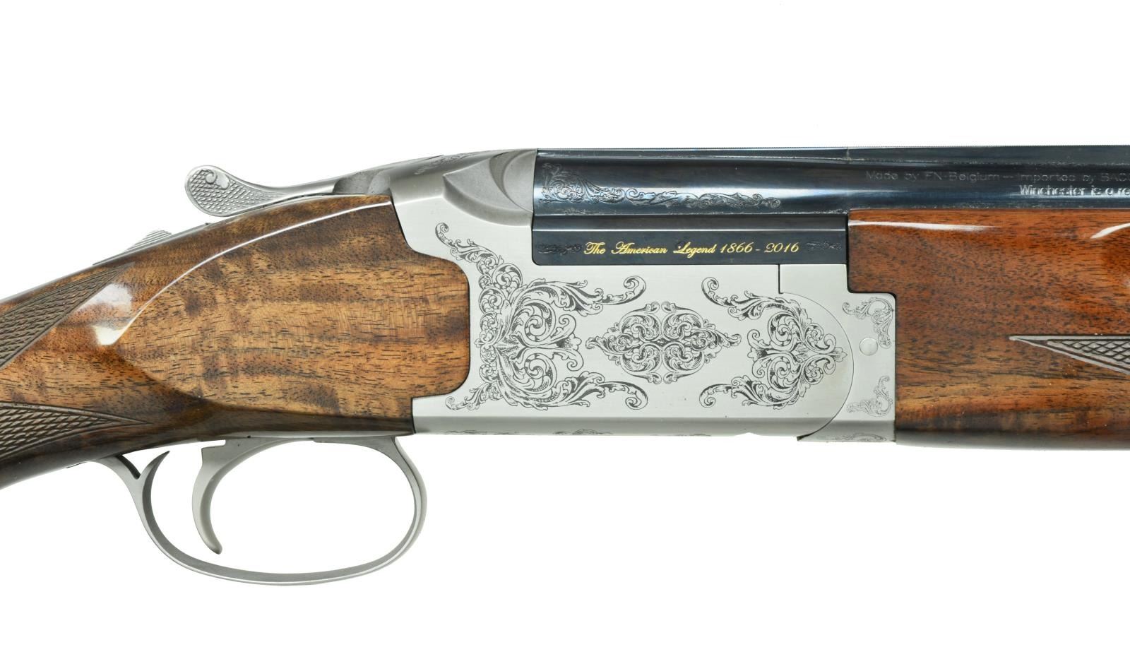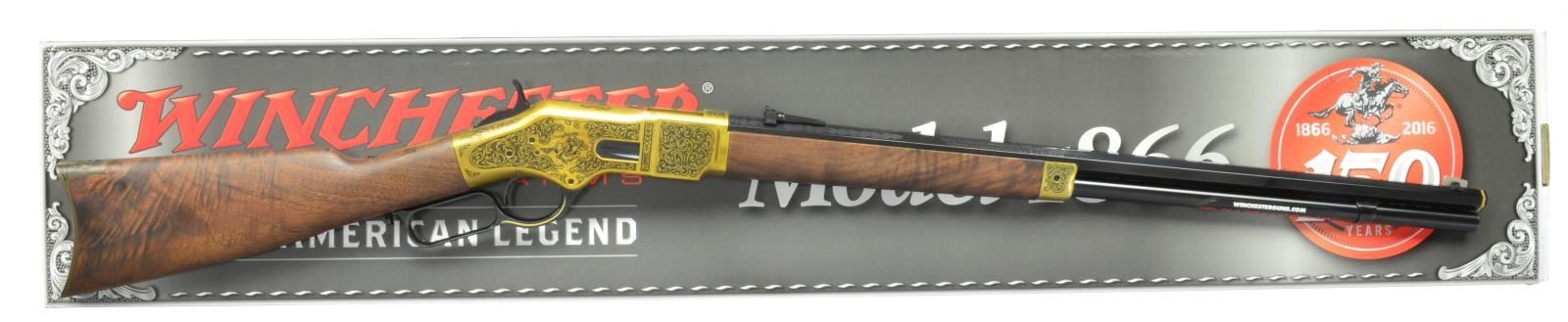 In 2016, the Winchester brand celebrated it's 150th Anniversary. To commemorate this historic milestone, five very special firearms were offered in a limited quantities. This complete set is Number 15 of 500 sets produced. Consignor supplied information from a Browning Rep. indicates that very few sets remain intact as most guns were sold individually by dealers. 1) MODEL 1866 LEVER ACTION RIFLE. Cal. 44-40. S# M662016015. Bbl. 24" tapered oct. w/ gold band at muzzle. Top flat has gold inscription "Winchester Repeating Arms 1866 - 2016". Breech end of bbl. & brass action have vine type foliate scroll ornamentation w/ punch dot style backgrounds. Right sideplate has Winchester Horse & Rider. Left sideplate has "WRA" marking. Top of receiver is marked "One of Two Hundred". Full mag. Rocky Mountain style front sight w/ graduated folding leaf rear sight. Satin finished fancy walnut forearm & stock w/ brass crescent buttplate. UNATTACHED ACCESSORIES: original box w/ decorative sleeve containing trigger lock. CONDITION: as new & unfired. (20-1891/DS). 2) MODEL 1873 LEVER ACTION RIFLE. Cal. 44-40. S# 150A730015. Bbl. 24" tapered oct. w/ gold band at muzzle. Right bbl. flat has gold inscription "The American Legend 1866 - 2016". Satin nickel receiver w/ vine type ornamentation having gold plated highlights & figures. Left side of receiver has Winchester Horse & Rider w/ markings "1866 - 2016 / 150 YEARS". Right side has gold "WRA". Features include full length mag., brass bead blade front sight w/ sporting rear sight & Marble Arms tang sight. Satin finished fancy walnut rifle stocks w/ cut checkering & crescent steel buttplate. UNATTACHED ACCESSORIES: original box w/ decorative sleeve containing trigger lock, instruction manual, safety brochure, purchase confirmation & NRA offer. CONDITION: as new & unfired. (20-1892/DS). 3) MODEL 94 LEVER ACTION RIFLE. Cal. 30-30. S# M942016015. Bbl. 24" tapered oct. w/ single gold band at muzzle. Right bbl. flat has gold inscription "The American Legend 1866 - 2016". Satin nickel colored action has vine type ornamentation w/ gold plated highlights & figures. Left side has Winchester Horse & Rider w/ markings "1866 - 2016 / 150 YEARS". Left side has gold "WRA". Features include brass bead front sight, sporting rear sight, angle eject action w/ top tang sliding safety & full mag. Satin finished walnut rifle stocks w/ crescent steel buttplate & spade pattern cut checkering. UNATTACHED ACCESSORIES: original box w/ decorative sleeve containing trigger lock, hammer extension, instruction manual, safety brochure, purchase confirmation & NRA offer. CONDITION: as new & unused. (20-1893/DS) 4) MODEL 101 O/U SHOTGUN. Cal. 12 Ga. S# 1012016015. Bbls. 28" VR w/ Invector-Plus interchangeable chokes; IC, mod. & full choke tubes included. White front bead. Satin gray finished boxlock action w/ scroll ornamentation. Bottom of receiver has gold Winchester Horse & Rider w/ marking "1866 - 2016 / 150 YEARS". Trigger guard bow has "WRA" marking. Single selective trigger. Selective ejectors. Gloss finished walnut finger groove forearm & capped pistol grip stock w/ black ventilated Winchester pad. Grip cap is engraved on bottom w/ gold line around base. UNATTACHED ACCESSORIES: original box containing spare choke tube, wrench, chamber lock, instruction manual, safety brochure & NRA offer. CONDITION: new & unfired. (20-1894/DS). 5) MODEL 70 BOLT ACTION RIFLE. Cal. 270 Win. S# M702016015. Bbl. 24" w/out sights. Right side of bbl. has gold inscription "The American Legend 1866 - 2016". Muzzle of bbl. has single gold band. Breech end of bbl. has foliate scroll matching the receiver, floorplate & trigger guard. Left side of receiver has gold "WINCHESTER". Floorplate has gold Winchester Horse & Rider w/ markings "1866 - 2016 / 150 YEARS". Trigger guard bow has gold "WRA". Steel grip cap has gold band around base w/ matching engraving. Bolt body is jeweled. Classic style cheekpiece stock of satin finished fancy walnut w/ ebony forearm tip & style A fleur de lis checkering. Stock features Supergrade style inletted 2 screw swivel bases & solid black recoil pad. UNATTACHED ACCESSORIES: original box w/ decorative sleeve containing trigger lock, instruction manual, safety brochure, purchase confirmation & NRA offer. CONDITION: as new & unused. (20-1895/DS). ALL MODERN. $20,000-30,000.
