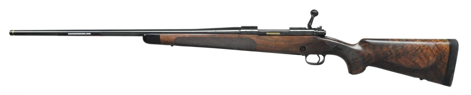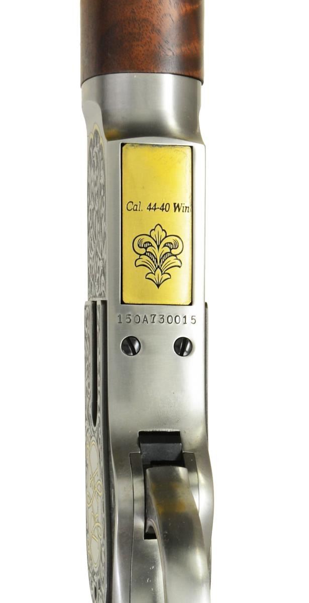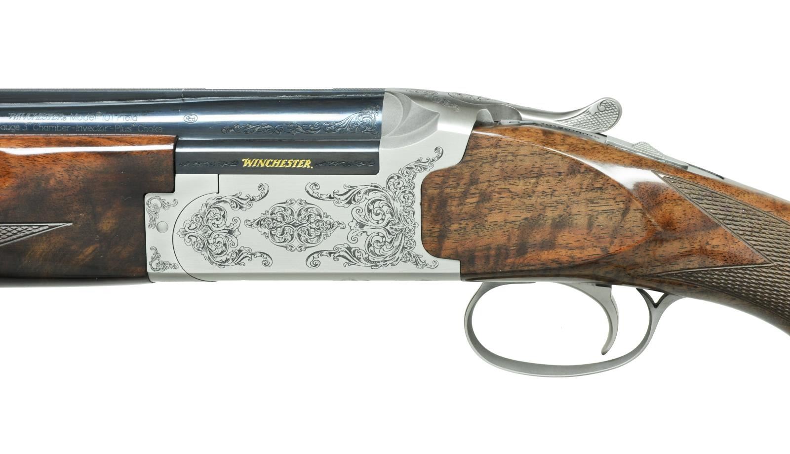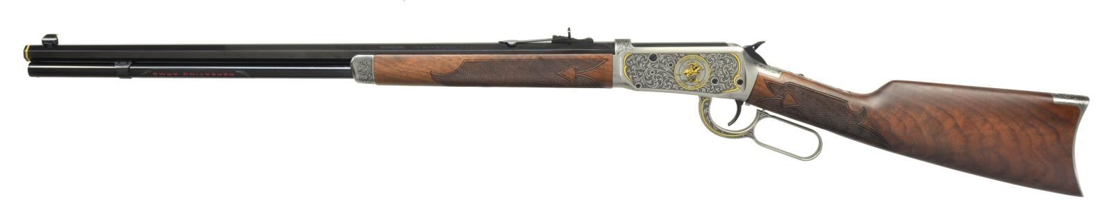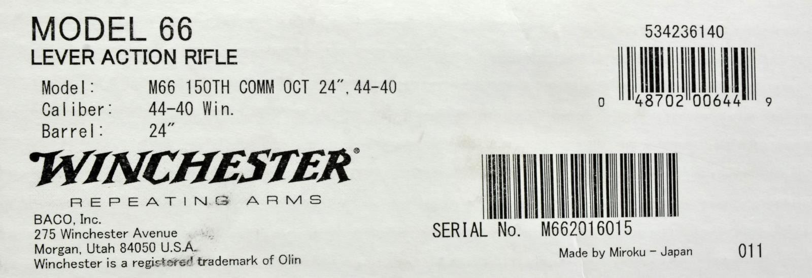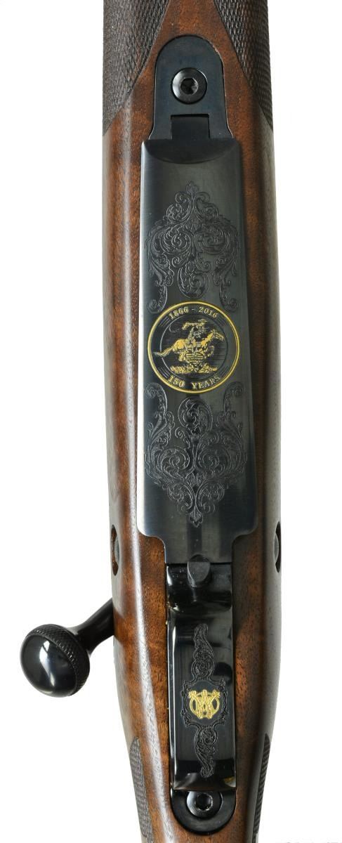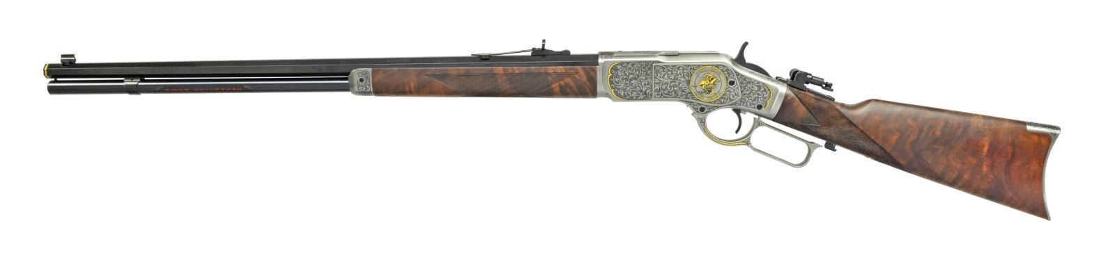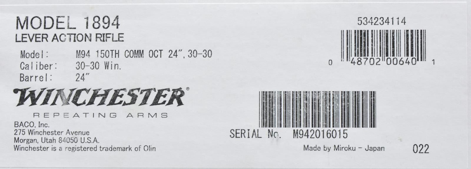 In 2016, the Winchester brand celebrated it's 150th Anniversary. To commemorate this historic milestone, five very special firearms were offered in a limited quantities. This complete set is Number 15 of 500 sets produced. Consignor supplied information from a Browning Rep. indicates that very few sets remain intact as most guns were sold individually by dealers. 1) MODEL 1866 LEVER ACTION RIFLE. Cal. 44-40. S# M662016015. Bbl. 24" tapered oct. w/ gold band at muzzle. Top flat has gold inscription "Winchester Repeating Arms 1866 - 2016". Breech end of bbl. & brass action have vine type foliate scroll ornamentation w/ punch dot style backgrounds. Right sideplate has Winchester Horse & Rider. Left sideplate has "WRA" marking. Top of receiver is marked "One of Two Hundred". Full mag. Rocky Mountain style front sight w/ graduated folding leaf rear sight. Satin finished fancy walnut forearm & stock w/ brass crescent buttplate. UNATTACHED ACCESSORIES: original box w/ decorative sleeve containing trigger lock. CONDITION: as new & unfired. (20-1891/DS). 2) MODEL 1873 LEVER ACTION RIFLE. Cal. 44-40. S# 150A730015. Bbl. 24" tapered oct. w/ gold band at muzzle. Right bbl. flat has gold inscription "The American Legend 1866 - 2016". Satin nickel receiver w/ vine type ornamentation having gold plated highlights & figures. Left side of receiver has Winchester Horse & Rider w/ markings "1866 - 2016 / 150 YEARS". Right side has gold "WRA". Features include full length mag., brass bead blade front sight w/ sporting rear sight & Marble Arms tang sight. Satin finished fancy walnut rifle stocks w/ cut checkering & crescent steel buttplate. UNATTACHED ACCESSORIES: original box w/ decorative sleeve containing trigger lock, instruction manual, safety brochure, purchase confirmation & NRA offer. CONDITION: as new & unfired. (20-1892/DS). 3) MODEL 94 LEVER ACTION RIFLE. Cal. 30-30. S# M942016015. Bbl. 24" tapered oct. w/ single gold band at muzzle. Right bbl. flat has gold inscription "The American Legend 1866 - 2016". Satin nickel colored action has vine type ornamentation w/ gold plated highlights & figures. Left side has Winchester Horse & Rider w/ markings "1866 - 2016 / 150 YEARS". Left side has gold "WRA". Features include brass bead front sight, sporting rear sight, angle eject action w/ top tang sliding safety & full mag. Satin finished walnut rifle stocks w/ crescent steel buttplate & spade pattern cut checkering. UNATTACHED ACCESSORIES: original box w/ decorative sleeve containing trigger lock, hammer extension, instruction manual, safety brochure, purchase confirmation & NRA offer. CONDITION: as new & unused. (20-1893/DS) 4) MODEL 101 O/U SHOTGUN. Cal. 12 Ga. S# 1012016015. Bbls. 28" VR w/ Invector-Plus interchangeable chokes; IC, mod. & full choke tubes included. White front bead. Satin gray finished boxlock action w/ scroll ornamentation. Bottom of receiver has gold Winchester Horse & Rider w/ marking "1866 - 2016 / 150 YEARS". Trigger guard bow has "WRA" marking. Single selective trigger. Selective ejectors. Gloss finished walnut finger groove forearm & capped pistol grip stock w/ black ventilated Winchester pad. Grip cap is engraved on bottom w/ gold line around base. UNATTACHED ACCESSORIES: original box containing spare choke tube, wrench, chamber lock, instruction manual, safety brochure & NRA offer. CONDITION: new & unfired. (20-1894/DS). 5) MODEL 70 BOLT ACTION RIFLE. Cal. 270 Win. S# M702016015. Bbl. 24" w/out sights. Right side of bbl. has gold inscription "The American Legend 1866 - 2016". Muzzle of bbl. has single gold band. Breech end of bbl. has foliate scroll matching the receiver, floorplate & trigger guard. Left side of receiver has gold "WINCHESTER". Floorplate has gold Winchester Horse & Rider w/ markings "1866 - 2016 / 150 YEARS". Trigger guard bow has gold "WRA". Steel grip cap has gold band around base w/ matching engraving. Bolt body is jeweled. Classic style cheekpiece stock of satin finished fancy walnut w/ ebony forearm tip & style A fleur de lis checkering. Stock features Supergrade style inletted 2 screw swivel bases & solid black recoil pad. UNATTACHED ACCESSORIES: original box w/ decorative sleeve containing trigger lock, instruction manual, safety brochure, purchase confirmation & NRA offer. CONDITION: as new & unused. (20-1895/DS). ALL MODERN. $20,000-30,000.