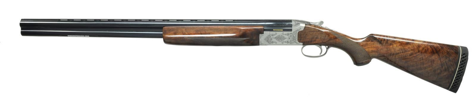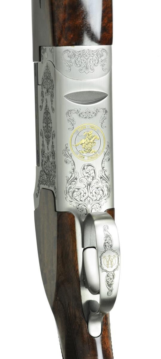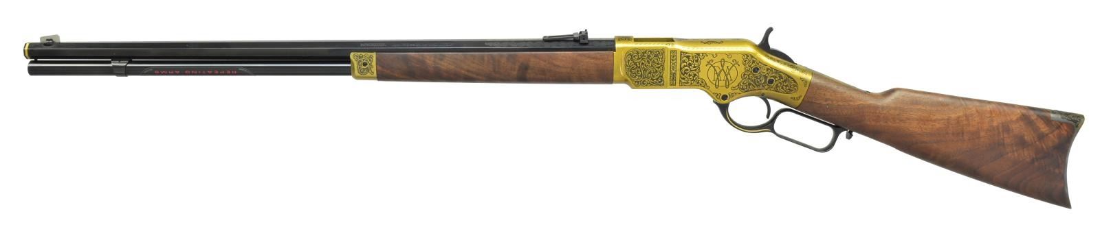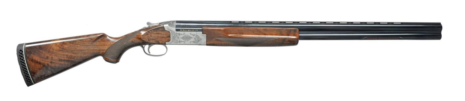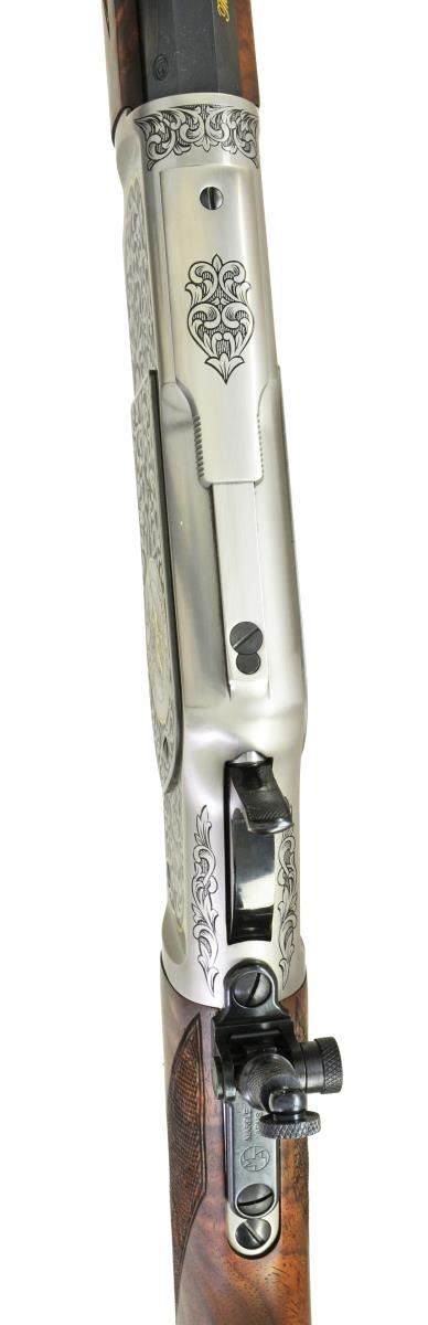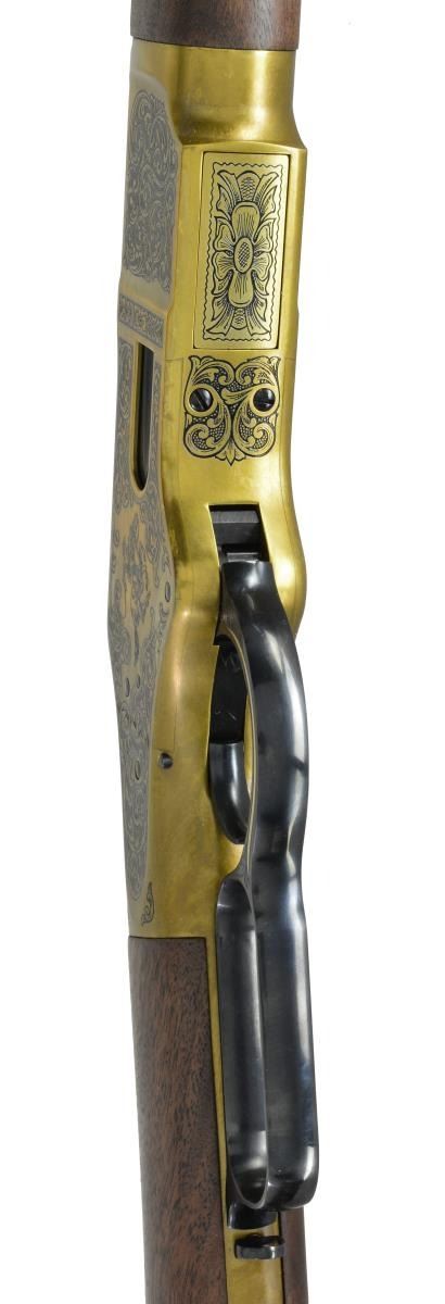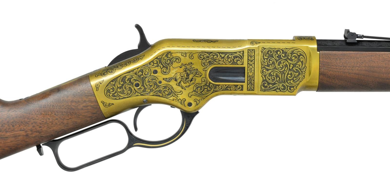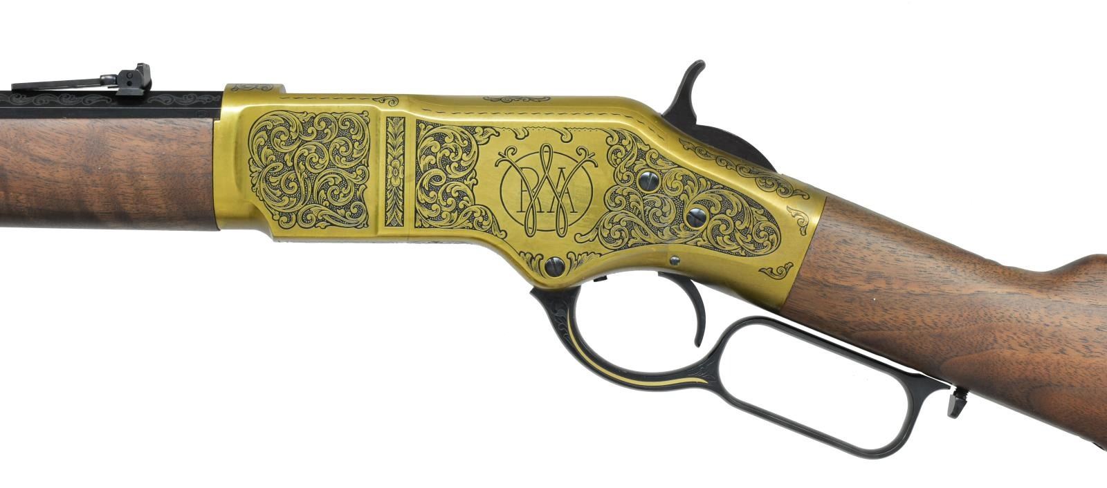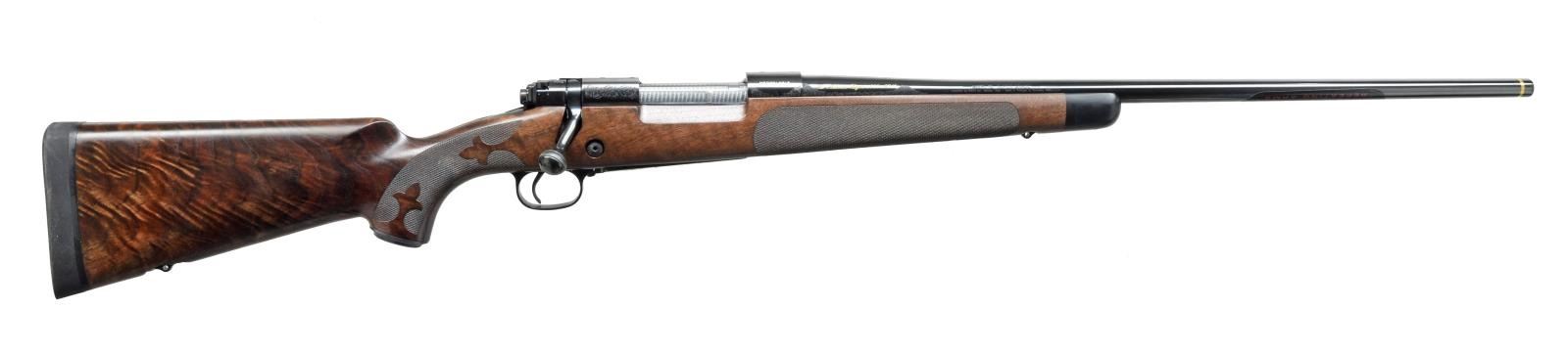 In 2016, the Winchester brand celebrated it's 150th Anniversary. To commemorate this historic milestone, five very special firearms were offered in a limited quantities. This complete set is Number 15 of 500 sets produced. Consignor supplied information from a Browning Rep. indicates that very few sets remain intact as most guns were sold individually by dealers. 1) MODEL 1866 LEVER ACTION RIFLE. Cal. 44-40. S# M662016015. Bbl. 24" tapered oct. w/ gold band at muzzle. Top flat has gold inscription "Winchester Repeating Arms 1866 - 2016". Breech end of bbl. & brass action have vine type foliate scroll ornamentation w/ punch dot style backgrounds. Right sideplate has Winchester Horse & Rider. Left sideplate has "WRA" marking. Top of receiver is marked "One of Two Hundred". Full mag. Rocky Mountain style front sight w/ graduated folding leaf rear sight. Satin finished fancy walnut forearm & stock w/ brass crescent buttplate. UNATTACHED ACCESSORIES: original box w/ decorative sleeve containing trigger lock. CONDITION: as new & unfired. (20-1891/DS). 2) MODEL 1873 LEVER ACTION RIFLE. Cal. 44-40. S# 150A730015. Bbl. 24" tapered oct. w/ gold band at muzzle. Right bbl. flat has gold inscription "The American Legend 1866 - 2016". Satin nickel receiver w/ vine type ornamentation having gold plated highlights & figures. Left side of receiver has Winchester Horse & Rider w/ markings "1866 - 2016 / 150 YEARS". Right side has gold "WRA". Features include full length mag., brass bead blade front sight w/ sporting rear sight & Marble Arms tang sight. Satin finished fancy walnut rifle stocks w/ cut checkering & crescent steel buttplate. UNATTACHED ACCESSORIES: original box w/ decorative sleeve containing trigger lock, instruction manual, safety brochure, purchase confirmation & NRA offer. CONDITION: as new & unfired. (20-1892/DS). 3) MODEL 94 LEVER ACTION RIFLE. Cal. 30-30. S# M942016015. Bbl. 24" tapered oct. w/ single gold band at muzzle. Right bbl. flat has gold inscription "The American Legend 1866 - 2016". Satin nickel colored action has vine type ornamentation w/ gold plated highlights & figures. Left side has Winchester Horse & Rider w/ markings "1866 - 2016 / 150 YEARS". Left side has gold "WRA". Features include brass bead front sight, sporting rear sight, angle eject action w/ top tang sliding safety & full mag. Satin finished walnut rifle stocks w/ crescent steel buttplate & spade pattern cut checkering. UNATTACHED ACCESSORIES: original box w/ decorative sleeve containing trigger lock, hammer extension, instruction manual, safety brochure, purchase confirmation & NRA offer. CONDITION: as new & unused. (20-1893/DS) 4) MODEL 101 O/U SHOTGUN. Cal. 12 Ga. S# 1012016015. Bbls. 28" VR w/ Invector-Plus interchangeable chokes; IC, mod. & full choke tubes included. White front bead. Satin gray finished boxlock action w/ scroll ornamentation. Bottom of receiver has gold Winchester Horse & Rider w/ marking "1866 - 2016 / 150 YEARS". Trigger guard bow has "WRA" marking. Single selective trigger. Selective ejectors. Gloss finished walnut finger groove forearm & capped pistol grip stock w/ black ventilated Winchester pad. Grip cap is engraved on bottom w/ gold line around base. UNATTACHED ACCESSORIES: original box containing spare choke tube, wrench, chamber lock, instruction manual, safety brochure & NRA offer. CONDITION: new & unfired. (20-1894/DS). 5) MODEL 70 BOLT ACTION RIFLE. Cal. 270 Win. S# M702016015. Bbl. 24" w/out sights. Right side of bbl. has gold inscription "The American Legend 1866 - 2016". Muzzle of bbl. has single gold band. Breech end of bbl. has foliate scroll matching the receiver, floorplate & trigger guard. Left side of receiver has gold "WINCHESTER". Floorplate has gold Winchester Horse & Rider w/ markings "1866 - 2016 / 150 YEARS". Trigger guard bow has gold "WRA". Steel grip cap has gold band around base w/ matching engraving. Bolt body is jeweled. Classic style cheekpiece stock of satin finished fancy walnut w/ ebony forearm tip & style A fleur de lis checkering. Stock features Supergrade style inletted 2 screw swivel bases & solid black recoil pad. UNATTACHED ACCESSORIES: original box w/ decorative sleeve containing trigger lock, instruction manual, safety brochure, purchase confirmation & NRA offer. CONDITION: as new & unused. (20-1895/DS). ALL MODERN. $20,000-30,000.