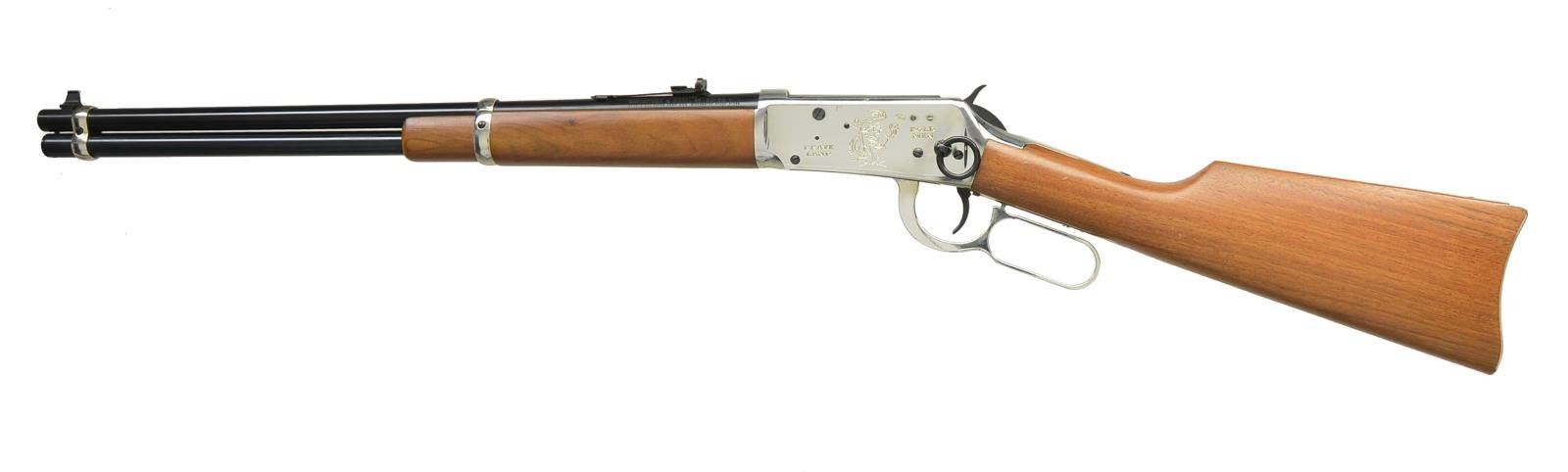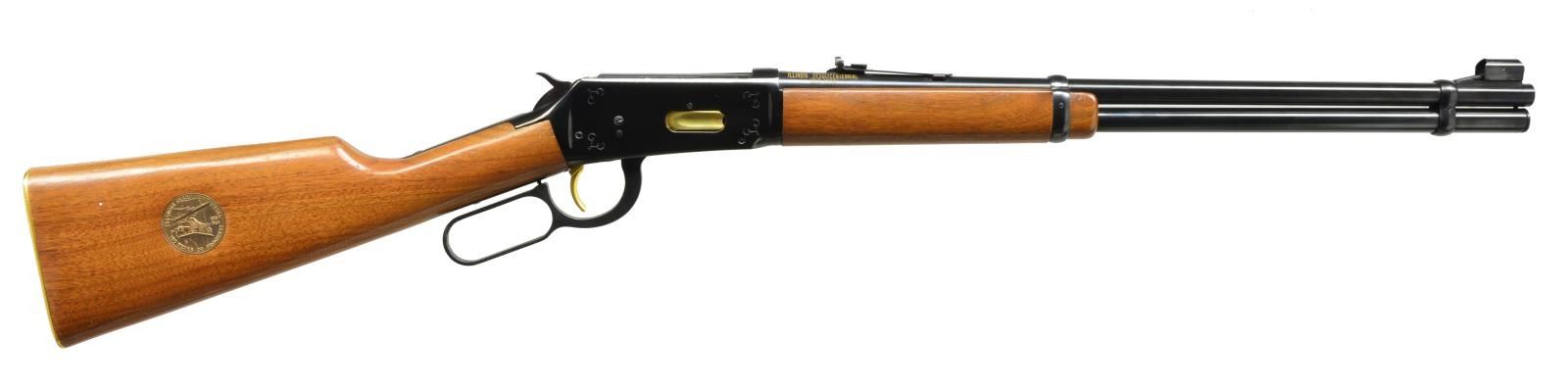 RIFLES. ALL: cal. 30-30. Bbls. 20". Full length mags. 1) 1894 COWBOY. S# CB13962. Chrome finished action, carbine buttplate, bbl. band & mag. band. Receiver features a rope & spurs on right side w/ cowboy on bucking bronco on left side w/ saddle ring & markings "Brave Land Bold Men". Long wood carbine forearm & straight grip walnut stock w/ cowboy & steer medallion on right side. 1970 Mfg. CONDITION: over 98% metal finish. Stock shows a few sm. marks. Bright near excellent bore. (20-3453/DS) MODERN (Not CURIO until Jan.1, 2021). 2) ILLINOIS SESQUICENTENNIAL1816-1968. S# IS12584. Black finished action w/ gold trigger, loading gate & saddle ring. left side of action has outline of Abraham Lincoln, w/ inscription "Land of Lincoln". Carbine forearm & straight grip stock w/ gold finished stamped steel buttplate having "150 Years of Progress" medallion on right side. CONDITION: 98% metal finish. Wood shows several sm. marks. Bright bore w/ strong rifling. (20-3456/DS). CURIO. $800-1,100.