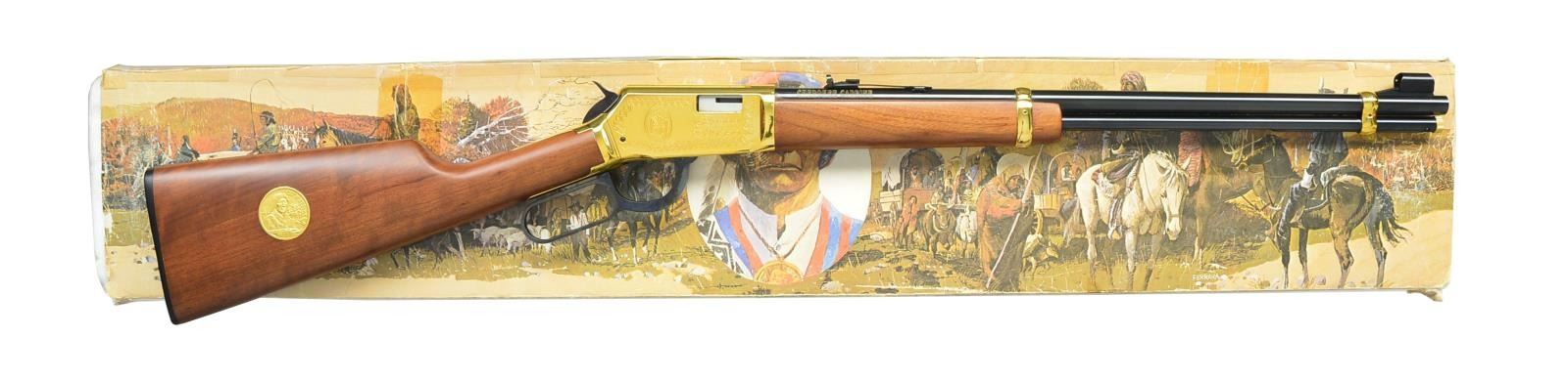 Cal. 22 S, L, LR. S# CKF3989. Bbl. 24 1/2" w/ sporting sights. Gold finished bbl. bands, buttplate & action. Right side of action features a Cherokee Indian in native garb. Left side of action shows Indian & oxen drawn wagon w/ inscription "TRAIL OF TEARS - 1839". Right side of bbl. has gold lettering "CHEROKEE CARBINE". Satin finished walnut forearm & carbine stock. Stock has gold Cherokee medallion on right side. Limited Edition of 3,950 were produced in 1978 for Canadian sales. UNATTACHED ACCESSORIES: foam box w/ decorative sleeve containing instruction manual & warranty papers. Sleeve shows some tattering. CONDITION: rifle appears unused retaining over 99% metal finish. Forearm has 1 deep dent at bottom. (20-3960/DS) MODERN. $800-1,200.