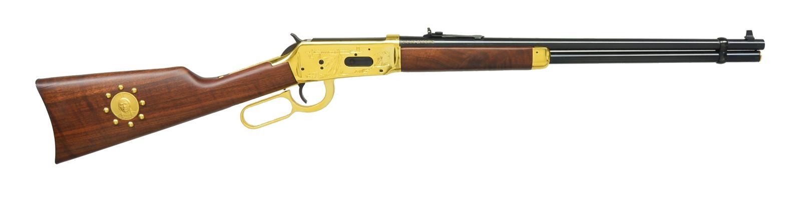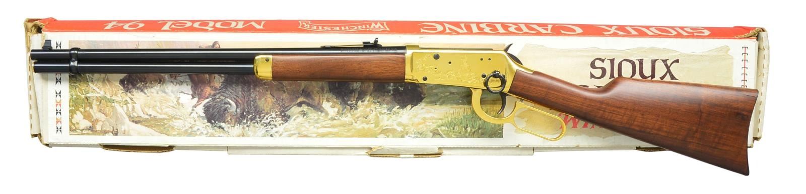 Cal. 30-30. S# SU11741. Bbl. 20" w/ sporting sights. Gold finished action features peace pipe, buffalo & teepees on right side w/ Indian warrior on left side. Gold finished forearm cap. Satin finished walnut carbine stocks. Right side of stock has gold medallion w/ portrait of Sioux warrior surrounded by 8 brass tacks. Limited Edition of 12,000 made for Canadian sale in 1976 in conjunction w/ the Little Big Horn Centennial carbine. UNATTACHED ACCESSORIES: original box w/ buffalo hunting scene on lid. Box contains instruction booklet, hunter's pocket guide & service center pamphlet. CONDITION: near new retaining over 99% metal finish has light levering marks. (20-3958/DS). CURIO. $600-900.