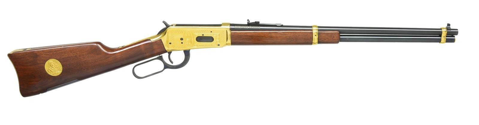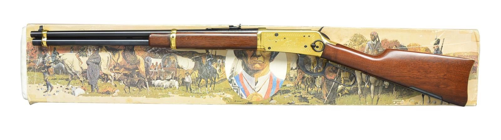 Cal. 30-30. S# CK09022. Bbl. 20" w/ sporting sights. Gold finished bbl. bands, buttplate & action. Right side of action features a Cherokee Indian in native garb. Left side of action shows Indian & oxen drawn wagon w/ inscription "TRAIL OF TEARS - 1839". Right side of bbl. has gold lettering "CHEROKEE CARBINE". Satin finished walnut forearm & carbine stock. Stock has blued steel cartridge trap in toeline w/ gold Cherokee medallion on right side. Limited Edition of 9,000 were produced in 1978 for Canadian sales. UNATTACHED ACCESSORIES: foam lined box w/ decorative sleeve containing instruction manual, hang tag & purchase card. Sleeve shows some tears & tattering. CONDITION: over 97% metal finish showing levering wear. Stock shows scattered handling marks. Near excellent bore. (20-3954/DS). MODERN. $500-750.