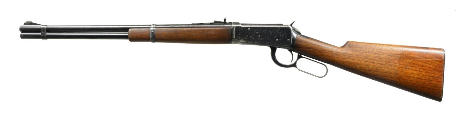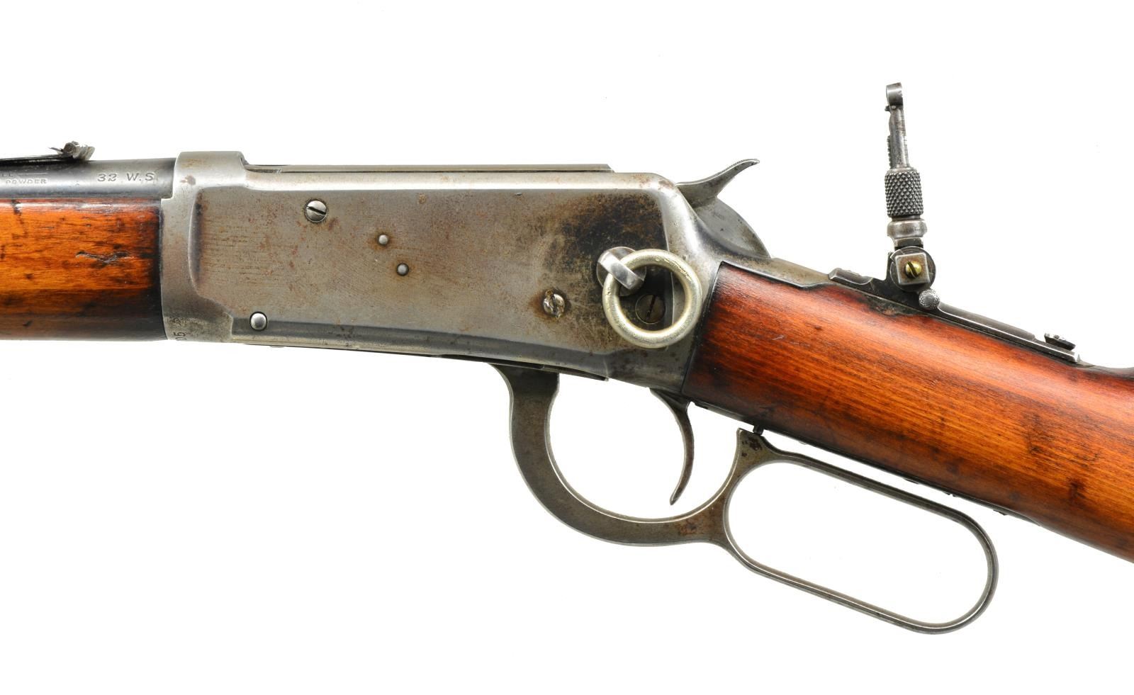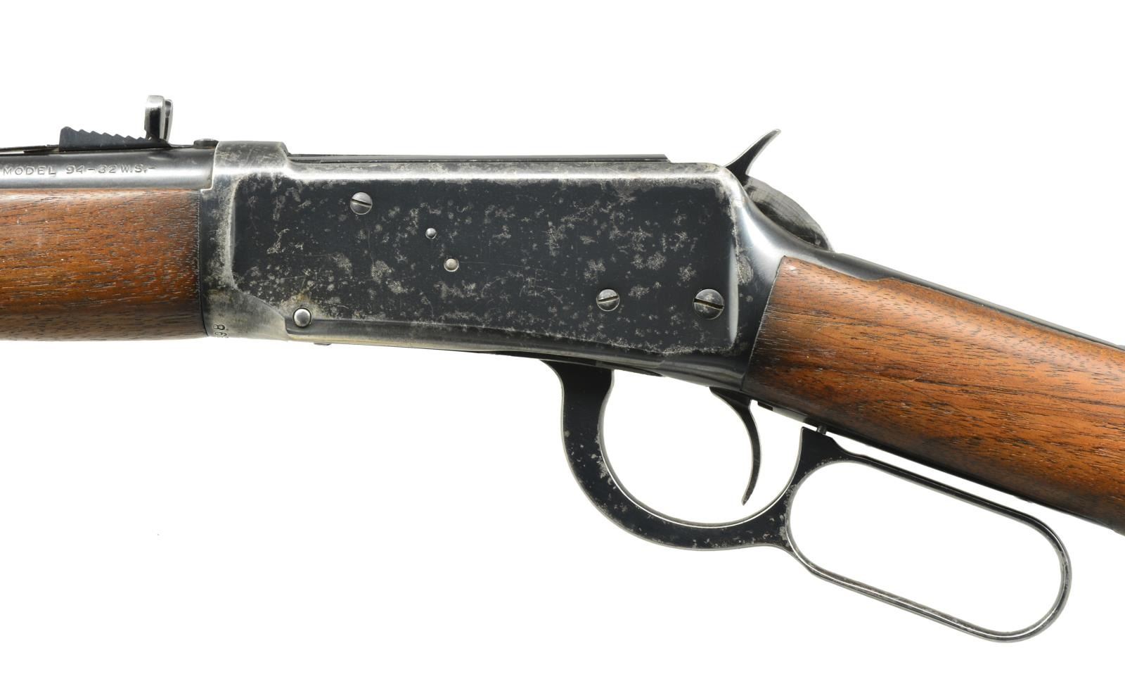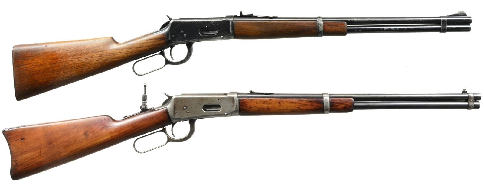 BOTH: cal. 32 WS. 1) 94 FLAT BAND CARBINE. S# 1383398. Bbl. 20" w/ ramp mounted bead front sight & replacement elevator adj. semi buckhorn rear sight. Full length mag. w/ flat band that was used during the WWII time period. Longwood walnut forearm & straight grip stock w/ checkered steel buttplate. CONDITION: over 75% lightly faded original blue w/ scattered areas of finish loss & light pitting on receiver, bbl. & mag. tube. Wood has dark worn appearance showing scratches & marks. Sound mechanics. Bright bore w/ sharp rifling. (20-2306/DS). 2) 1894 SRC. S# 488705. Bbl. 20" w/ pinned blade front sight, express rear & combination tang sight. Full length mag. Left side of action has saddle ring. Long style gumwood forearm & straight grip carbine stock w/ carbine buttplate. Mfg. 1909. CONDITION: bbl. & mag. tube retain 40% dull fading blue. Action has traces of blue in protected areas w/ balance fading to gray showing scattered corrosion. Sanded & refinished wood showing dents & handling marks. Stock has long crack extending into left side from top tang. Good mechanics. Dark worn bore. (20-2312/DS). BOTH CURIO. $700-1,000.