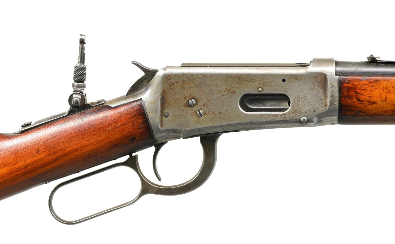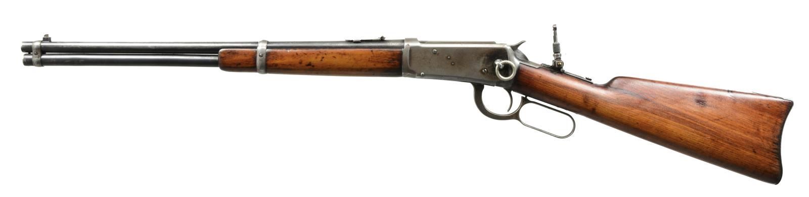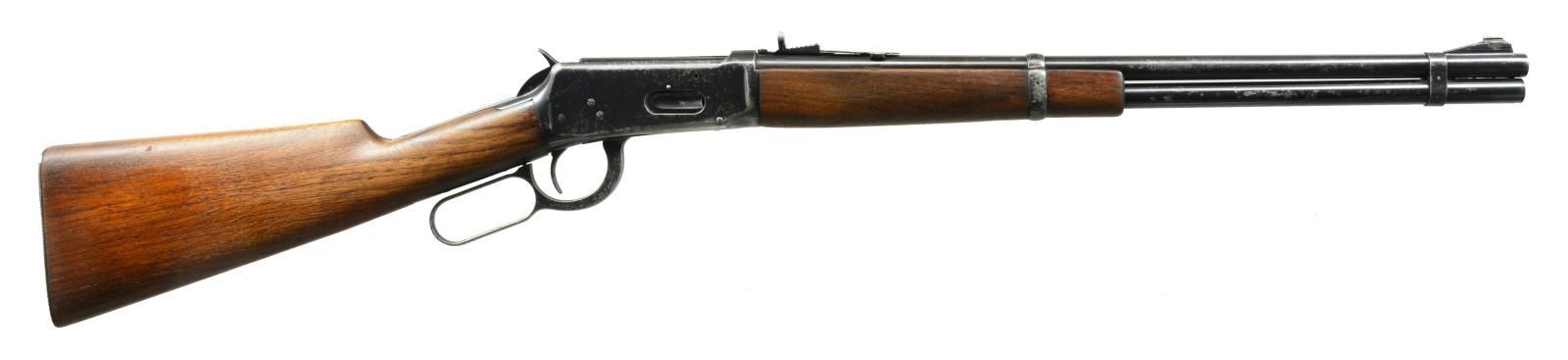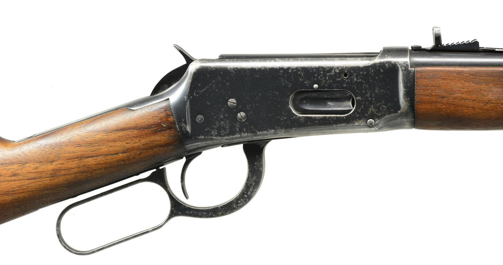 BOTH: cal. 32 WS. 1) 94 FLAT BAND CARBINE. S# 1383398. Bbl. 20" w/ ramp mounted bead front sight & replacement elevator adj. semi buckhorn rear sight. Full length mag. w/ flat band that was used during the WWII time period. Longwood walnut forearm & straight grip stock w/ checkered steel buttplate. CONDITION: over 75% lightly faded original blue w/ scattered areas of finish loss & light pitting on receiver, bbl. & mag. tube. Wood has dark worn appearance showing scratches & marks. Sound mechanics. Bright bore w/ sharp rifling. (20-2306/DS). 2) 1894 SRC. S# 488705. Bbl. 20" w/ pinned blade front sight, express rear & combination tang sight. Full length mag. Left side of action has saddle ring. Long style gumwood forearm & straight grip carbine stock w/ carbine buttplate. Mfg. 1909. CONDITION: bbl. & mag. tube retain 40% dull fading blue. Action has traces of blue in protected areas w/ balance fading to gray showing scattered corrosion. Sanded & refinished wood showing dents & handling marks. Stock has long crack extending into left side from top tang. Good mechanics. Dark worn bore. (20-2312/DS). BOTH CURIO. $700-1,000.