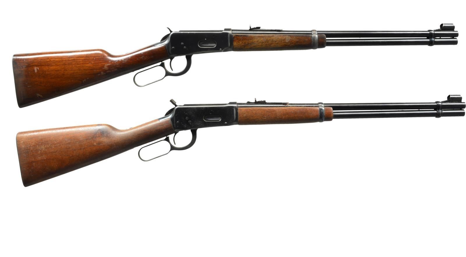 CARBINES. ALL: cal. 30-30. Bbls. 20" w/ ramp mounted bead front sight & sporting rear sights. Full length mags. Short wood walnut forearms & straight grip stocks w/ checkered steel buttplates. 1) S# 2344528. Aftermarket Williams hammer extension. 1958 Mfg. CONDITION: 80% blue showing large areas of red rust & surface corrosion. Left side of receiver has 3 added holes for scope mt. attachment. Wood has worn finish showing scratches, handling marks & mildew spots. Bore retains sound rifling. (20-2652/DS). 2) S# 2495430. 1961 Mfg. CONDITION: 80% blue showing edge wear & sm. spots of freckling. Stock has worn & blistering finish showing scratches & marks. Bright bore w/ strong rifling. (20-2654/DS). ALL CURIO. $600-900.