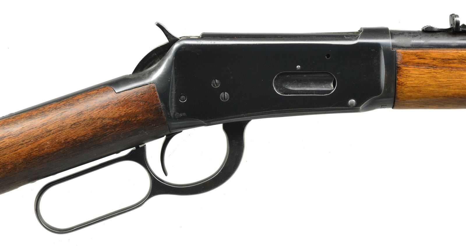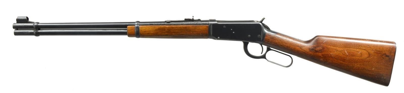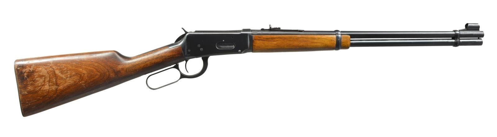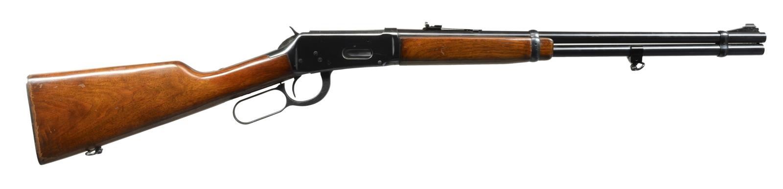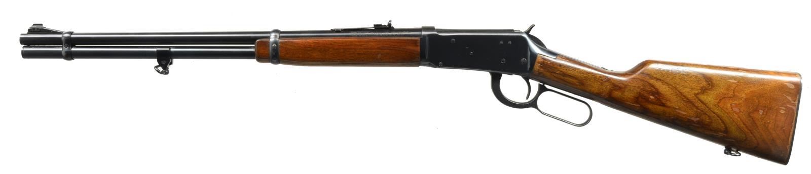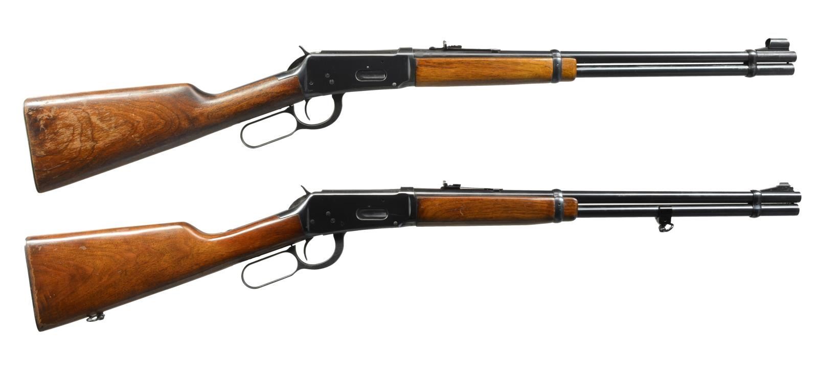 CARBINES. ALL: cal. 30-30. Bbls. 20". Ramp mounted bead front sights & sporting rear sights. Full length mags. Short wood forearms w/ straight grip walnut stocks having checkering steel buttplates. 1) S# 1870501. Hooded front sight. 1952 Mfg. CONDITION: 80% lightly worn blue. Wood has worn & peeling finish showing scratches & marks. Bright bore retains strong rifling. (20-2822/DS). 2) S# 2592755. Band mounted front swivel & added rear swivel on stock. 1963 Mfg. CONDITION: over 95% blue showing light edge wear & sm. marks. Wood has areas of blistering & peeling finish showing scratches & marks. Bright bore w/ strong rifling. (20-2823/DS). ALL CURIO. $600-900.