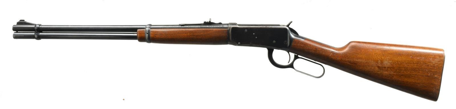CARBINES. ALL: bbls. 20" w/ ramp mounted bead front sights & sporting rear sights. Full length mags. Short wood walnut forearms w/ straight grip walnut stocks having checkered steel buttplates. 1) Cal. 30-30. S# 1982333. 1953 Mfg. CONDITION: 80% lightly worn blue showing spots of corrosion & pitting left side of bbl. & mag. tube have a sm. area of abrasive cleaning. Stock has lightly worn finish w/ spots of peeling, scratches & marks. Bright bore w/ lightly worn rifling. (20-2825/DS). 2) Cal. 32 WS. S# 1862012. WWII Era mfg. CONDITION: 75% lightly worn blue showing spots of corrosion. Wood has worn & peeling finish showing scratches & marks. Bore is bright w/ strong rifling. (20-2826/DS). ALL CURIO. $600-900.