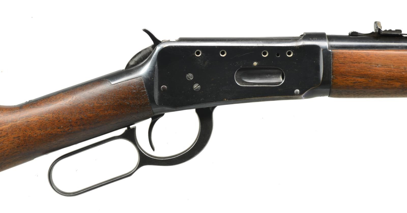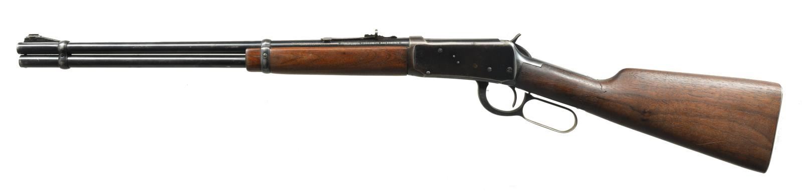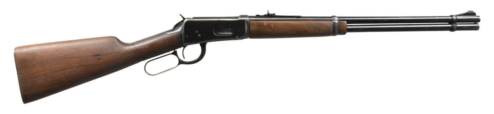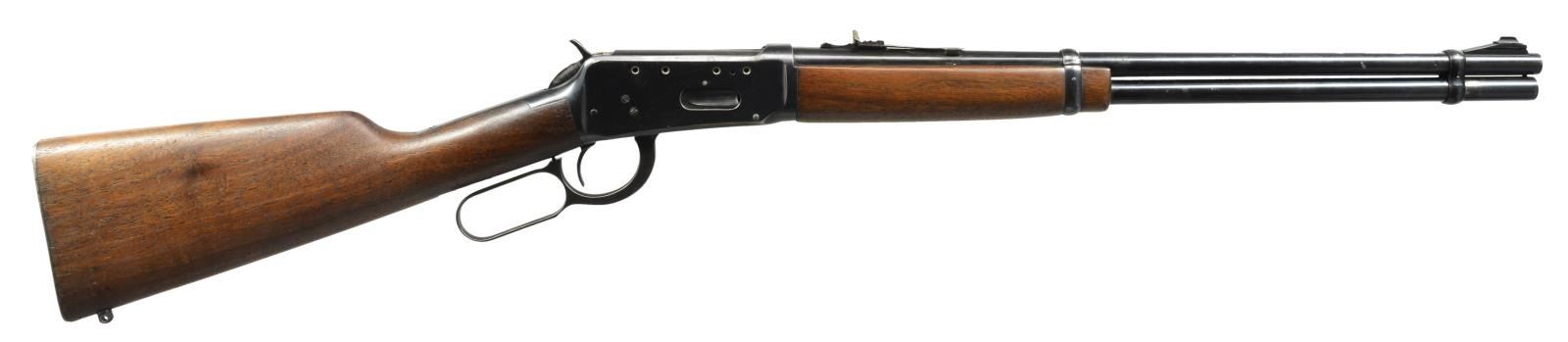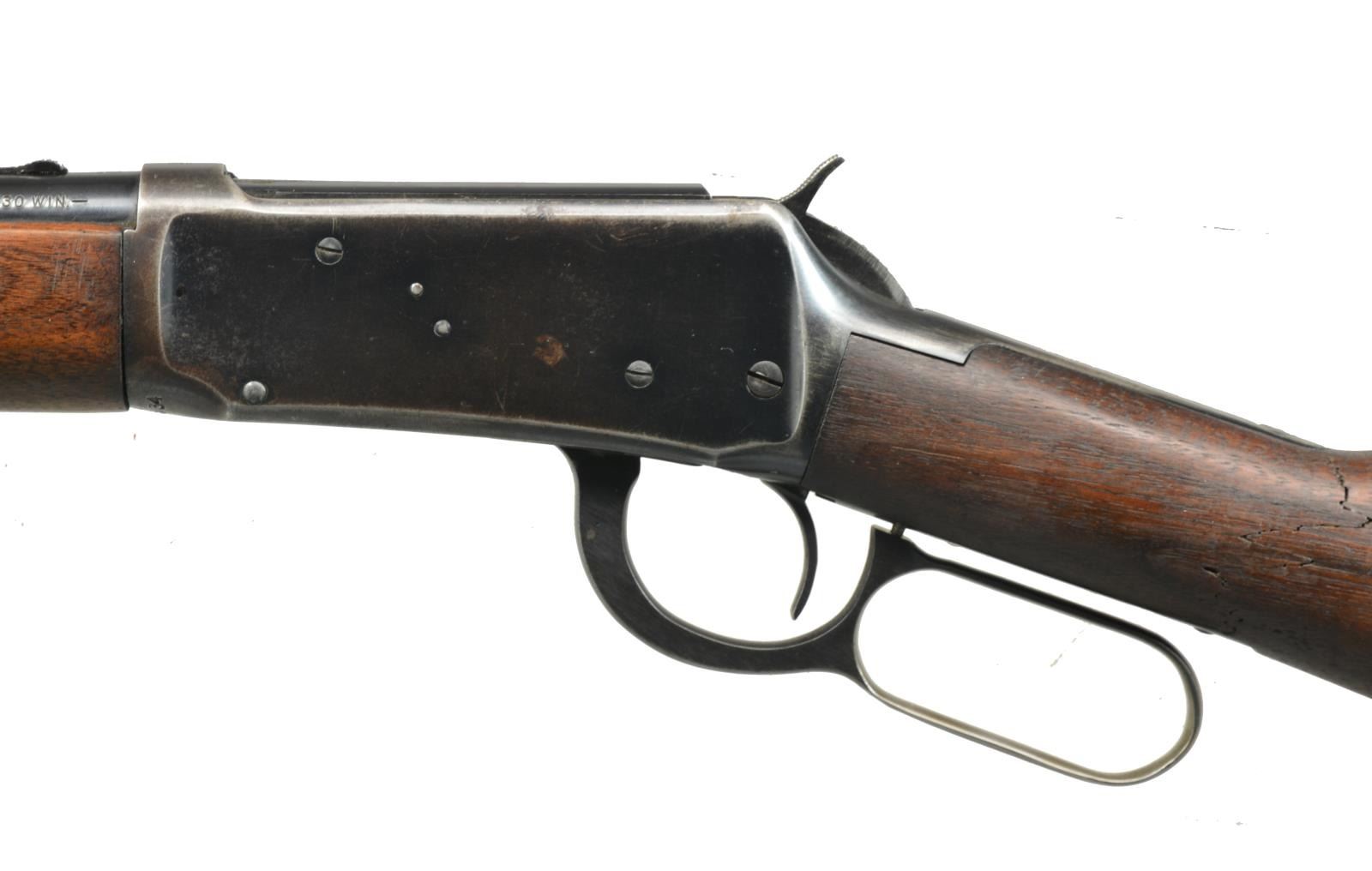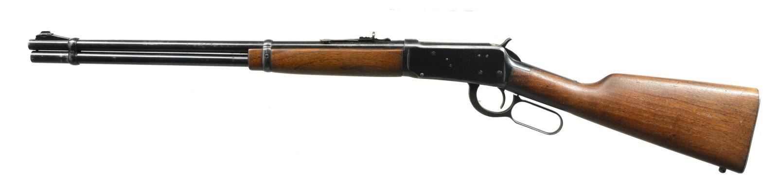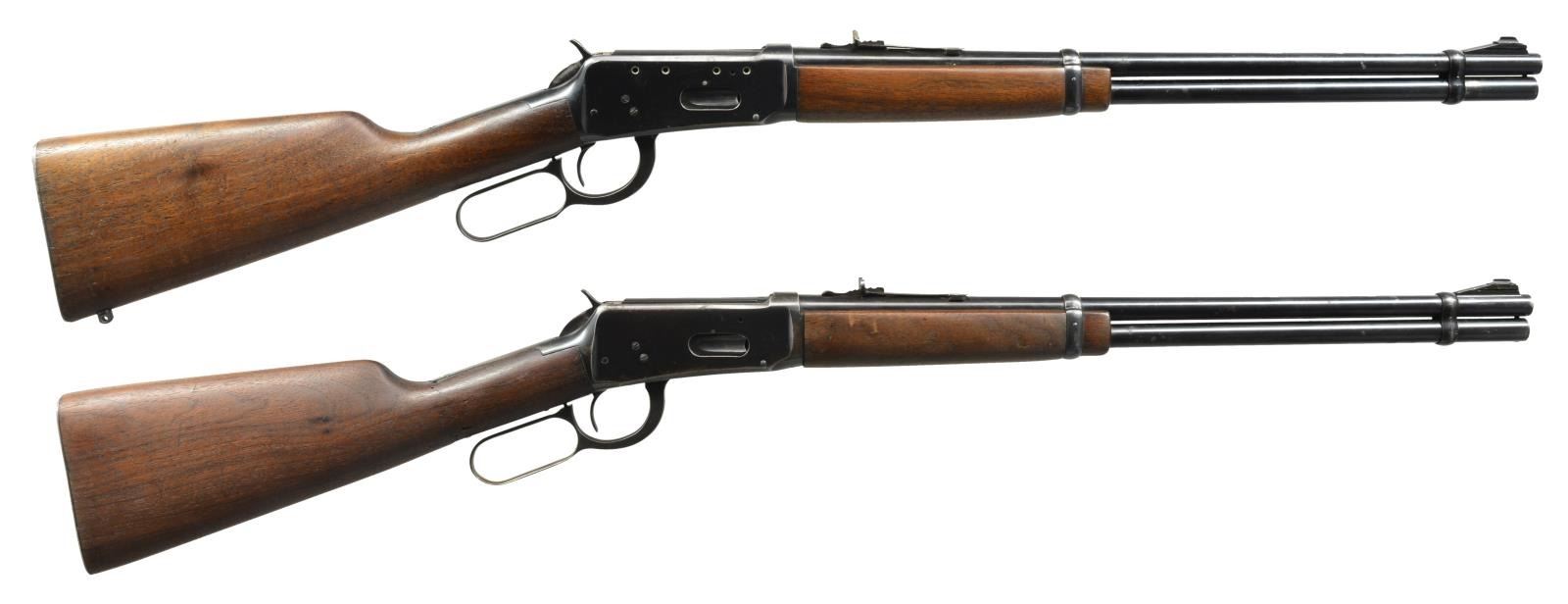 CARBINES. ALL: cal. 30-30. Bbls. 20" w/ ramp mounted bead front sights & sporting rear sights. Full length mags. Short wood walnut forearms w/ straight grip walnut stocks having checkered steel buttplates. 1) S# 2212813. 1956 Mfg. CONDITION: 80% lightly faded blue. Left side of receiver has 4 added open holes for scope mt. attachment. Wood has worn finish showing scratches & handling marks. Toeline has added swivel base. Bright bore w/ strong rifling. (20-2814/DS). 2) S# 1822334. 1952 Mfg. CONDITION: bbl. & mag. tube retain 80% blue showing spots of surface corrosion. Action retains 60% dull fading blue showing spots of corrosion. Sanded & refinished wood shows scratches & handling marks. Stock is broken & glued through wrist. Bore shows lightly worn rifling. (20-2829/DS). ALL CURIO. $500-800.