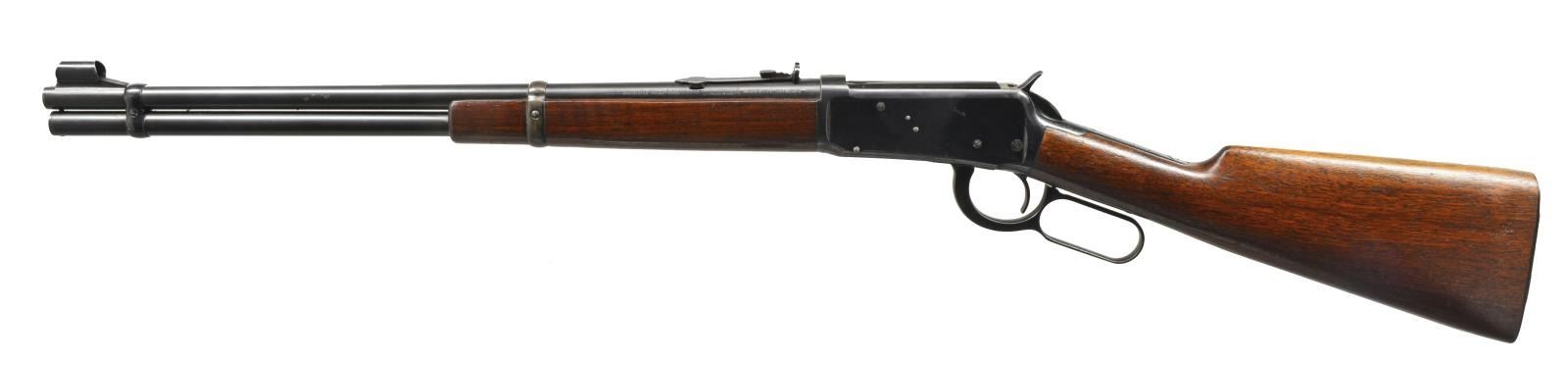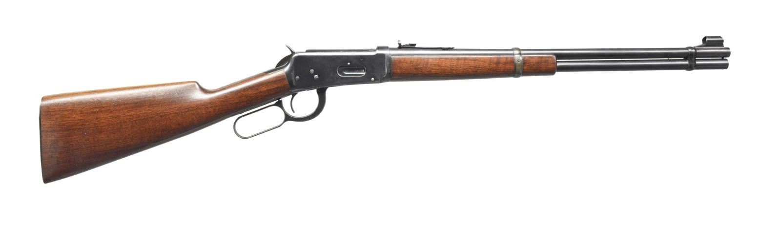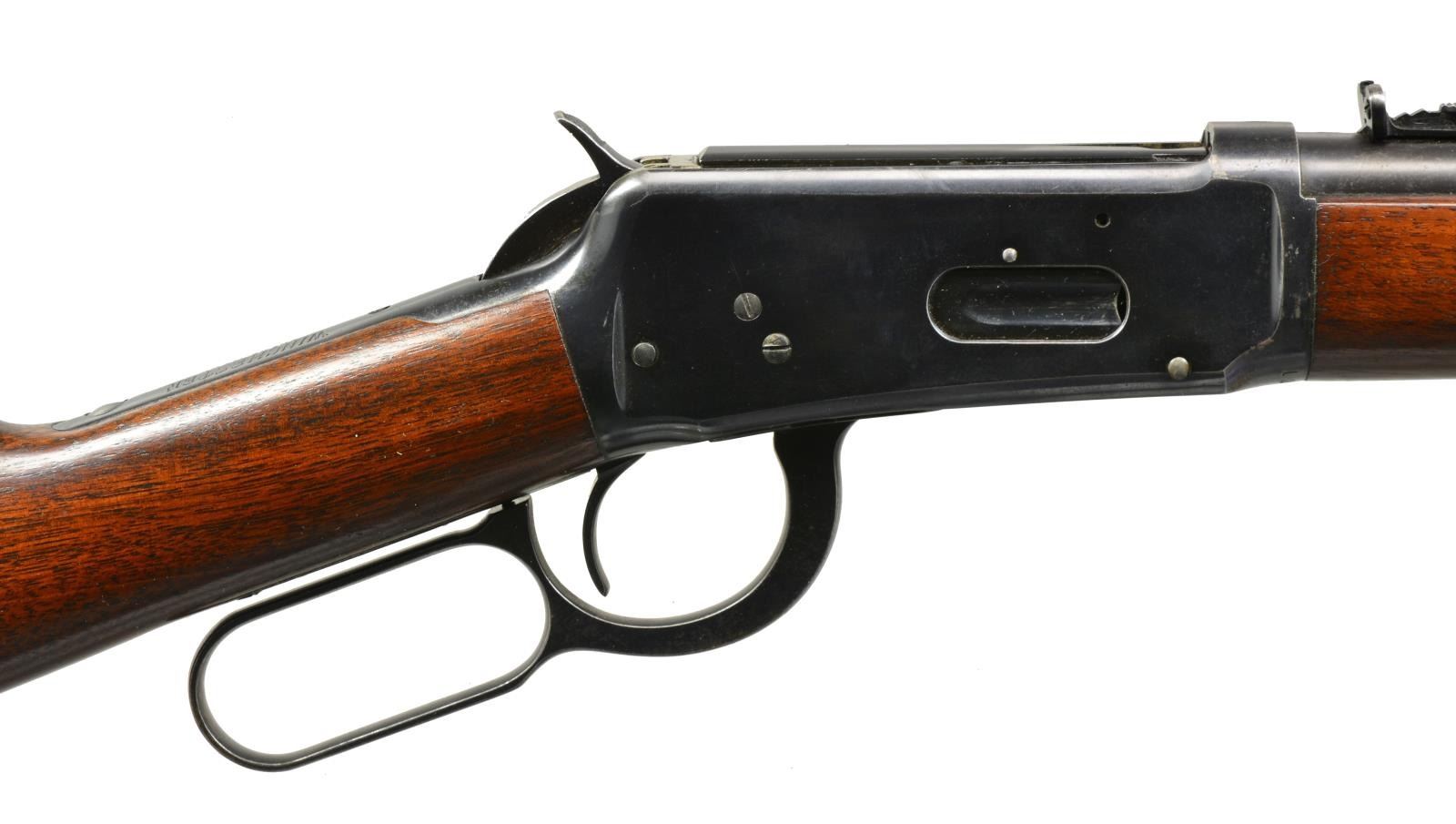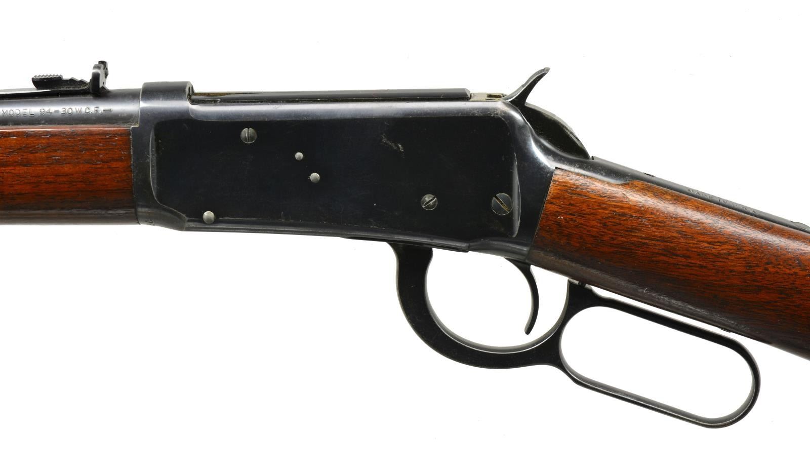 Cal. 30 WCF. S# 1247080. Bbl. 20" w/ ramp mounted hooded bead front sight & elevator adj. sporting rear sight. Full length mag. Blue finish. Longwood walnut forearm & straight grip stock w/ Pre WWII style grooved steel buttplate. CONDITION: over 90% lightly worn blue showing edge wear & spots of freckling. Unsanded stocks have light coat of added finish. Bright near excellent bore. (20-1623/DS). CURIO. $350-550.
