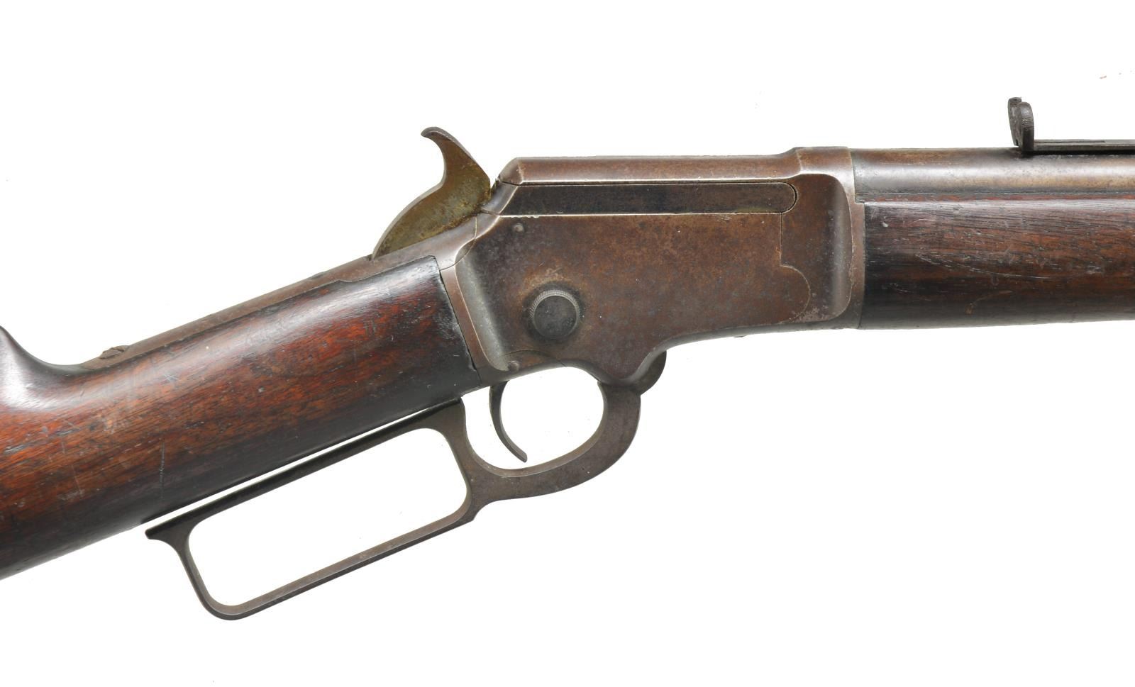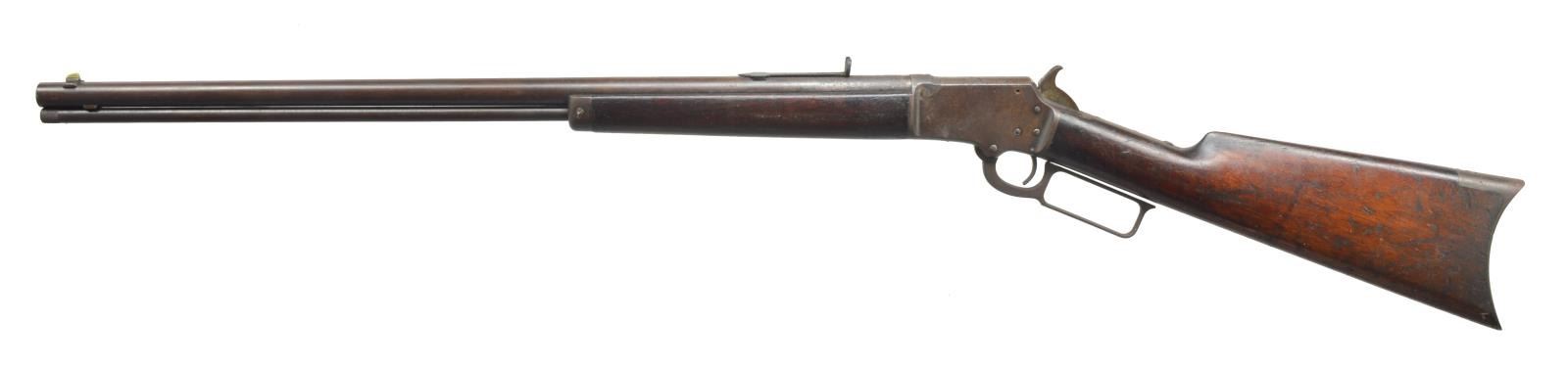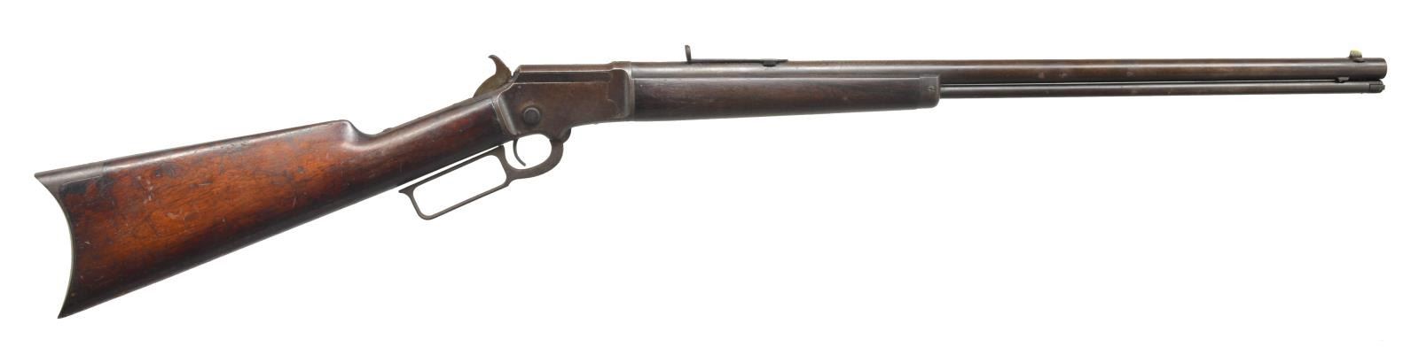 Cal. 22 RF. S# 75314. Bbl. 24" rnd. w/ sporting sights. Tube loaded full length mag. 2 Piece trigger & sear. Top of receiver is marked "Marlin Safety". Top tang is unmarked. Walnut forearm & straight grip stock w/ crescent steel buttplate. Approx. 18,650 mfg. 1891-1897. CONDITION: metal finish has faded to brown showing scattered pitting & surface corrosion. Missing rear sight elevator. Wood has dark worn appearance w/ scattered dents & marks. Dark bore w/ worn rifling having a light ring a few inches from muzzle. (01-18531/DS). ANTIQUE. $500-750.