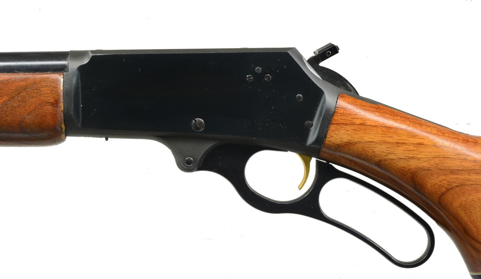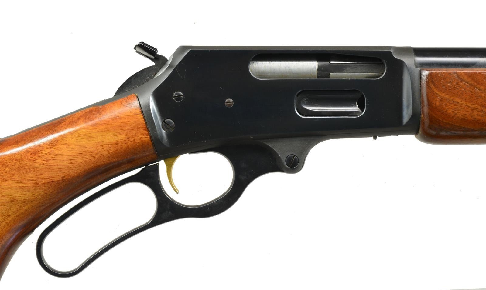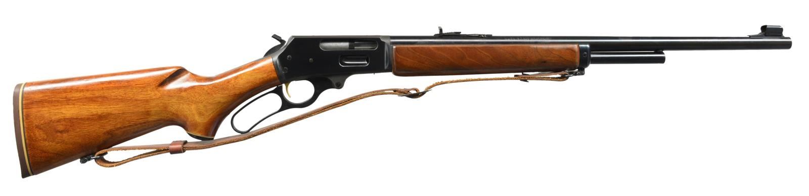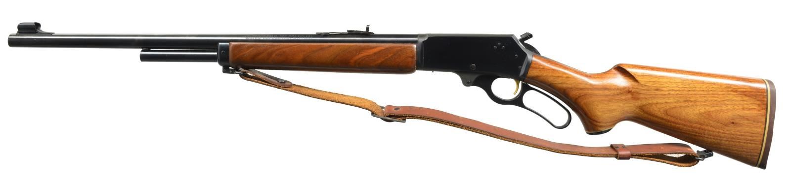 Cal. 444 Marlin. S# 19016274. Bbl. 22" rnd. w/ Micro-groove rifling. Hooded ramp bead front sight & folding leaf elevator adj. rear sight. Blue finish w/ gold finished trigger & hammer extension. Walnut forearm & hard rubber capped pistol grip stock w/ original Marlin rifle buttplate. Original Marlin leather sling on QD swivels. CONDITION: 98% blue showing sm. scratches. Very good wood finish. Forearm shows a spot of lifting finish forward of receiver. Bright near excellent bore. (20-2644/DS). MODERN. $500-800.